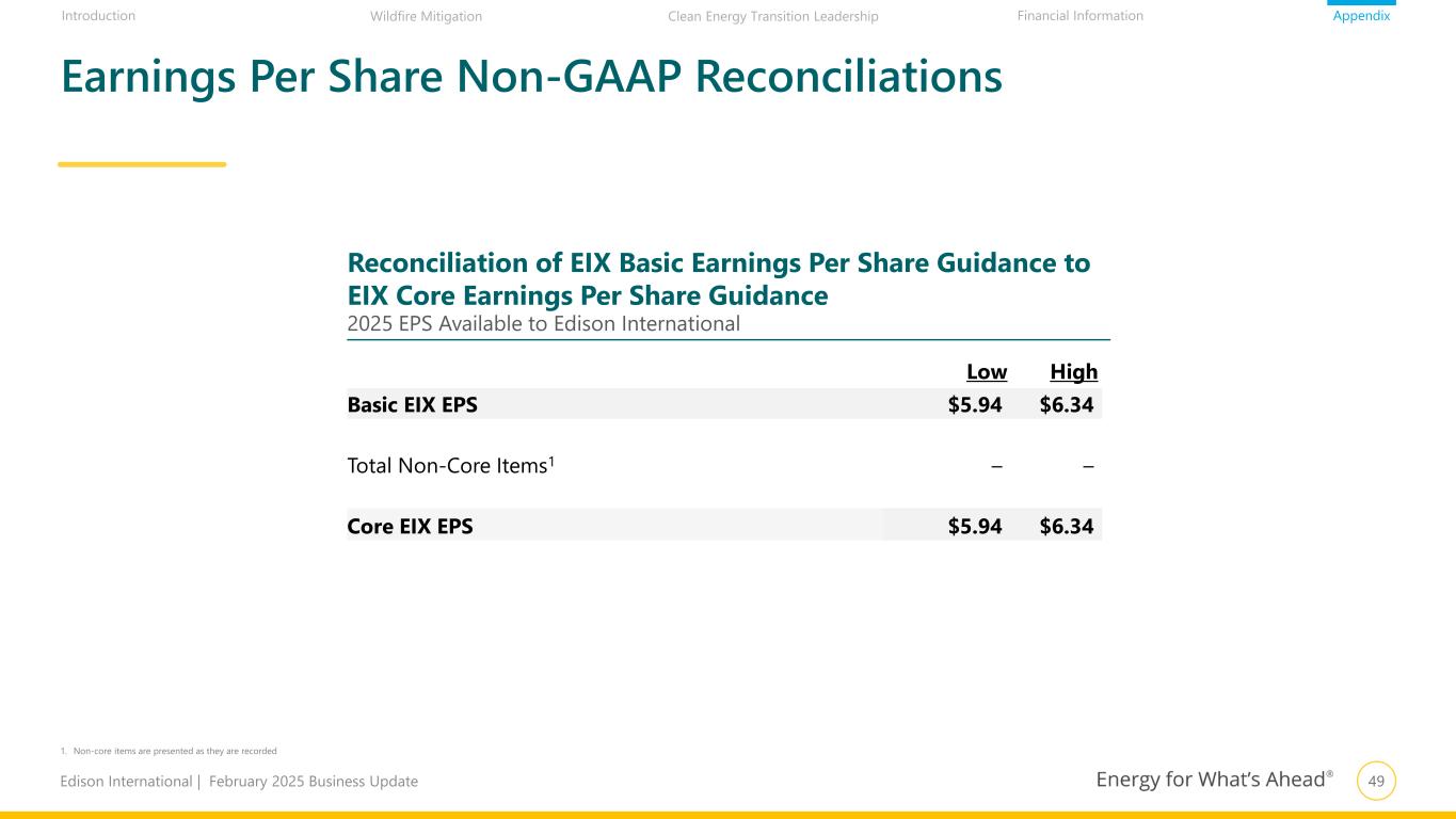 49Edison International | February 2025 Business Update AppendixIntroduction Financial InformationClean Energy Transition LeadershipWildfire Mitigation Low High Basic EIX EPS $5.94 $6.34 Total Non-Core Items1 – – Core EIX EPS $5.94 $6.34 1. Non-core items are presented as they are recorded Earnings Per Share Non-GAAP Reconciliations Reconciliation of EIX Basic Earnings Per Share Guidance to EIX Core Earnings Per Share Guidance 2025 EPS Available to Edison International