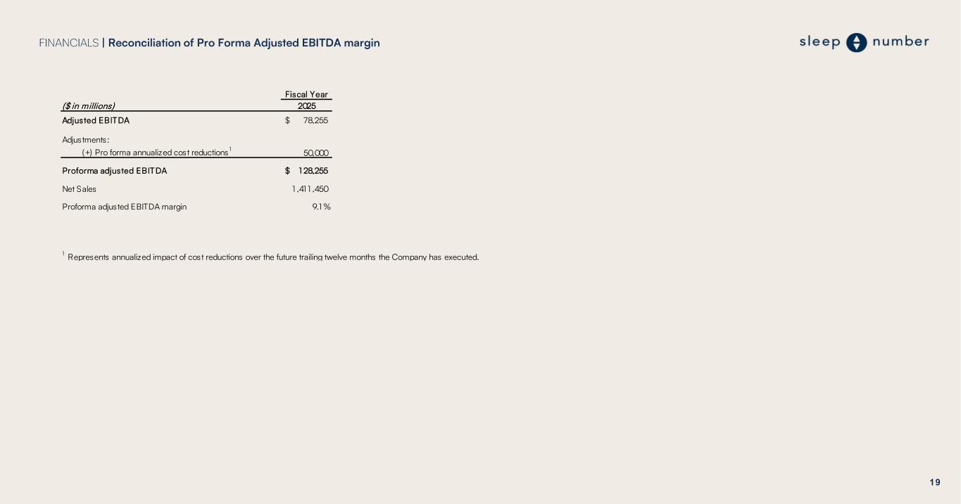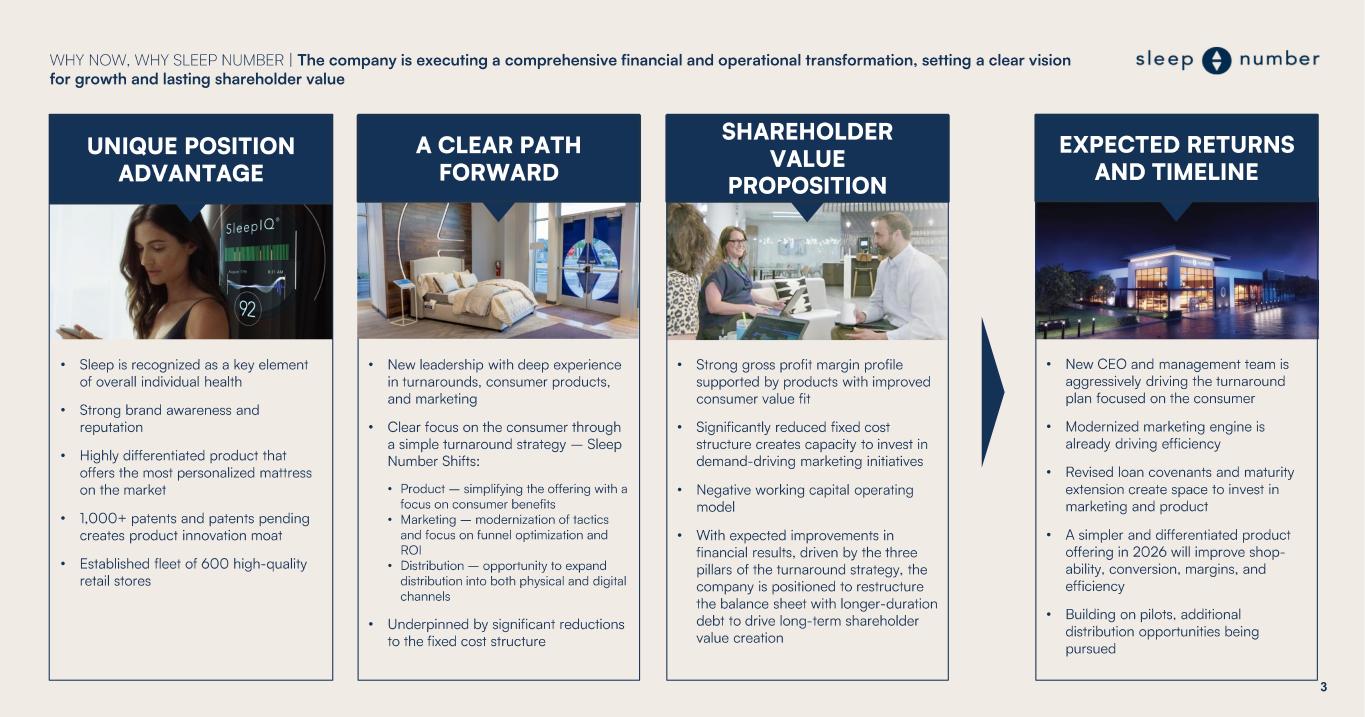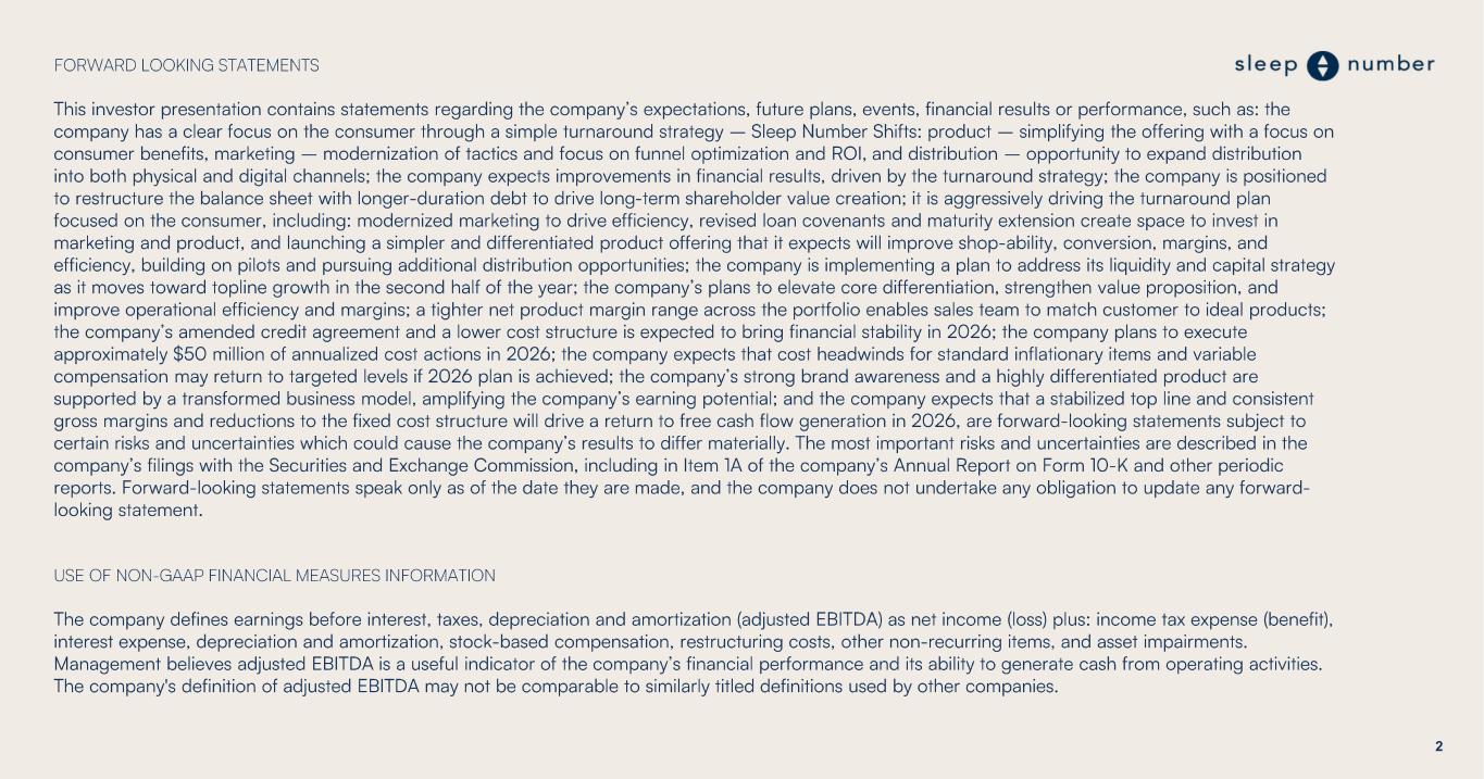 This investor presentation contains statements regarding the company’s expectations, future plans, events, financial results or performance, such as: the company has a clear focus on the consumer through a simple turnaround strategy – Sleep Number Shifts: product – simplifying the offering with a focus on consumer benefits, marketing – modernization of tactics and focus on funnel optimization and ROI, and distribution – opportunity to expand distribution into both physical and digital channels; the company expects improvements in financial results, driven by the turnaround stra tegy; the company is positioned to restructure the balance sheet with longer - duration debt to drive long - term shareholder value creation; it is aggressively dri ving the turnaround plan focused on the consumer, including: modernized marketing to drive efficiency, revised loan covenants and maturity extension c reate space to invest in marketing and product, and launching a simpler and differentiated product offering that it expects will improve shop - ability, co nversion, margins, and efficiency, building on pilots and pursuing additional distribution opportunities; the company is implementing a plan to addr ess its liquidity and capital strategy as it moves toward topline growth in the second half of the year; the company’s plans to elevate core differentiation, streng then value proposition, and improve operational efficiency and margins; a tighter net product margin range across the portfolio enables sales team to mat ch customer to ideal products; the company’s amended credit agreement and a lower cost structure is expected to bring financial stability in 2026; the compa ny plans to execute approximately $50 million of annualized cost actions in 2026; the company expects that cost headwinds for standard inflationa ry items and variable compensation may return to targeted levels if 2026 plan is achieved; the company’s strong brand awareness and a highly differ entiated product are supported by a transformed business model, amplifying the company’s earning potential; and the company expects that a stabili zed top line and consistent gross margins and reductions to the fixed cost structure will drive a return to free cash flow generation in 2026, are forwar d- looking statements subject to certain risks and uncertainties which could cause the company’s results to differ materially. The most important risks and un cer tainties are described in the company’s filings with the Securities and Exchange Commission, including in Item 1A of the company’s Annual Report on Form 10 - K and other periodic reports. Forward - looking statements speak only as of the date they are made, and the company does not undertake any obligation t o update any forward - looking statement. USE OF NON -GAAP FINANCIAL MEASURES INFORMATION The company defines earnings before interest, taxes, depreciation and amortization (adjusted EBITDA) as net income (loss) plu s: income tax expense (benefit), interest expense, depreciation and amortization, stock - based compensation, restructuring costs, other non - recurring items, and a sset impairments. Management believes adjusted EBITDA is a useful indicator of the company’s financial performance and its ability to generate cas h from operating activities. The company's definition of adjusted EBITDA may not be comparable to similarly titled definitions used by other companies. FORWARD LOOKING STATEMENTS 2