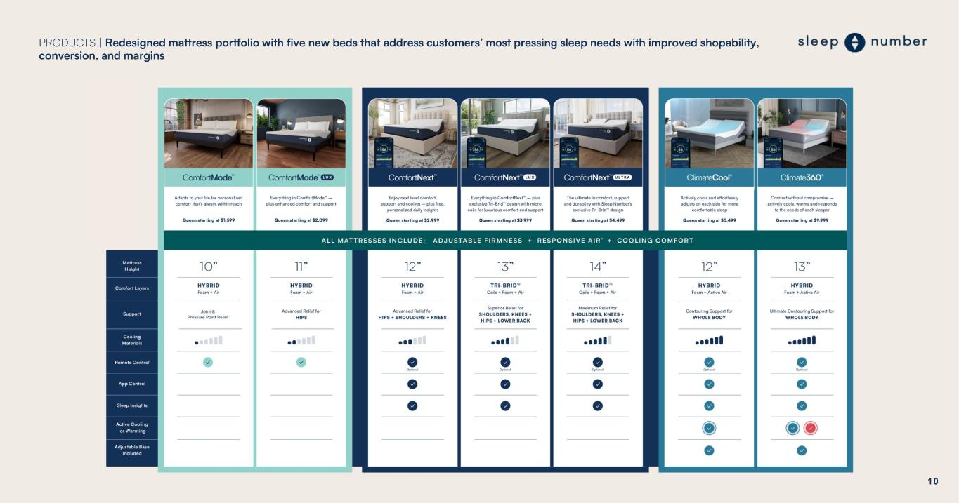 PRODUCTS | Creating product value fit and expanding total addressable market 9 • Beginning in early 2026, we have refreshed our offerings to deliver what consumers want most – comfort, value and durability • Leveraging extensive IP and staying true to core differentiators , while building value for those new to the brand • Moving quickly to take advantage of improved supply chain efficiency and simplified service , all at a long - term attractive margin across the portfolio Product Commitments Strengthen Value Proposition • Rationalize bed and base SKUs to simplify the offering for improved ease of shopping and focus on a broader TAM • Expand sub - $3K portfolio with compelling non - smart bed and base options • Leverage digital assets and sleep expertise to strengthen customer value across price points Deliver superior value across all price points to re - energize demand Improve Margins ▪ Improve net product margins through smarter design, sourcing and promotional discipline ▪ While net product margins differ, a tighter margin range across the portfolio enables sales team to match customer to ideal product ▪ Refocus portfolio on proven, high - performing SKUs and remove tail products ▪ Design for manufacturability and serviceability, reducing supply chain and service complexity Design for improved operational efficiency and margin uplift Elevate Core Differentiation Retain leadership and differentiation through customer - centered sleep innovation • Get credit for core differentiator of personalized comfort adjustability (air technology) • Offer market - leading adjustability, smart technology, and temperature solutions that solve most pressing sleep needs, encouraging consumer step up • Deliver innovation that improves health through better sleep