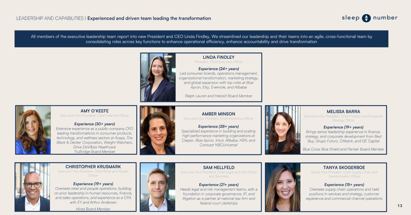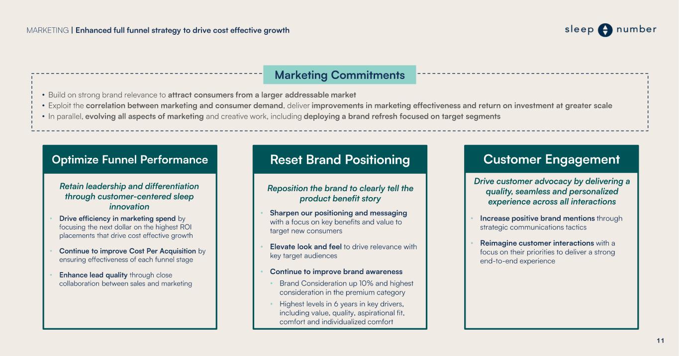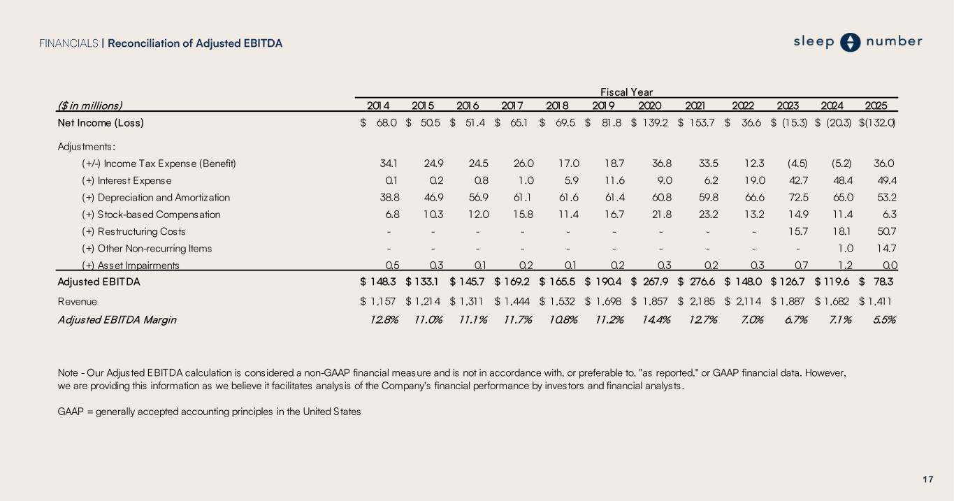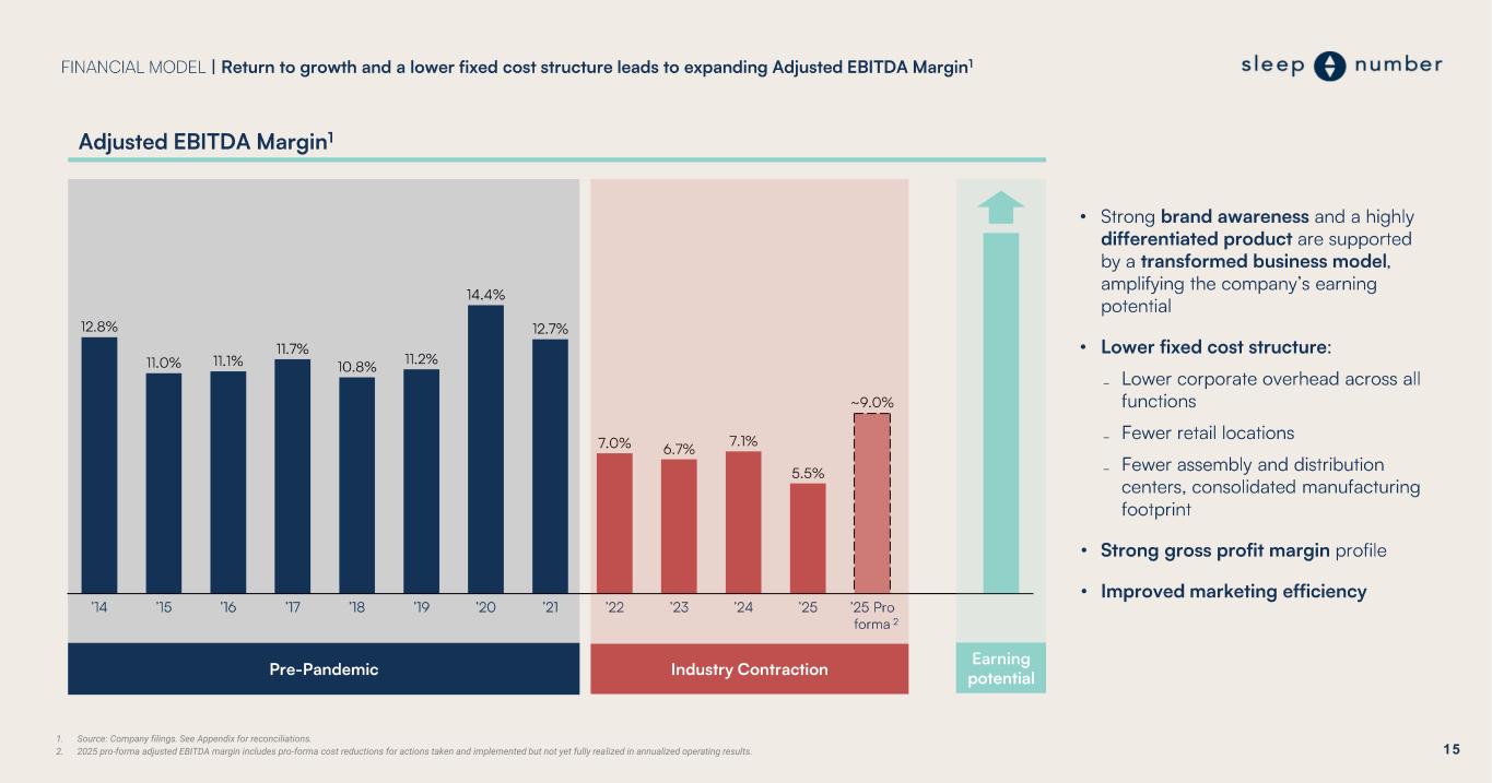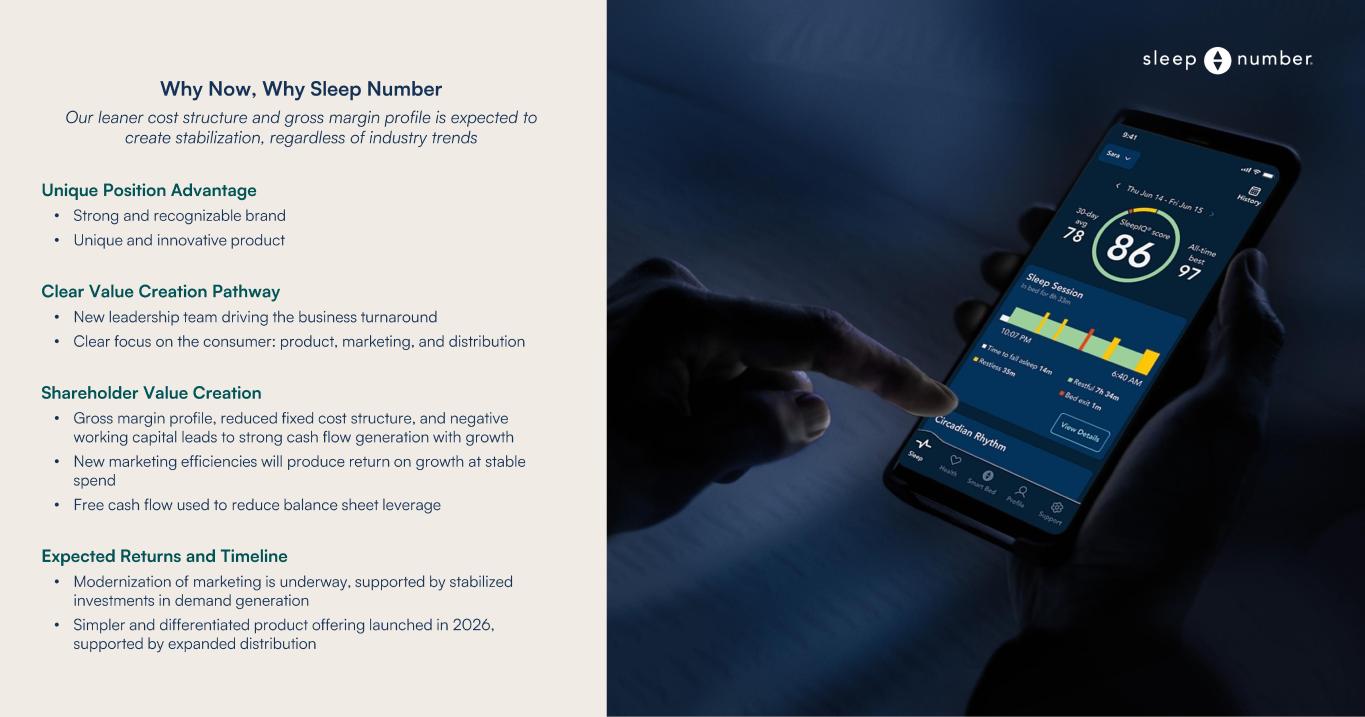 Why Now, Why Sleep Number Our leaner cost structure and gross margin profile is expected to create stabilization, regardless of industry trends Unique Position Advantage • Strong and recognizable brand • Unique and innovative product Clear Value Creation Pathway • New leadership team driving the business turnaround • Clear focus on the consumer: product, marketing, and distribution Shareholder Value Creation • Gross margin profile, reduced fixed cost structure, and negative working capital leads to strong cash flow generation with growth • New marketing efficiencies will produce return on growth at stable spend • Free cash flow used to reduce balance sheet leverage Expected Returns and Timeline • Modernization of marketing is underway, supported by stabilized investments in demand generation • Simpler and differentiated product offering launched in 2026, supported by expanded distribution