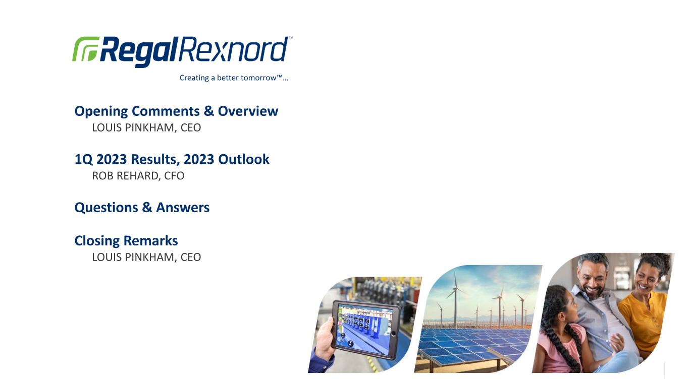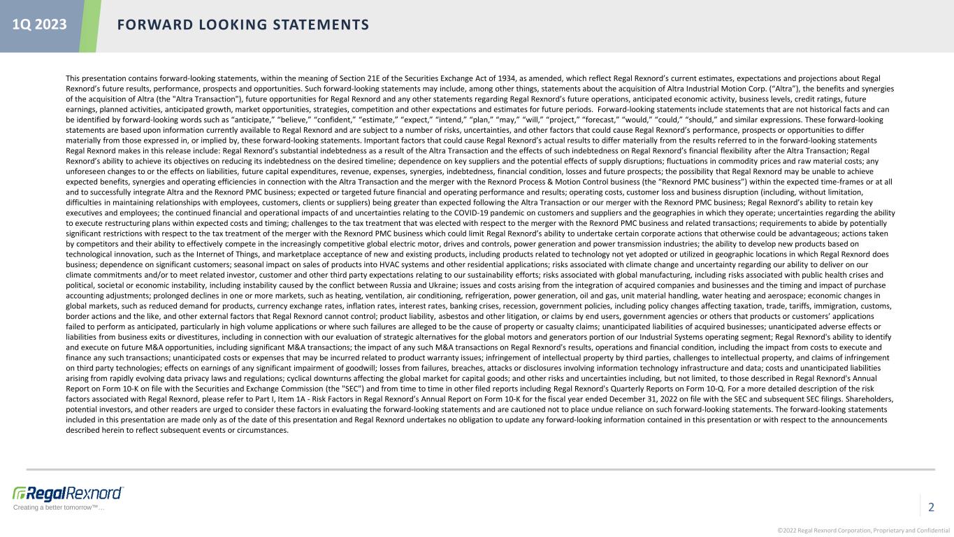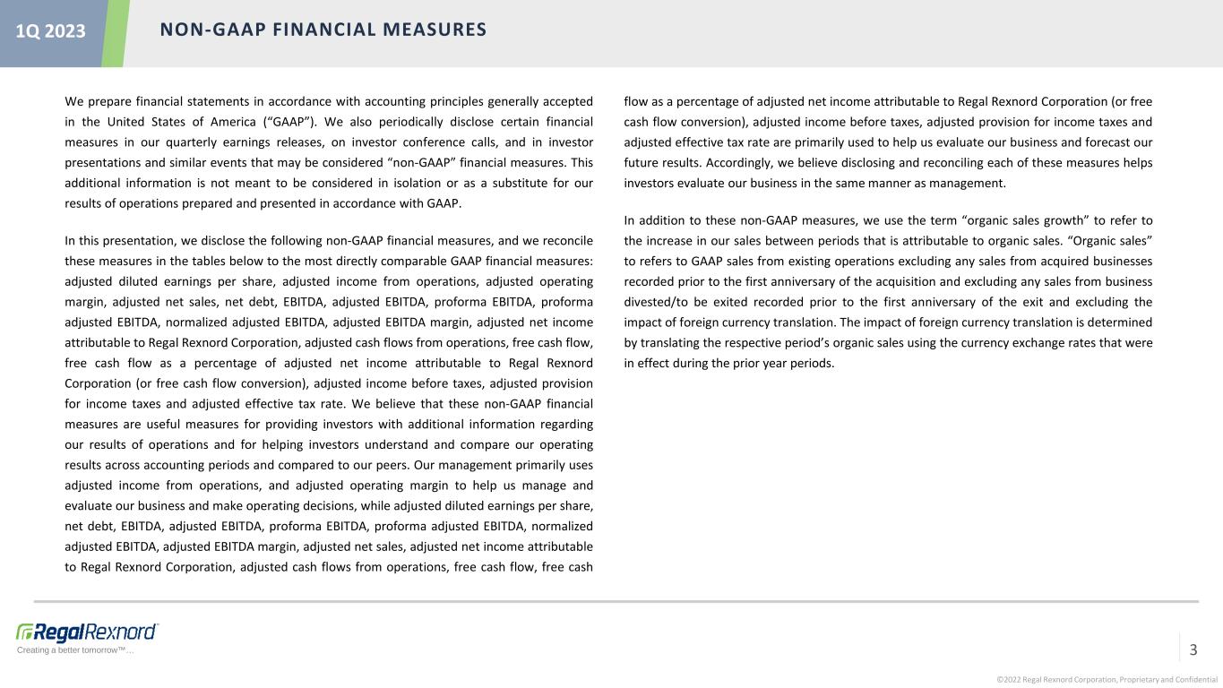 ©2022 Regal Rexnord Corporation, Proprietary and Confidential Creating a better tomorrow™… 1Q 2023 FORWARD LOOKING STATEMENTS 2 This presentation contains forward-looking statements, within the meaning of Section 21E of the Securities Exchange Act of 1934, as amended, which reflect Regal Rexnord’s current estimates, expectations and projections about Regal Rexnord’s future results, performance, prospects and opportunities. Such forward-looking statements may include, among other things, statements about the acquisition of Altra Industrial Motion Corp. (“Altra”), the benefits and synergies of the acquisition of Altra (the "Altra Transaction"), future opportunities for Regal Rexnord and any other statements regarding Regal Rexnord’s future operations, anticipated economic activity, business levels, credit ratings, future earnings, planned activities, anticipated growth, market opportunities, strategies, competition and other expectations and estimates for future periods. Forward-looking statements include statements that are not historical facts and can be identified by forward-looking words such as “anticipate,” “believe,” “confident,” “estimate,” “expect,” “intend,” “plan,” “may,” “will,” “project,” “forecast,” “would,” “could,” “should,” and similar expressions. These forward-looking statements are based upon information currently available to Regal Rexnord and are subject to a number of risks, uncertainties, and other factors that could cause Regal Rexnord’s performance, prospects or opportunities to differ materially from those expressed in, or implied by, these forward-looking statements. Important factors that could cause Regal Rexnord’s actual results to differ materially from the results referred to in the forward-looking statements Regal Rexnord makes in this release include: Regal Rexnord’s substantial indebtedness as a result of the Altra Transaction and the effects of such indebtedness on Regal Rexnord’s financial flexibility after the Altra Transaction; Regal Rexnord’s ability to achieve its objectives on reducing its indebtedness on the desired timeline; dependence on key suppliers and the potential effects of supply disruptions; fluctuations in commodity prices and raw material costs; any unforeseen changes to or the effects on liabilities, future capital expenditures, revenue, expenses, synergies, indebtedness, financial condition, losses and future prospects; the possibility that Regal Rexnord may be unable to achieve expected benefits, synergies and operating efficiencies in connection with the Altra Transaction and the merger with the Rexnord Process & Motion Control business (the “Rexnord PMC business”) within the expected time-frames or at all and to successfully integrate Altra and the Rexnord PMC business; expected or targeted future financial and operating performance and results; operating costs, customer loss and business disruption (including, without limitation, difficulties in maintaining relationships with employees, customers, clients or suppliers) being greater than expected following the Altra Transaction or our merger with the Rexnord PMC business; Regal Rexnord’s ability to retain key executives and employees; the continued financial and operational impacts of and uncertainties relating to the COVID-19 pandemic on customers and suppliers and the geographies in which they operate; uncertainties regarding the ability to execute restructuring plans within expected costs and timing; challenges to the tax treatment that was elected with respect to the merger with the Rexnord PMC business and related transactions; requirements to abide by potentially significant restrictions with respect to the tax treatment of the merger with the Rexnord PMC business which could limit Regal Rexnord’s ability to undertake certain corporate actions that otherwise could be advantageous; actions taken by competitors and their ability to effectively compete in the increasingly competitive global electric motor, drives and controls, power generation and power transmission industries; the ability to develop new products based on technological innovation, such as the Internet of Things, and marketplace acceptance of new and existing products, including products related to technology not yet adopted or utilized in geographic locations in which Regal Rexnord does business; dependence on significant customers; seasonal impact on sales of products into HVAC systems and other residential applications; risks associated with climate change and uncertainty regarding our ability to deliver on our climate commitments and/or to meet related investor, customer and other third party expectations relating to our sustainability efforts; risks associated with global manufacturing, including risks associated with public health crises and political, societal or economic instability, including instability caused by the conflict between Russia and Ukraine; issues and costs arising from the integration of acquired companies and businesses and the timing and impact of purchase accounting adjustments; prolonged declines in one or more markets, such as heating, ventilation, air conditioning, refrigeration, power generation, oil and gas, unit material handling, water heating and aerospace; economic changes in global markets, such as reduced demand for products, currency exchange rates, inflation rates, interest rates, banking crises, recession, government policies, including policy changes affecting taxation, trade, tariffs, immigration, customs, border actions and the like, and other external factors that Regal Rexnord cannot control; product liability, asbestos and other litigation, or claims by end users, government agencies or others that products or customers’ applications failed to perform as anticipated, particularly in high volume applications or where such failures are alleged to be the cause of property or ca