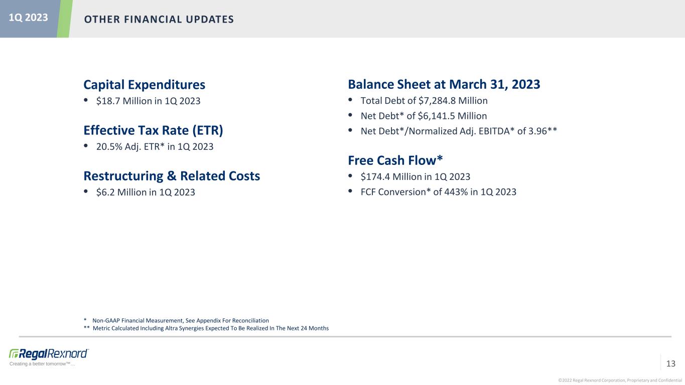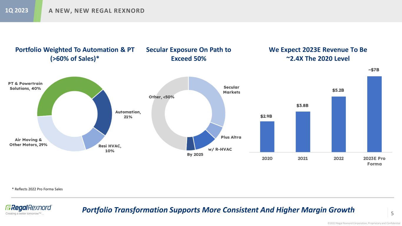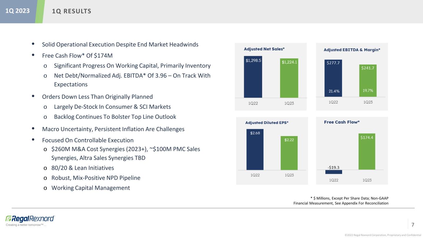 ©2022 Regal Rexnord Corporation, Proprietary and Confidential Creating a better tomorrow™… 1Q 2023 FORWARD LOOKING STATEMENTS 2 This presentation contains forward-looking statements, within the meaning of Section 21E of the Securities Exchange Act of 1934, as amended, which reflect Regal Rexnord’s current estimates, expectations and projections about Regal Rexnord’s future results, performance, prospects and opportunities. Such forward-looking statements may include, among other things, statements about the acquisition of Altra Industrial Motion Corp. (“Altra”), the benefits and synergies of the acquisition of Altra (the "Altra Transaction"), future opportunities for Regal Rexnord and any other statements regarding Regal Rexnord’s future operations, anticipated economic activity, business levels, credit ratings, future earnings, planned activities, anticipated growth, market opportunities, strategies, competition and other expectations and estimates for future periods. Forward-looking statements include statements that are not historical facts and can be identified by forward-looking words such as “anticipate,” “believe,” “confident,” “estimate,” “expect,” “intend,” “plan,” “may,” “will,” “project,” “forecast,” “would,” “could,” “should,” and similar expressions. These forward-looking statements are based upon information currently available to Regal Rexnord and are subject to a number of risks, uncertainties, and other factors that could cause Regal Rexnord’s performance, prospects or opportunities to differ materially from those expressed in, or implied by, these forward-looking statements. Important factors that could cause Regal Rexnord’s actual results to differ materially from the results referred to in the forward-looking statements Regal Rexnord makes in this release include: Regal Rexnord’s substantial indebtedness as a result of the Altra Transaction and the effects of such indebtedness on Regal Rexnord’s financial flexibility after the Altra Transaction; Regal Rexnord’s ability to achieve its objectives on reducing its indebtedness on the desired timeline; dependence on key suppliers and the potential effects of supply disruptions; fluctuations in commodity prices and raw material costs; any unforeseen changes to or the effects on liabilities, future capital expenditures, revenue, expenses, synergies, indebtedness, financial condition, losses and future prospects; the possibility that Regal Rexnord may be unable to achieve expected benefits, synergies and operating efficiencies in connection with the Altra Transaction and the merger with the Rexnord Process & Motion Control business (the “Rexnord PMC business”) within the expected time-frames or at all and to successfully integrate Altra and the Rexnord PMC business; expected or targeted future financial and operating performance and results; operating costs, customer loss and business disruption (including, without limitation, difficulties in maintaining relationships with employees, customers, clients or suppliers) being greater than expected following the Altra Transaction or our merger with the Rexnord PMC business; Regal Rexnord’s ability to retain key executives and employees; the continued financial and operational impacts of and uncertainties relating to the COVID-19 pandemic on customers and suppliers and the geographies in which they operate; uncertainties regarding the ability to execute restructuring plans within expected costs and timing; challenges to the tax treatment that was elected with respect to the merger with the Rexnord PMC business and related transactions; requirements to abide by potentially significant restrictions with respect to the tax treatment of the merger with the Rexnord PMC business which could limit Regal Rexnord’s ability to undertake certain corporate actions that otherwise could be advantageous; actions taken by competitors and their ability to effectively compete in the increasingly competitive global electric motor, drives and controls, power generation and power transmission industries; the ability to develop new products based on technological innovation, such as the Internet of Things, and marketplace acceptance of new and existing products, including products related to technology not yet adopted or utilized in geographic locations in which Regal Rexnord does business; dependence on significant customers; seasonal impact on sales of products into HVAC systems and other residential applications; risks associated with climate change and uncertainty regarding our ability to deliver on our climate commitments and/or to meet related investor, customer and other third party expectations relating to our sustainability efforts; risks associated with global manufacturing, including risks associated with public health crises and political, societal or economic instability, including instability caused by the conflict between Russia and Ukraine; issues and costs arising from the integration of acquired companies and businesses and the timing and impact of purchase accounting adjustments; prolonged declines in one or more markets, such as heating, ventilation, air conditioning, refrigeration, power generation, oil and gas, unit material handling, water heating and aerospace; economic changes in global markets, such as reduced demand for products, currency exchange rates, inflation rates, interest rates, banking crises, recession, government policies, including policy changes affecting taxation, trade, tariffs, immigration, customs, border actions and the like, and other external factors that Regal Rexnord cannot control; product liability, asbestos and other litigation, or claims by end users, government agencies or others that products or customers’ applications failed to perform as anticipated, particularly in high volume applications or where such failures are alleged to be the cause of property or ca