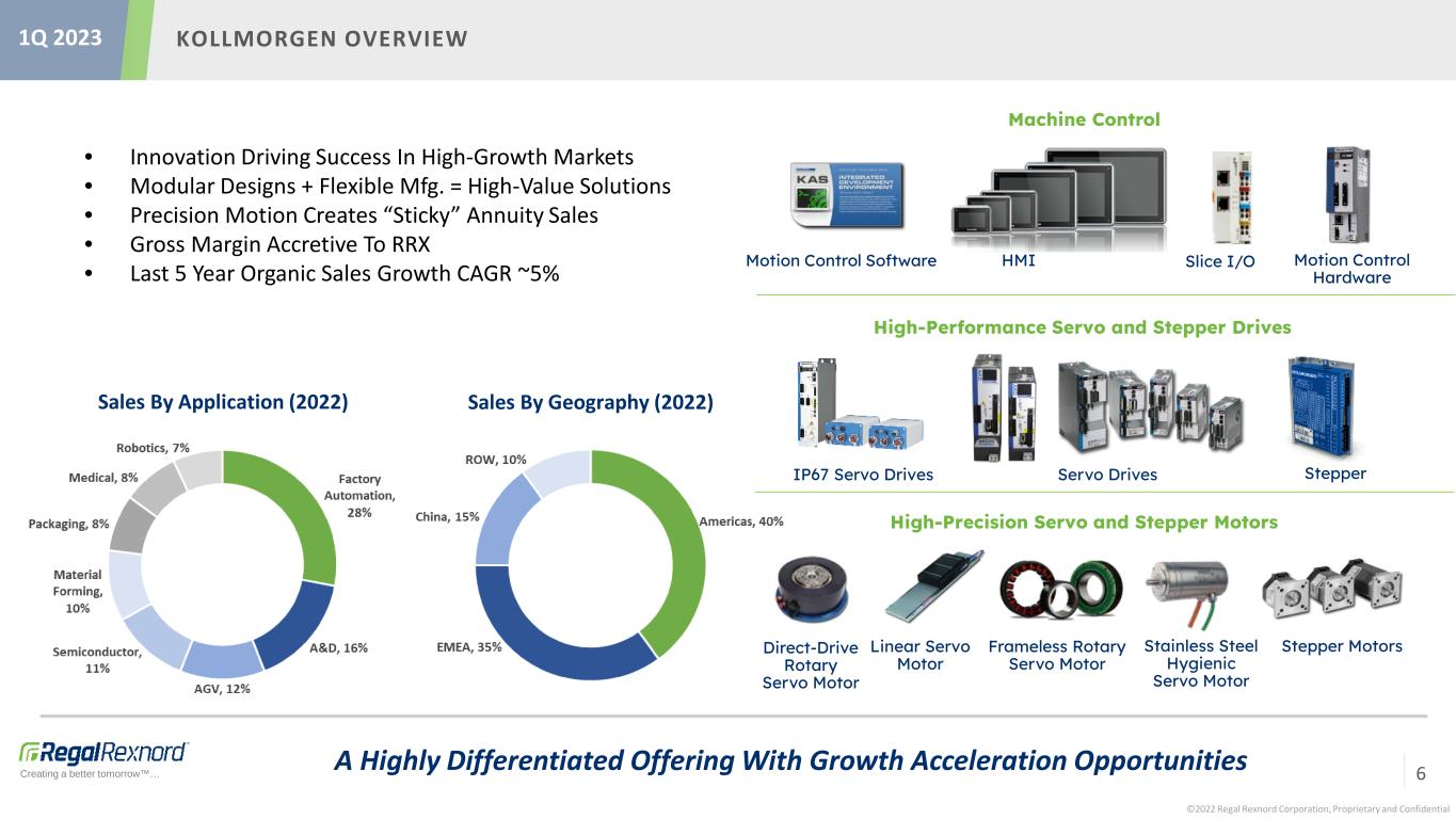©2022 Regal Rexnord Corporation, Proprietary and Confidential Creating a better tomorrow™… KOLLMORGEN OVERVIEW 1Q 2023 6A Highly Differentiated Offering With Growth Acceleration Opportunities Machine Control High-Precision Servo and Stepper Motors Frameless Rotary Servo Motor Servo Drives Direct-Drive Rotary Servo Motor IP67 Servo Drives Stepper High-Performance Servo and Stepper Drives Stepper MotorsLinear Servo Motor Motion Control Software HMI Slice I/O Motion Control Hardware Stainless Steel Hygienic Servo Motor • Innovation Driving Success In High-Growth Markets • Modular Designs + Flexible Mfg. = High-Value Solutions • Precision Motion Creates “Sticky” Annuity Sales • Gross Margin Accretive To RRX • Last 5 Year Organic Sales Growth CAGR ~5% Sales By Application (2022) Sales By Geography (2022)