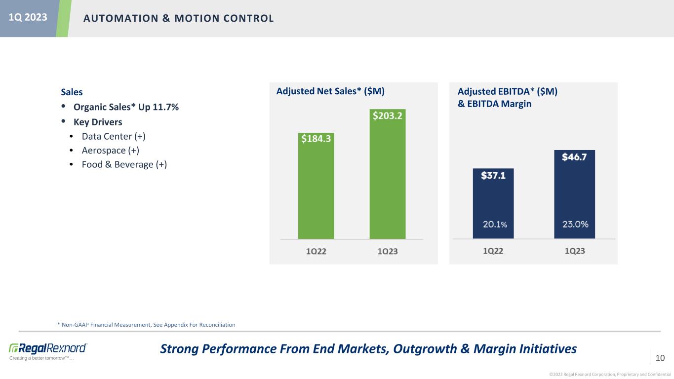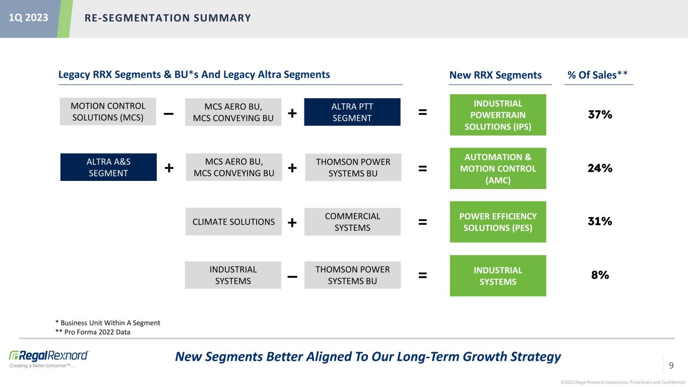 ©2022 Regal Rexnord Corporation, Proprietary and Confidential Creating a better tomorrow™… New Segments Better Aligned To Our Long-Term Growth Strategy RE-SEGMENTATION SUMMARY 9 1Q 2023 CLIMATE SOLUTIONS COMMERCIAL SYSTEMS = POWER EFFICIENCY SOLUTIONS (PES)+ INDUSTRIAL SYSTEMS THOMSON POWER SYSTEMS BU̶ = INDUSTRIAL SYSTEMS MOTION CONTROL SOLUTIONS (MCS) MCS AERO BU, MCS CONVEYING BU̶ ALTRA PTT SEGMENT+ = INDUSTRIAL POWERTRAIN SOLUTIONS (IPS) ALTRA A&S SEGMENT + MCS AERO BU, MCS CONVEYING BU + THOMSON POWER SYSTEMS BU = AUTOMATION & MOTION CONTROL (AMC) Legacy RRX Segments & BU*s And Legacy Altra Segments New RRX Segments * Business Unit Within A Segment ** Pro Forma 2022 Data % Of Sales** 37% 24% 31% 8%
