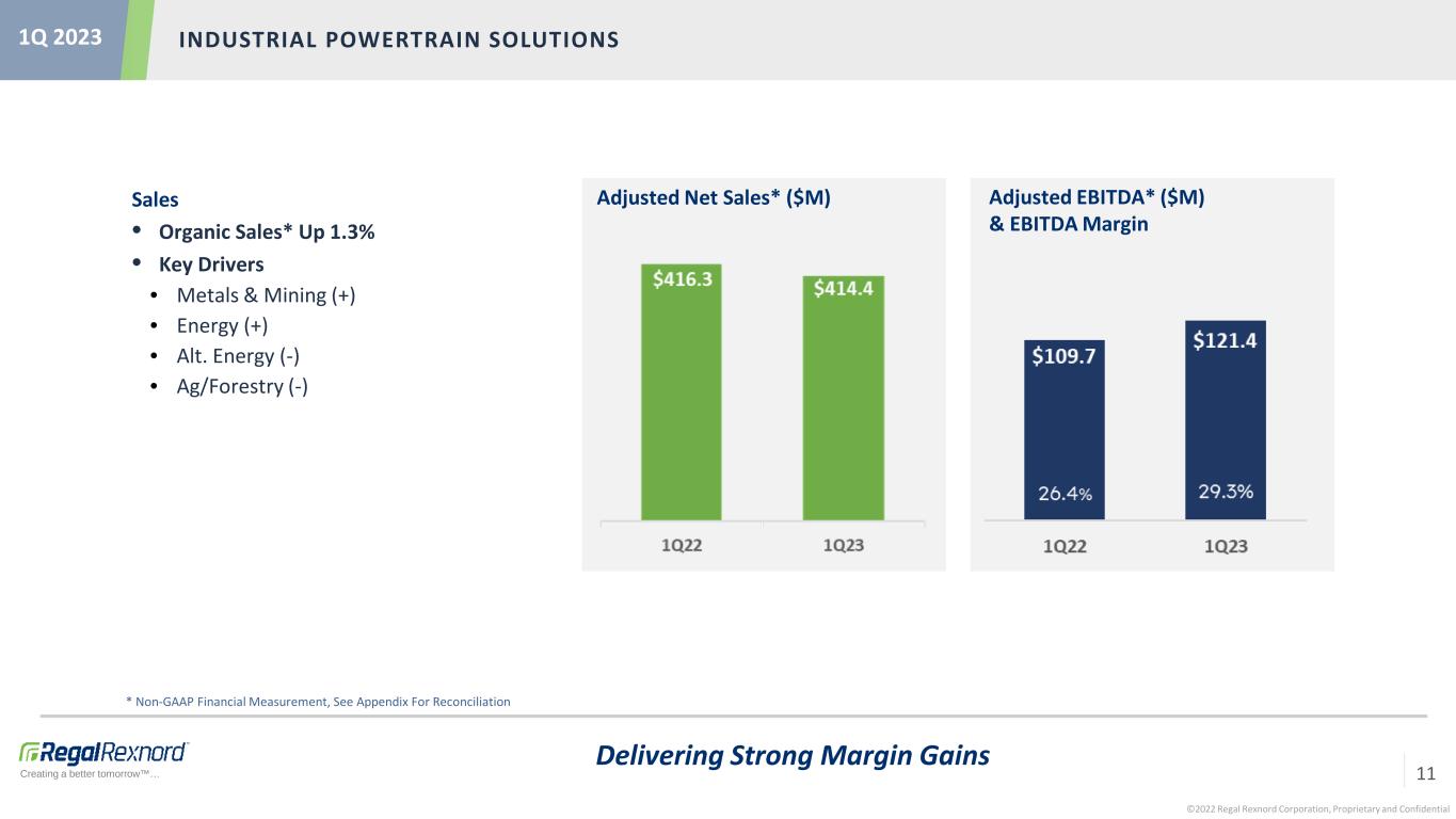 ©2022 Regal Rexnord Corporation, Proprietary and Confidential Creating a better tomorrow™… Sales • Organic Sales* Up 11.7% • Key Drivers • Data Center (+) • Aerospace (+) • Food & Beverage (+) AUTOMATION & MOTION CONTROL * Non-GAAP Financial Measurement, See Appendix For Reconciliation Strong Performance From End Markets, Outgrowth & Margin Initiatives 10 1Q 2023 Adjusted Net Sales* ($M) Adjusted EBITDA* ($M) & EBITDA Margin