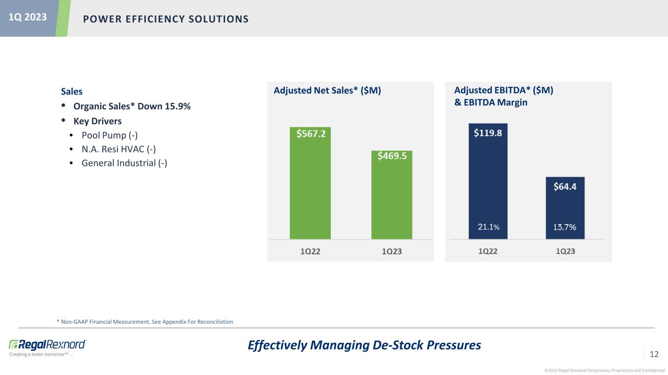 ©2022 Regal Rexnord Corporation, Proprietary and Confidential Creating a better tomorrow™… POWER EFFICIENCY SOLUTIONS * Non-GAAP Financial Measurement, See Appendix For Reconciliation Effectively Managing De-Stock Pressures Sales • Organic Sales* Down 15.9% • Key Drivers • Pool Pump (-) • N.A. Resi HVAC (-) • General Industrial (-) $21.3 $39.0 12 $189.8 1Q 2023 $135.7 $165.5 Adjusted EBITDA* ($M) & EBITDA Margin Adjusted Net Sales* ($M)