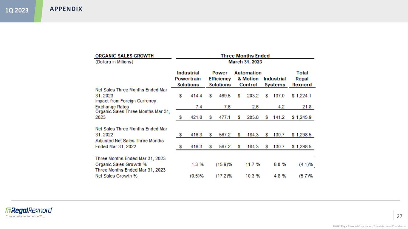 ©2022 Regal Rexnord Corporation, Proprietary and Confidential Creating a better tomorrow™… APPENDIX 27 1Q 2023