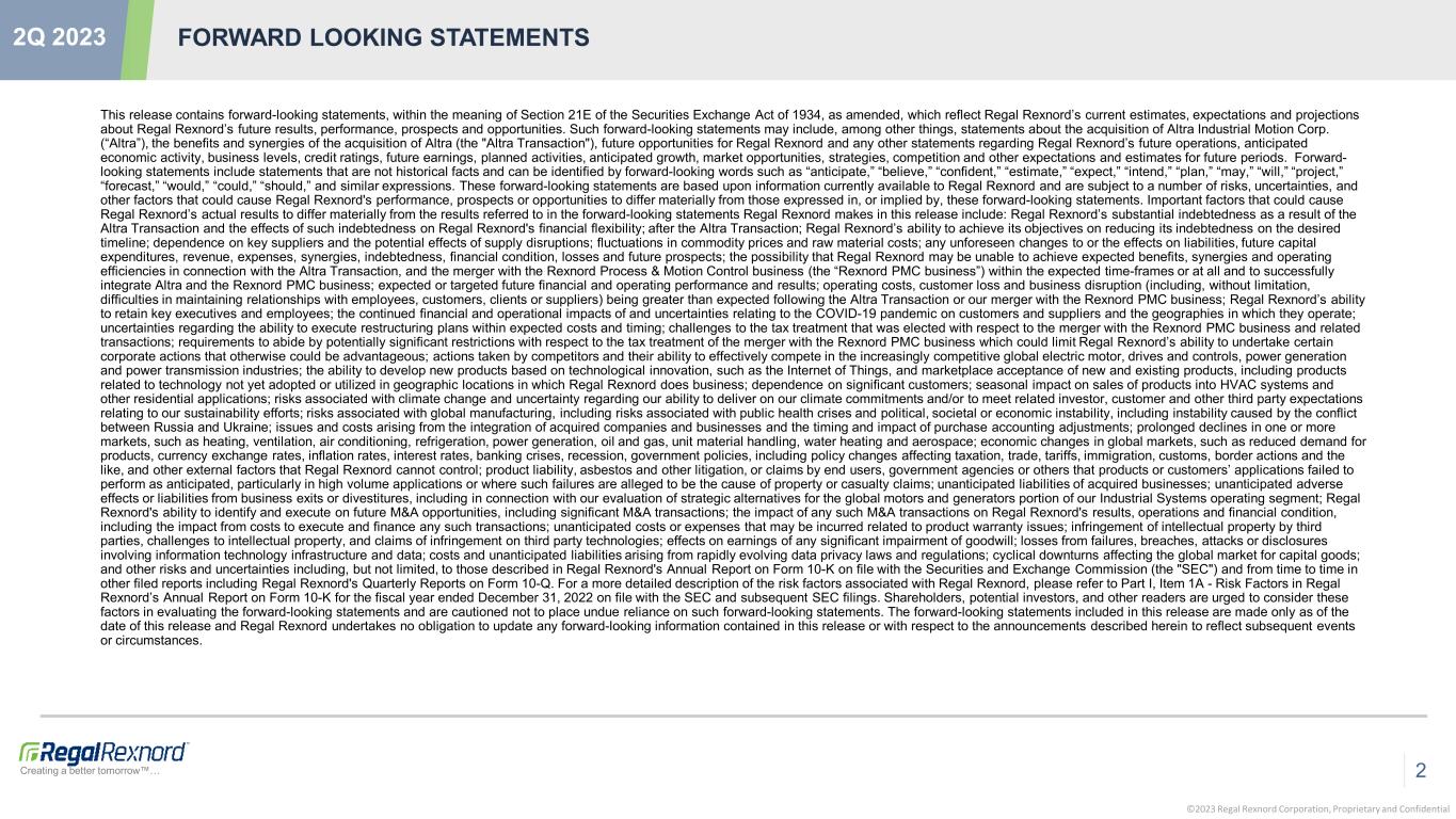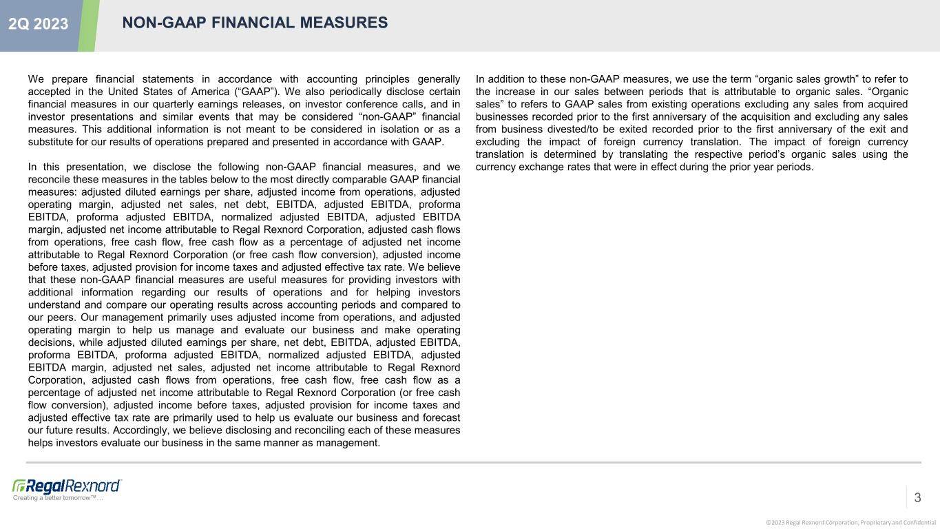 ©2023 Regal Rexnord Corporation, Proprietary and Confidential Creating a better tomorrow™… 2Q 2023 FORWARD LOOKING STATEMENTS 2 This release contains forward-looking statements, within the meaning of Section 21E of the Securities Exchange Act of 1934, as amended, which reflect Regal Rexnord’s current estimates, expectations and projections about Regal Rexnord’s future results, performance, prospects and opportunities. Such forward-looking statements may include, among other things, statements about the acquisition of Altra Industrial Motion Corp. (“Altra”), the benefits and synergies of the acquisition of Altra (the "Altra Transaction"), future opportunities for Regal Rexnord and any other statements regarding Regal Rexnord’s future operations, anticipated economic activity, business levels, credit ratings, future earnings, planned activities, anticipated growth, market opportunities, strategies, competition and other expectations and estimates for future periods. Forward- looking statements include statements that are not historical facts and can be identified by forward-looking words such as “anticipate,” “believe,” “confident,” “estimate,” “expect,” “intend,” “plan,” “may,” “will,” “project,” “forecast,” “would,” “could,” “should,” and similar expressions. These forward-looking statements are based upon information currently available to Regal Rexnord and are subject to a number of risks, uncertainties, and other factors that could cause Regal Rexnord's performance, prospects or opportunities to differ materially from those expressed in, or implied by, these forward-looking statements. Important factors that could cause Regal Rexnord’s actual results to differ materially from the results referred to in the forward-looking statements Regal Rexnord makes in this release include: Regal Rexnord’s substantial indebtedness as a result of the Altra Transaction and the effects of such indebtedness on Regal Rexnord's financial flexibility; after the Altra Transaction; Regal Rexnord’s ability to achieve its objectives on reducing its indebtedness on the desired timeline; dependence on key suppliers and the potential effects of supply disruptions; fluctuations in commodity prices and raw material costs; any unforeseen changes to or the effects on liabilities, future capital expenditures, revenue, expenses, synergies, indebtedness, financial condition, losses and future prospects; the possibility that Regal Rexnord may be unable to achieve expected benefits, synergies and operating efficiencies in connection with the Altra Transaction, and the merger with the Rexnord Process & Motion Control business (the “Rexnord PMC business”) within the expected time-frames or at all and to successfully integrate Altra and the Rexnord PMC business; expected or targeted future financial and operating performance and results; operating costs, customer loss and business disruption (including, without limitation, difficulties in maintaining relationships with employees, customers, clients or suppliers) being greater than expected following the Altra Transaction or our merger with the Rexnord PMC business; Regal Rexnord’s ability to retain key executives and employees; the continued financial and operational impacts of and uncertainties relating to the COVID-19 pandemic on customers and suppliers and the geographies in which they operate; uncertainties regarding the ability to execute restructuring plans within expected costs and timing; challenges to the tax treatment that was elected with respect to the merger with the Rexnord PMC business and related transactions; requirements to abide by potentially significant restrictions with respect to the tax treatment of the merger with the Rexnord PMC business which could limit Regal Rexnord’s ability to undertake certain corporate actions that otherwise could be advantageous; actions taken by competitors and their ability to effectively compete in the increasingly competitive global electric motor, drives and controls, power generation and power transmission industries; the ability to develop new products based on technological innovation, such as the Internet of Things, and marketplace acceptance of new and existing products, including products related to technology not yet adopted or utilized in geographic locations in which Regal Rexnord does business; dependence on significant customers; seasonal impact on sales of products into HVAC systems and other residential applications; risks associated with climate change and uncertainty regarding our ability to deliver on our climate commitments and/or to meet related investor, customer and other third party expectations relating to our sustainability efforts; risks associated with global manufacturing, including risks associated with public health crises and political, societal or economic instability, including instability caused by the conflict between Russia and Ukraine; issues and costs arising from the integration of acquired companies and businesses and the timing and impact of purchase accounting adjustments; prolonged declines in one or more markets, such as heating, ventilation, air conditioning, refrigeration, power generation, oil and gas, unit material handling, water heating and aerospace; economic changes in global markets, such as reduced demand for products, currency exchange rates, inflation rates, interest rates, banking crises, recession, government policies, including policy changes affecting taxation, trade, tariffs, immigration, customs, border actions and the like, and other external factors that Regal Rexnord cannot control; product liability, asbestos and other litigation, or claims by end users, government agencies or others that products or customers’ applications failed to perform as anticipated, particularly in high volume applications or where such failures are alleged to be the cause of property or casualty