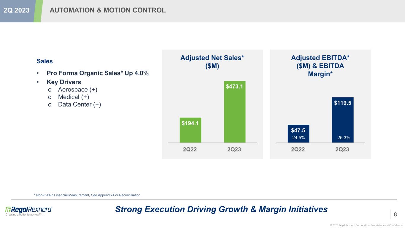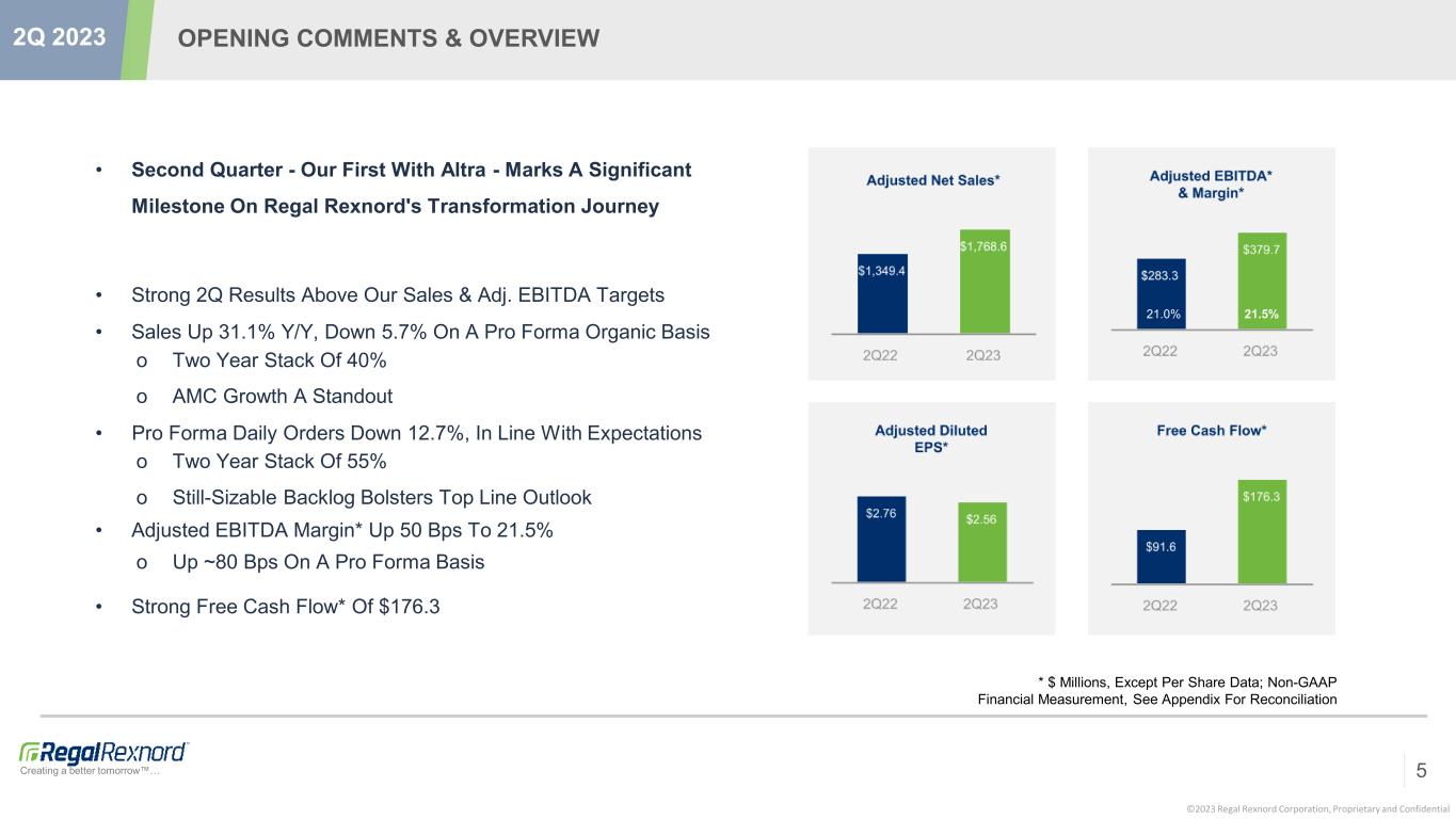 ©2023 Regal Rexnord Corporation, Proprietary and Confidential Creating a better tomorrow™… NON-GAAP FINANCIAL MEASURES 3 2Q 2023 We prepare financial statements in accordance with accounting principles generally accepted in the United States of America (“GAAP”). We also periodically disclose certain financial measures in our quarterly earnings releases, on investor conference calls, and in investor presentations and similar events that may be considered “non-GAAP” financial measures. This additional information is not meant to be considered in isolation or as a substitute for our results of operations prepared and presented in accordance with GAAP. In this presentation, we disclose the following non-GAAP financial measures, and we reconcile these measures in the tables below to the most directly comparable GAAP financial measures: adjusted diluted earnings per share, adjusted income from operations, adjusted operating margin, adjusted net sales, net debt, EBITDA, adjusted EBITDA, proforma EBITDA, proforma adjusted EBITDA, normalized adjusted EBITDA, adjusted EBITDA margin, adjusted net income attributable to Regal Rexnord Corporation, adjusted cash flows from operations, free cash flow, free cash flow as a percentage of adjusted net income attributable to Regal Rexnord Corporation (or free cash flow conversion), adjusted income before taxes, adjusted provision for income taxes and adjusted effective tax rate. We believe that these non-GAAP financial measures are useful measures for providing investors with additional information regarding our results of operations and for helping investors understand and compare our operating results across accounting periods and compared to our peers. Our management primarily uses adjusted income from operations, and adjusted operating margin to help us manage and evaluate our business and make operating decisions, while adjusted diluted earnings per share, net debt, EBITDA, adjusted EBITDA, proforma EBITDA, proforma adjusted EBITDA, normalized adjusted EBITDA, adjusted EBITDA margin, adjusted net sales, adjusted net income attributable to Regal Rexnord Corporation, adjusted cash flows from operations, free cash flow, free cash flow as a percentage of adjusted net income attributable to Regal Rexnord Corporation (or free cash flow conversion), adjusted income before taxes, adjusted provision for income taxes and adjusted effective tax rate are primarily used to help us evaluate our business and forecast our future results. Accordingly, we believe disclosing and reconciling each of these measures helps investors evaluate our business in the same manner as management. In addition to these non-GAAP measures, we use the term “organic sales growth” to refer to the increase in our sales between periods that is attributable to organic sales. “Organic sales” to refers to GAAP sales from existing operations excluding any sales from acquired businesses recorded prior to the first anniversary of the acquisition and excluding any sales from business divested/to be exited recorded prior to the first anniversary of the exit and excluding the impact of foreign currency translation. The impact of foreign currency translation is determined by translating the respective period’s organic sales using the currency exchange rates that were in effect during the prior year periods.