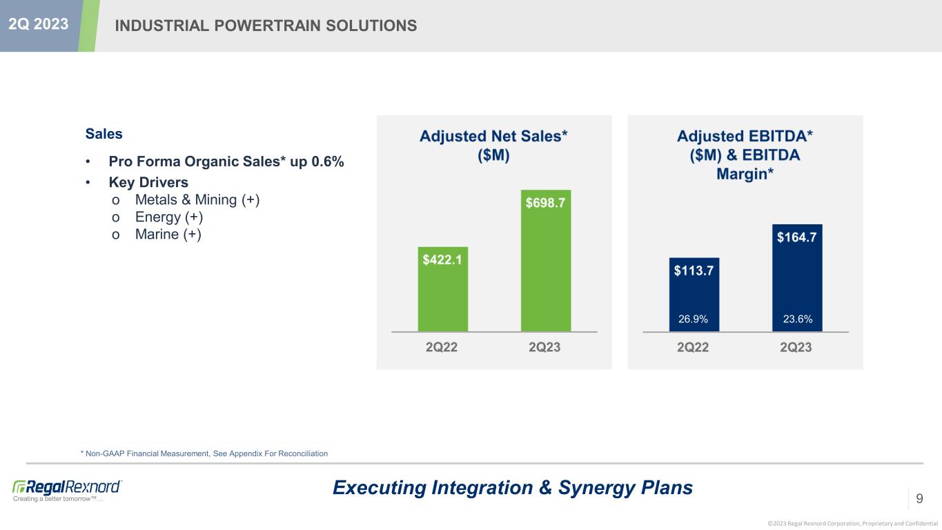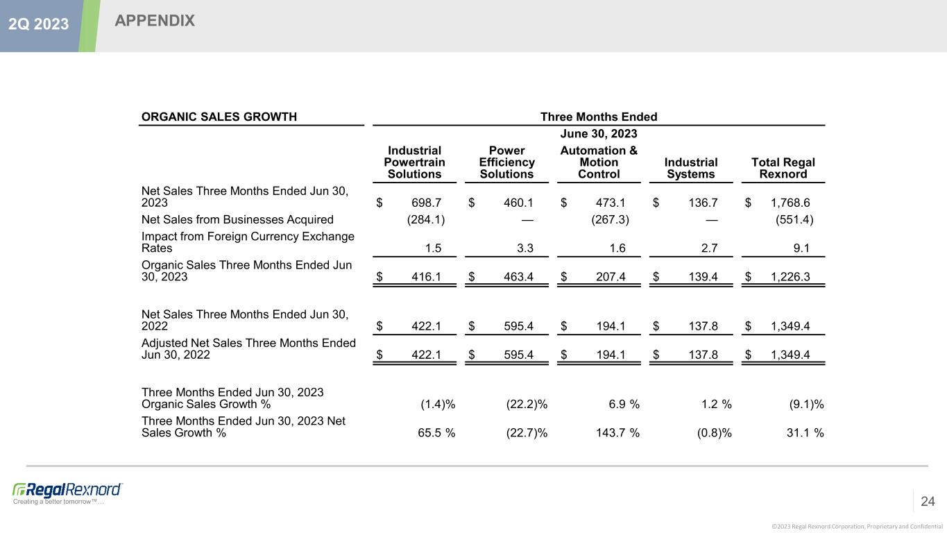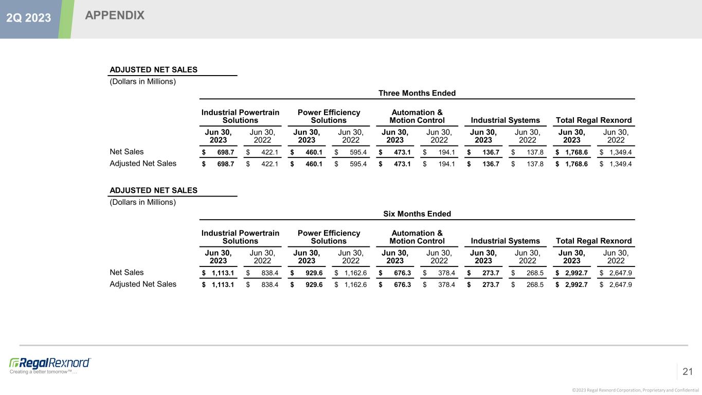 ©2023 Regal Rexnord Corporation, Proprietary and Confidential Creating a better tomorrow™… APPENDIX 21 2Q 2023 ADJUSTED NET SALES (Dollars in Millions) Three Months Ended Industrial Powertrain Solutions Power Efficiency Solutions Automation & Motion Control Industrial Systems Total Regal Rexnord Jun 30, 2023 Jun 30, 2022 Jun 30, 2023 Jun 30, 2022 Jun 30, 2023 Jun 30, 2022 Jun 30, 2023 Jun 30, 2022 Jun 30, 2023 Jun 30, 2022 Net Sales $ 698.7 $ 422.1 $ 460.1 $ 595.4 $ 473.1 $ 194.1 $ 136.7 $ 137.8 $ 1,768.6 $ 1,349.4 Adjusted Net Sales $ 698.7 $ 422.1 $ 460.1 $ 595.4 $ 473.1 $ 194.1 $ 136.7 $ 137.8 $ 1,768.6 $ 1,349.4 ADJUSTED NET SALES (Dollars in Millions) Six Months Ended Industrial Powertrain Solutions Power Efficiency Solutions Automation & Motion Control Industrial Systems Total Regal Rexnord Jun 30, 2023 Jun 30, 2022 Jun 30, 2023 Jun 30, 2022 Jun 30, 2023 Jun 30, 2022 Jun 30, 2023 Jun 30, 2022 Jun 30, 2023 Jun 30, 2022 Net Sales $ 1,113.1 $ 838.4 $ 929.6 $ 1,162.6 $ 676.3 $ 378.4 $ 273.7 $ 268.5 $ 2,992.7 $ 2,647.9 Adjusted Net Sales $ 1,113.1 $ 838.4 $ 929.6 $ 1,162.6 $ 676.3 $ 378.4 $ 273.7 $ 268.5 $ 2,992.7 $ 2,647.9