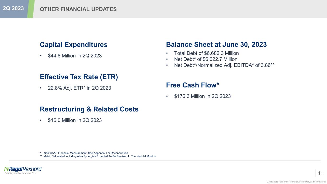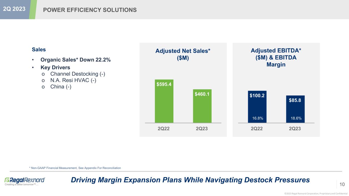 ©2023 Regal Rexnord Corporation, Proprietary and Confidential Creating a better tomorrow™… POWER EFFICIENCY SOLUTIONS * Non-GAAP Financial Measurement, See Appendix For Reconciliation Driving Margin Expansion Plans While Navigating Destock Pressures Sales • Organic Sales* Down 22.2% • Key Drivers o Channel Destocking (-) o N.A. Resi HVAC (-) o China (-) $21.3 $39.0 10 $189.8 2Q 2023 $135. 7 $165. 5 16.8% 18.6%
