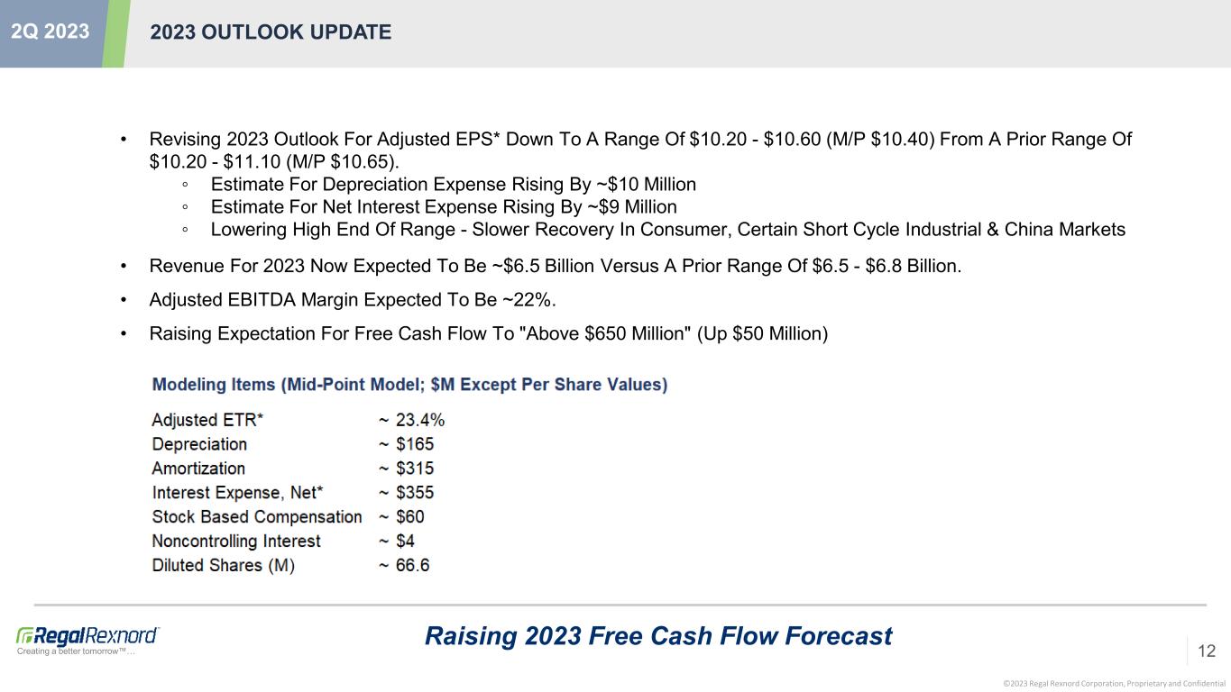 ©2023 Regal Rexnord Corporation, Proprietary and Confidential Creating a better tomorrow™… Raising 2023 Free Cash Flow Forecast 2023 OUTLOOK UPDATE 12 2Q 2023 • Revising 2023 Outlook For Adjusted EPS* Down To A Range Of $10.20 - $10.60 (M/P $10.40) From A Prior Range Of $10.20 - $11.10 (M/P $10.65). ◦ Estimate For Depreciation Expense Rising By ~$10 Million ◦ Estimate For Net Interest Expense Rising By ~$9 Million ◦ Lowering High End Of Range - Slower Recovery In Consumer, Certain Short Cycle Industrial & China Markets • Revenue For 2023 Now Expected To Be ~$6.5 Billion Versus A Prior Range Of $6.5 - $6.8 Billion. • Adjusted EBITDA Margin Expected To Be ~22%. • Raising Expectation For Free Cash Flow To "Above $650 Million" (Up $50 Million)