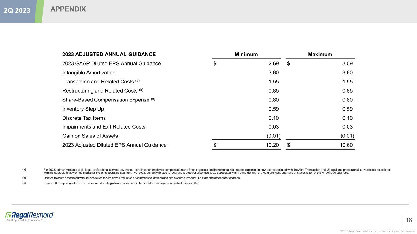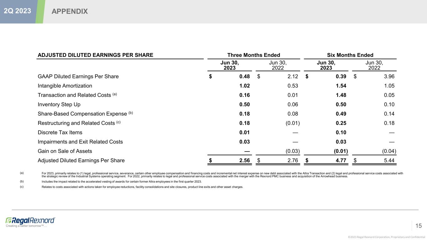 ©2023 Regal Rexnord Corporation, Proprietary and Confidential Creating a better tomorrow™… APPENDIX 15 2Q 2023 ADJUSTED DILUTED EARNINGS PER SHARE Three Months Ended Six Months Ended Jun 30, 2023 Jun 30, 2022 Jun 30, 2023 Jun 30, 2022 GAAP Diluted Earnings Per Share $ 0.48 $ 2.12 $ 0.39 $ 3.96 Intangible Amortization 1.02 0.53 1.54 1.05 Transaction and Related Costs (a) 0.16 0.01 1.48 0.05 Inventory Step Up 0.50 0.06 0.50 0.10 Share-Based Compensation Expense (b) 0.18 0.08 0.49 0.14 Restructuring and Related Costs (c) 0.18 (0.01) 0.25 0.18 Discrete Tax Items 0.01 — 0.10 — Impairments and Exit Related Costs 0.03 — 0.03 — Gain on Sale of Assets — (0.03) (0.01) (0.04) Adjusted Diluted Earnings Per Share $ 2.56 $ 2.76 $ 4.77 $ 5.44 (a) For 2023, primarily relates to (1) legal, professional service, severance, certain other employee compensation and financing costs and incremental net interest expense on new debt associated with the Altra Transaction and (2) legal and professional service costs associated with the strategic review of the Industrial Systems operating segment. For 2022, primarily relates to legal and professional service costs associated with the merger with the Rexnord PMC business and acquisition of the Arrowhead business. (b) Includes the impact related to the accelerated vesting of awards for certain former Altra employees in the first quarter 2023. (c) Relates to costs associated with actions taken for employee reductions, facility consolidations and site closures, product line exits and other asset charges.