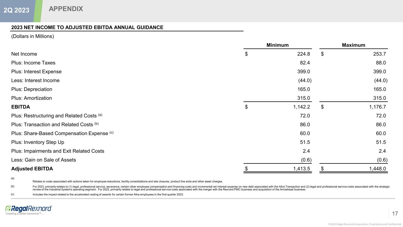 ©2023 Regal Rexnord Corporation, Proprietary and Confidential Creating a better tomorrow™… APPENDIX 16 2Q 2023 2023 ADJUSTED ANNUAL GUIDANCE Minimum Maximum 2023 GAAP Diluted EPS Annual Guidance $ 2.69 $ 3.09 Intangible Amortization 3.60 3.60 Transaction and Related Costs (a) 1.55 1.55 Restructuring and Related Costs (b) 0.85 0.85 Share-Based Compensation Expense (c) 0.80 0.80 Inventory Step Up 0.59 0.59 Discrete Tax Items 0.10 0.10 Impairments and Exit Related Costs 0.03 0.03 Gain on Sales of Assets (0.01) (0.01) 2023 Adjusted Diluted EPS Annual Guidance $ 10.20 $ 10.60 (a) For 2023, primarily relates to (1) legal, professional service, severance, certain other employee compensation and financing costs and incremental net interest expense on new debt associated with the Altra Transaction and (2) legal and professional service costs associated with the strategic review of the Industrial Systems operating segment. For 2022, primarily relates to legal and professional service costs associated with the merger with the Rexnord PMC business and acquisition of the Arrowhead business. (b) Relates to costs associated with actions taken for employee reductions, facility consolidations and site closures, product line exits and other asset charges. (c) Includes the impact related to the accelerated vesting of awards for certain former Altra employees in the first quarter 2023.