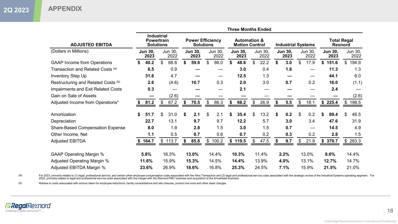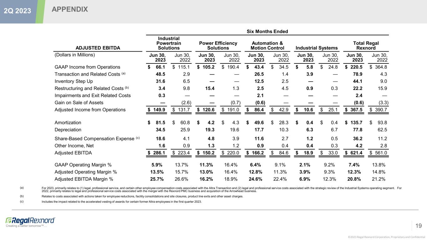 ©2023 Regal Rexnord Corporation, Proprietary and Confidential Creating a better tomorrow™… APPENDIX 18 2Q 2023 Three Months Ended ADJUSTED EBITDA Industrial Powertrain Solutions Power Efficiency Solutions Automation & Motion Control Industrial Systems Total Regal Rexnord (Dollars in Millions) Jun 30, 2023 Jun 30, 2022 Jun 30, 2023 Jun 30, 2022 Jun 30, 2023 Jun 30, 2022 Jun 30, 2023 Jun 30, 2022 Jun 30, 2023 Jun 30, 2022 GAAP Income from Operations $ 40.2 $ 68.8 $ 59.8 $ 86.0 $ 48.6 $ 22.2 $ 3.0 $ 17.9 $ 151.6 $ 194.9 Transaction and Related Costs (a) 6.5 0.9 — — 3.0 0.4 1.8 — 11.3 1.3 Inventory Step Up 31.6 4.7 — — 12.5 1.3 — — 44.1 6.0 Restructuring and Related Costs (b) 2.6 (4.6) 10.7 0.3 2.0 3.0 0.7 0.2 16.0 (1.1) Impairments and Exit Related Costs 0.3 — — — 2.1 — — — 2.4 — Gain on Sale of Assets — (2.6) — — — — — — — (2.6) Adjusted Income from Operations* $ 81.2 $ 67.2 $ 70.5 $ 86.3 $ 68.2 $ 26.9 $ 5.5 $ 18.1 $ 225.4 $ 198.5 Amortization $ 51.7 $ 31.0 $ 2.1 $ 2.1 $ 35.4 $ 13.2 $ 0.2 $ 0.2 $ 89.4 $ 46.5 Depreciation 22.7 13.1 9.7 9.7 12.2 5.7 3.0 3.4 47.6 31.9 Share-Based Compensation Expense 8.0 1.9 2.8 1.5 3.0 1.5 0.7 — 14.5 4.9 Other Income, Net 1.1 0.5 0.7 0.6 0.7 0.2 0.3 0.2 2.8 1.5 Adjusted EBITDA $ 164.7 $ 113.7 $ 85.8 $ 100.2 $ 119.5 $ 47.5 $ 9.7 $ 21.9 $ 379.7 $ 283.3 GAAP Operating Margin % 5.8% 16.3% 13.0% 14.4% 10.3% 11.4% 2.2% 13.0% 8.6% 14.4% Adjusted Operating Margin % 11.6% 15.9% 15.3% 14.5% 14.4% 13.9% 4.0% 13.1% 12.7% 14.7% Adjusted EBITDA Margin % 23.6% 26.9% 18.6% 16.8% 25.3% 24.5% 7.1% 15.9% 21.5% 21.0% (a) For 2023, primarily relates to (1) legal, professional service, and certain other employee compensation costs associated with the Altra Transaction and (2) legal and professional service costs associated with the strategic review of the Industrial Systems operating segment. For 2022, primarily relates to legal and professional service costs associated with the merger with the Rexnord PMC business and acquisition of the Arrowhead business. (b) Relates to costs associated with actions taken for employee reductions, facility consolidations and site closures, product line exits and other asset charges.