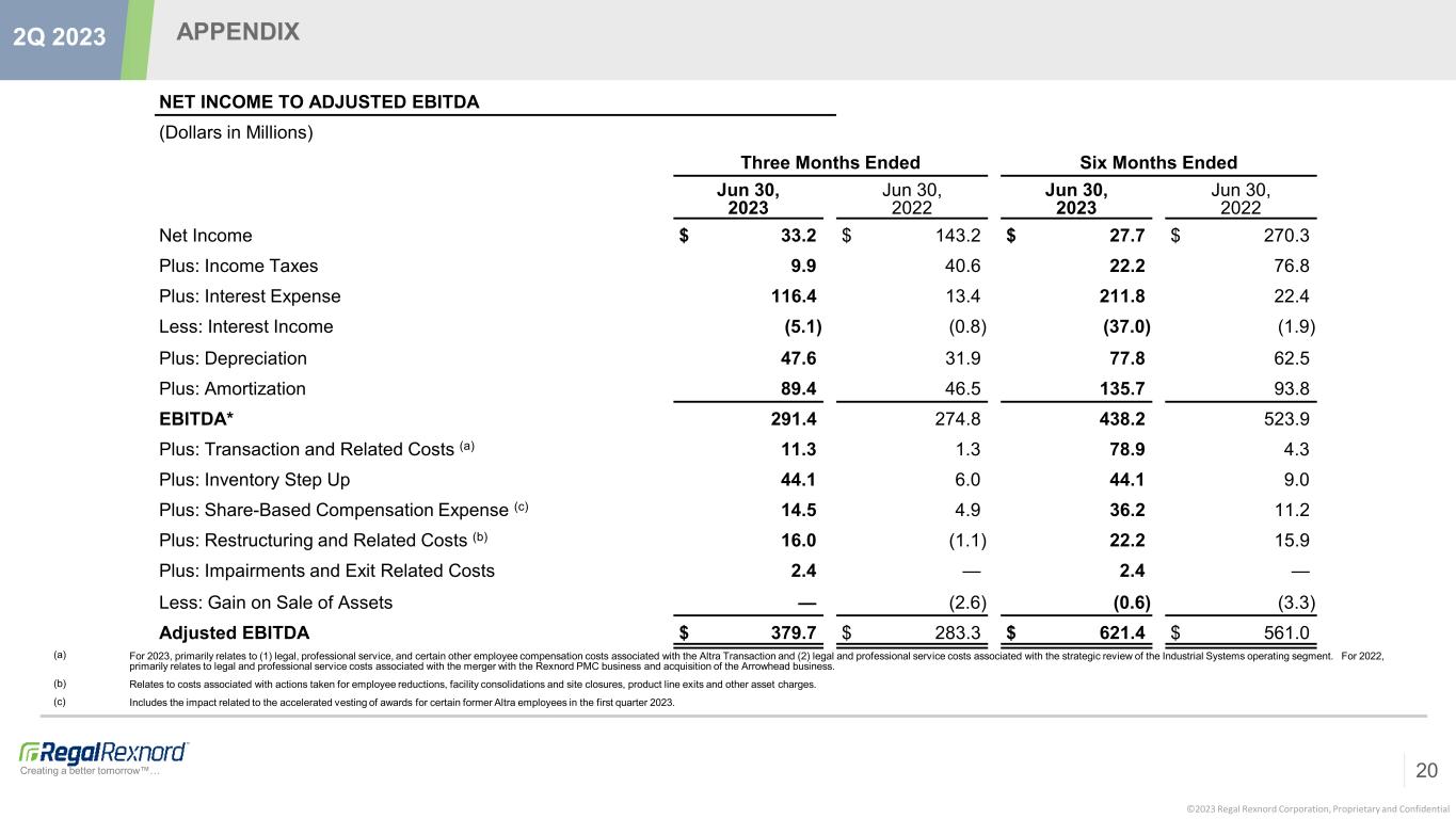 ©2023 Regal Rexnord Corporation, Proprietary and Confidential Creating a better tomorrow™… APPENDIX 20 2Q 2023 NET INCOME TO ADJUSTED EBITDA (Dollars in Millions) Three Months Ended Six Months Ended Jun 30, 2023 Jun 30, 2022 Jun 30, 2023 Jun 30, 2022 Net Income $ 33.2 $ 143.2 $ 27.7 $ 270.3 Plus: Income Taxes 9.9 40.6 22.2 76.8 Plus: Interest Expense 116.4 13.4 211.8 22.4 Less: Interest Income (5.1) (0.8) (37.0) (1.9) Plus: Depreciation 47.6 31.9 77.8 62.5 Plus: Amortization 89.4 46.5 135.7 93.8 EBITDA* 291.4 274.8 438.2 523.9 Plus: Transaction and Related Costs (a) 11.3 1.3 78.9 4.3 Plus: Inventory Step Up 44.1 6.0 44.1 9.0 Plus: Share-Based Compensation Expense (c) 14.5 4.9 36.2 11.2 Plus: Restructuring and Related Costs (b) 16.0 (1.1) 22.2 15.9 Plus: Impairments and Exit Related Costs 2.4 — 2.4 — Less: Gain on Sale of Assets — (2.6) (0.6) (3.3) Adjusted EBITDA $ 379.7 $ 283.3 $ 621.4 $ 561.0 (a) For 2023, primarily relates to (1) legal, professional service, and certain other employee compensation costs associated with the Altra Transaction and (2) legal and professional service costs associated with the strategic review of the Industrial Systems operating segment. For 2022, primarily relates to legal and professional service costs associated with the merger with the Rexnord PMC business and acquisition of the Arrowhead business. (b) Relates to costs associated with actions taken for employee reductions, facility consolidations and site closures, product line exits and other asset charges. (c) Includes the impact related to the accelerated vesting of awards for certain former Altra employees in the first quarter 2023.