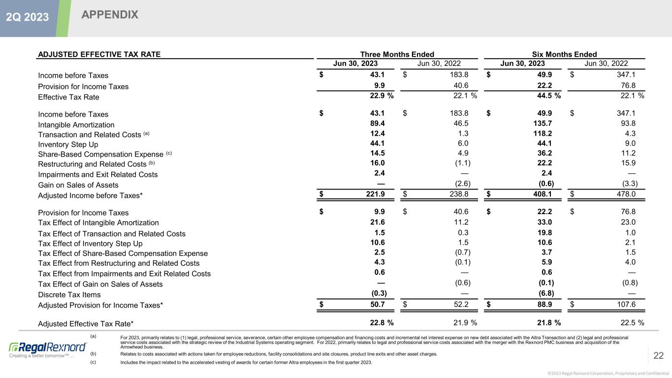 ©2023 Regal Rexnord Corporation, Proprietary and Confidential Creating a better tomorrow™… APPENDIX 22 2Q 2023 ADJUSTED EFFECTIVE TAX RATE Three Months Ended Six Months Ended Jun 30, 2023 Jun 30, 2022 Jun 30, 2023 Jun 30, 2022 Income before Taxes $ 43.1 $ 183.8 $ 49.9 $ 347.1 Provision for Income Taxes 9.9 40.6 22.2 76.8 Effective Tax Rate 22.9 % 22.1 % 44.5 % 22.1 % Income before Taxes $ 43.1 $ 183.8 $ 49.9 $ 347.1 Intangible Amortization 89.4 46.5 135.7 93.8 Transaction and Related Costs (a) 12.4 1.3 118.2 4.3 Inventory Step Up 44.1 6.0 44.1 9.0 Share-Based Compensation Expense (c) 14.5 4.9 36.2 11.2 Restructuring and Related Costs (b) 16.0 (1.1) 22.2 15.9 Impairments and Exit Related Costs 2.4 — 2.4 — Gain on Sales of Assets — (2.6) (0.6) (3.3) Adjusted Income before Taxes* $ 221.9 $ 238.8 $ 408.1 $ 478.0 Provision for Income Taxes $ 9.9 $ 40.6 $ 22.2 $ 76.8 Tax Effect of Intangible Amortization 21.6 11.2 33.0 23.0 Tax Effect of Transaction and Related Costs 1.5 0.3 19.8 1.0 Tax Effect of Inventory Step Up 10.6 1.5 10.6 2.1 Tax Effect of Share-Based Compensation Expense 2.5 (0.7) 3.7 1.5 Tax Effect from Restructuring and Related Costs 4.3 (0.1) 5.9 4.0 Tax Effect from Impairments and Exit Related Costs 0.6 — 0.6 — Tax Effect of Gain on Sales of Assets — (0.6) (0.1) (0.8) Discrete Tax Items (0.3) — (6.8) — Adjusted Provision for Income Taxes* $ 50.7 $ 52.2 $ 88.9 $ 107.6 Adjusted Effective Tax Rate* 22.8 % 21.9 % 21.8 % 22.5 % (a) For 2023, primarily relates to (1) legal, professional service, severance, certain other employee compensation and financing costs and incremental net interest expense on new debt associated with the Altra Transaction and (2) legal and professional service costs associated with the strategic review of the Industrial Systems operating segment. For 2022, primarily relates to legal and professional service costs associated with the merger with the Rexnord PMC business and acquisition of the Arrowhead business. (b) Relates to costs associated with actions taken for employee reductions, facility consolidations and site closures, product line exits and other asset charges. (c) Includes the impact related to the accelerated vesting of awards for certain former Altra employees in the first quarter 2023.