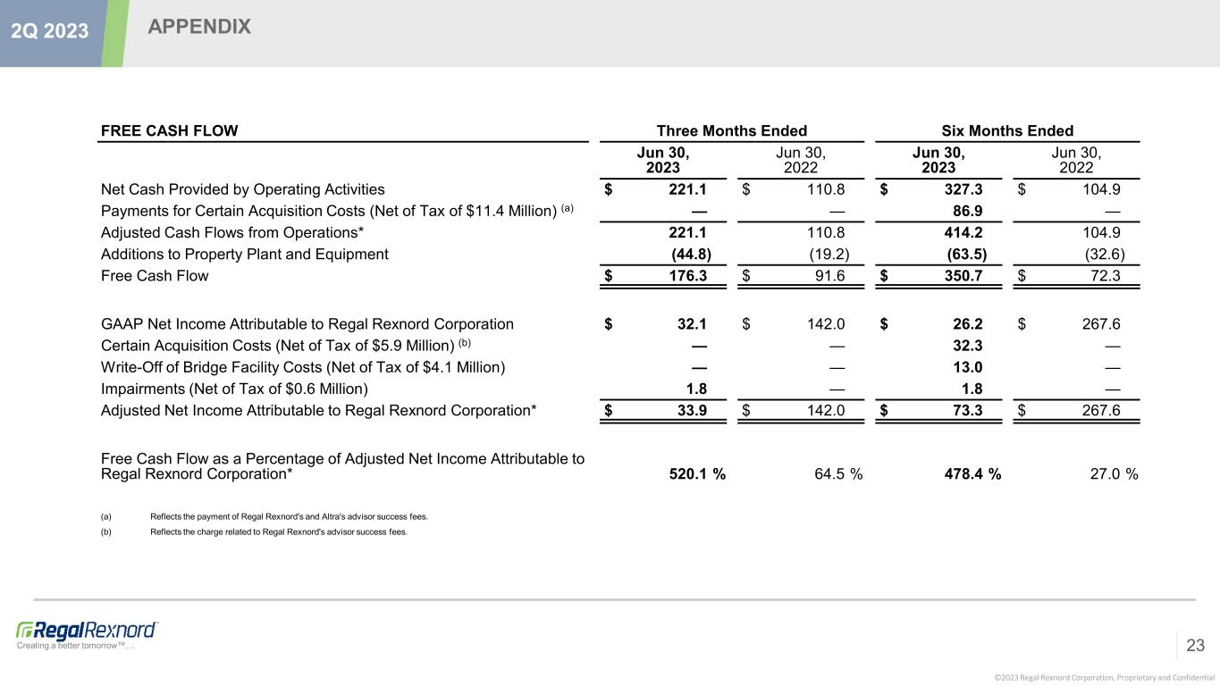 ©2023 Regal Rexnord Corporation, Proprietary and Confidential Creating a better tomorrow™… APPENDIX 23 2Q 2023 FREE CASH FLOW Three Months Ended Six Months Ended Jun 30, 2023 Jun 30, 2022 Jun 30, 2023 Jun 30, 2022 Net Cash Provided by Operating Activities $ 221.1 $ 110.8 $ 327.3 $ 104.9 Payments for Certain Acquisition Costs (Net of Tax of $11.4 Million) (a) — — 86.9 — Adjusted Cash Flows from Operations* 221.1 110.8 414.2 104.9 Additions to Property Plant and Equipment (44.8) (19.2) (63.5) (32.6) Free Cash Flow $ 176.3 $ 91.6 $ 350.7 $ 72.3 GAAP Net Income Attributable to Regal Rexnord Corporation $ 32.1 $ 142.0 $ 26.2 $ 267.6 Certain Acquisition Costs (Net of Tax of $5.9 Million) (b) — — 32.3 — Write-Off of Bridge Facility Costs (Net of Tax of $4.1 Million) — — 13.0 — Impairments (Net of Tax of $0.6 Million) 1.8 — 1.8 — Adjusted Net Income Attributable to Regal Rexnord Corporation* $ 33.9 $ 142.0 $ 73.3 $ 267.6 Free Cash Flow as a Percentage of Adjusted Net Income Attributable to Regal Rexnord Corporation* 520.1 % 64.5 % 478.4 % 27.0 % (a) Reflects the payment of Regal Rexnord's and Altra's advisor success fees. (b) Reflects the charge related to Regal Rexnord's advisor success fees.