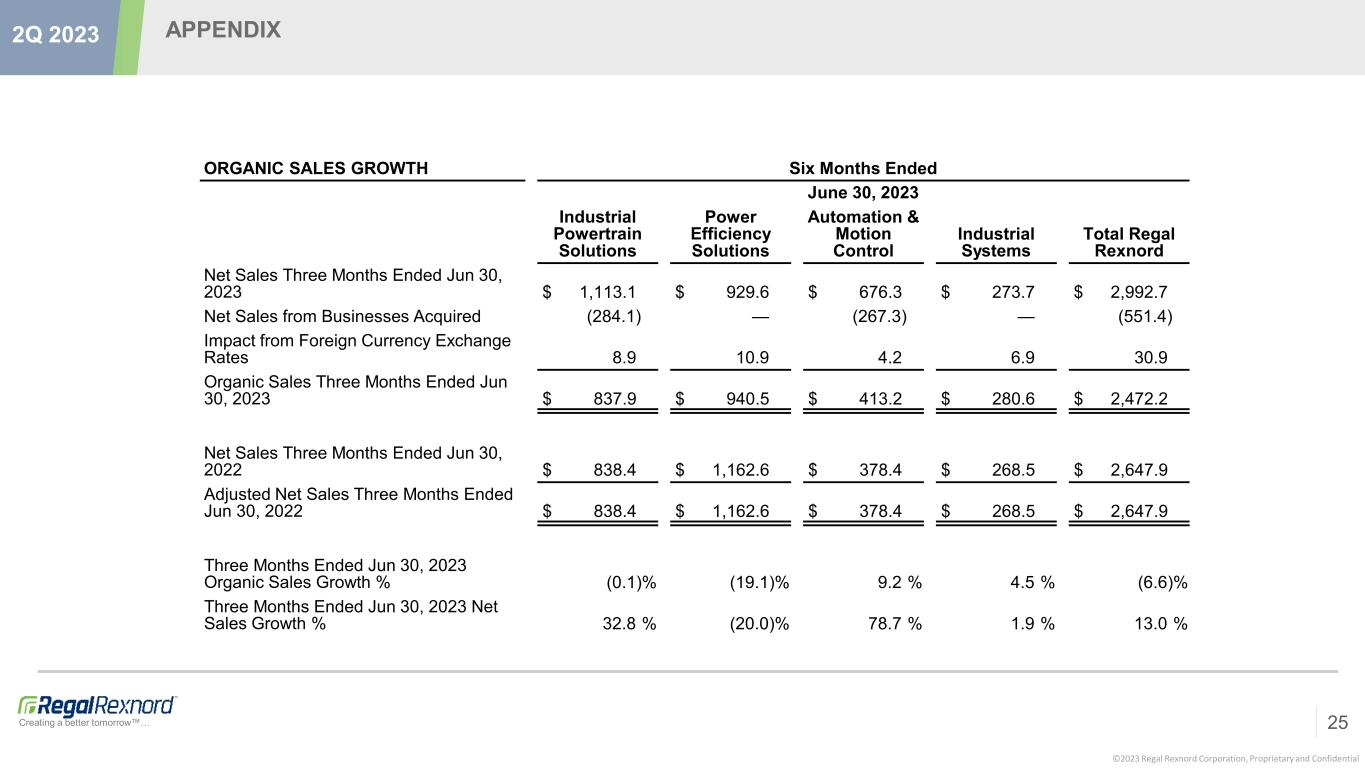 ©2023 Regal Rexnord Corporation, Proprietary and Confidential Creating a better tomorrow™… APPENDIX 24 2Q 2023 ORGANIC SALES GROWTH Three Months Ended June 30, 2023 Industrial Powertrain Solutions Power Efficiency Solutions Automation & Motion Control Industrial Systems Total Regal Rexnord Net Sales Three Months Ended Jun 30, 2023 $ 698.7 $ 460.1 $ 473.1 $ 136.7 $ 1,768.6 Net Sales from Businesses Acquired (284.1) — (267.3) — (551.4) Impact from Foreign Currency Exchange Rates 1.5 3.3 1.6 2.7 9.1 Organic Sales Three Months Ended Jun 30, 2023 $ 416.1 $ 463.4 $ 207.4 $ 139.4 $ 1,226.3 Net Sales Three Months Ended Jun 30, 2022 $ 422.1 $ 595.4 $ 194.1 $ 137.8 $ 1,349.4 Adjusted Net Sales Three Months Ended Jun 30, 2022 $ 422.1 $ 595.4 $ 194.1 $ 137.8 $ 1,349.4 Three Months Ended Jun 30, 2023 Organic Sales Growth % (1.4)% (22.2)% 6.9 % 1.2 % (9.1)% Three Months Ended Jun 30, 2023 Net Sales Growth % 65.5 % (22.7)% 143.7 % (0.8)% 31.1 %