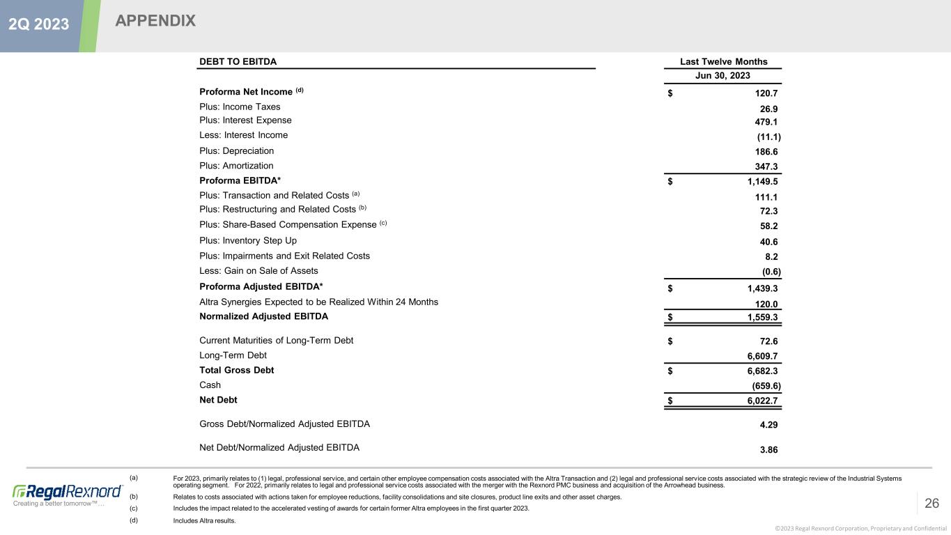 ©2023 Regal Rexnord Corporation, Proprietary and Confidential Creating a better tomorrow™… APPENDIX 26 2Q 2023 DEBT TO EBITDA Last Twelve Months Jun 30, 2023 Proforma Net Income (d) $ 120.7 Plus: Income Taxes 26.9 Plus: Interest Expense 479.1 Less: Interest Income (11.1) Plus: Depreciation 186.6 Plus: Amortization 347.3 Proforma EBITDA* $ 1,149.5 Plus: Transaction and Related Costs (a) 111.1 Plus: Restructuring and Related Costs (b) 72.3 Plus: Share-Based Compensation Expense (c) 58.2 Plus: Inventory Step Up 40.6 Plus: Impairments and Exit Related Costs 8.2 Less: Gain on Sale of Assets (0.6) Proforma Adjusted EBITDA* $ 1,439.3 Altra Synergies Expected to be Realized Within 24 Months 120.0 Normalized Adjusted EBITDA $ 1,559.3 Current Maturities of Long-Term Debt $ 72.6 Long-Term Debt 6,609.7 Total Gross Debt $ 6,682.3 Cash (659.6) Net Debt $ 6,022.7 Gross Debt/Normalized Adjusted EBITDA 4.29 Net Debt/Normalized Adjusted EBITDA 3.86 (a) For 2023, primarily relates to (1) legal, professional service, and certain other employee compensation costs associated with the Altra Transaction and (2) legal and professional service costs associated with the strategic review of the Industrial Systems operating segment. For 2022, primarily relates to legal and professional service costs associated with the merger with the Rexnord PMC business and acquisition of the Arrowhead business. (b) Relates to costs associated with actions taken for employee reductions, facility consolidations and site closures, product line exits and other asset charges. (c) Includes the impact related to the accelerated vesting of awards for certain former Altra employees in the first quarter 2023. (d) Includes Altra results.