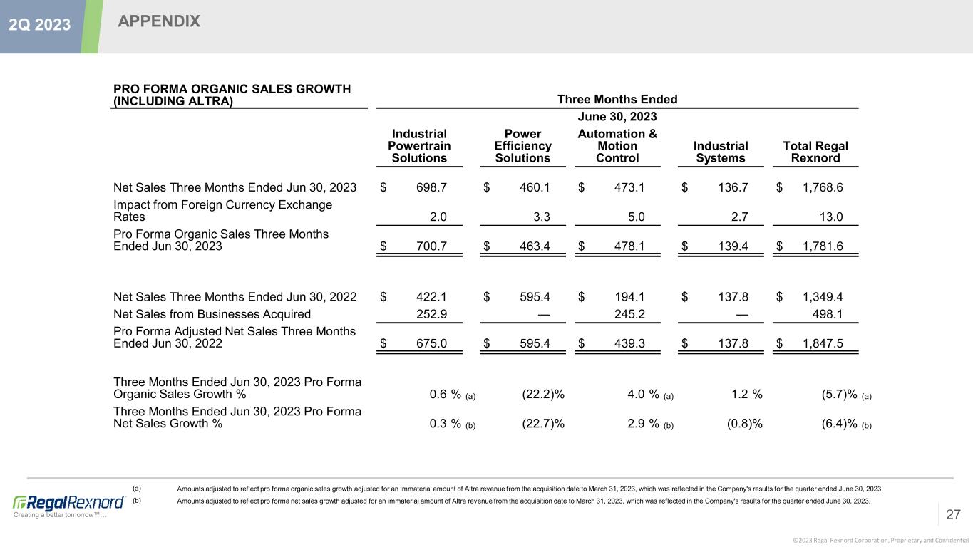©2023 Regal Rexnord Corporation, Proprietary and Confidential Creating a better tomorrow™… APPENDIX 27 2Q 2023 PRO FORMA ORGANIC SALES GROWTH (INCLUDING ALTRA) Three Months Ended June 30, 2023 Industrial Powertrain Solutions Power Efficiency Solutions Automation & Motion Control Industrial Systems Total Regal Rexnord Net Sales Three Months Ended Jun 30, 2023 $ 698.7 $ 460.1 $ 473.1 $ 136.7 $ 1,768.6 Impact from Foreign Currency Exchange Rates 2.0 3.3 5.0 2.7 13.0 Pro Forma Organic Sales Three Months Ended Jun 30, 2023 $ 700.7 $ 463.4 $ 478.1 $ 139.4 $ 1,781.6 Net Sales Three Months Ended Jun 30, 2022 $ 422.1 $ 595.4 $ 194.1 $ 137.8 $ 1,349.4 Net Sales from Businesses Acquired 252.9 — 245.2 — 498.1 Pro Forma Adjusted Net Sales Three Months Ended Jun 30, 2022 $ 675.0 $ 595.4 $ 439.3 $ 137.8 $ 1,847.5 Three Months Ended Jun 30, 2023 Pro Forma Organic Sales Growth % 0.6 % (a) (22.2)% 4.0 % (a) 1.2 % (5.7)% (a) Three Months Ended Jun 30, 2023 Pro Forma Net Sales Growth % 0.3 % (b) (22.7)% 2.9 % (b) (0.8)% (6.4)% (b) (a) Amounts adjusted to reflect pro forma organic sales growth adjusted for an immaterial amount of Altra revenue from the acquisition date to March 31, 2023, which was reflected in the Company's results for the quarter ended June 30, 2023. (b) Amounts adjusted to reflect pro forma net sales growth adjusted for an immaterial amount of Altra revenue from the acquisition date to March 31, 2023, which was reflected in the Company's results for the quarter ended June 30, 2023.