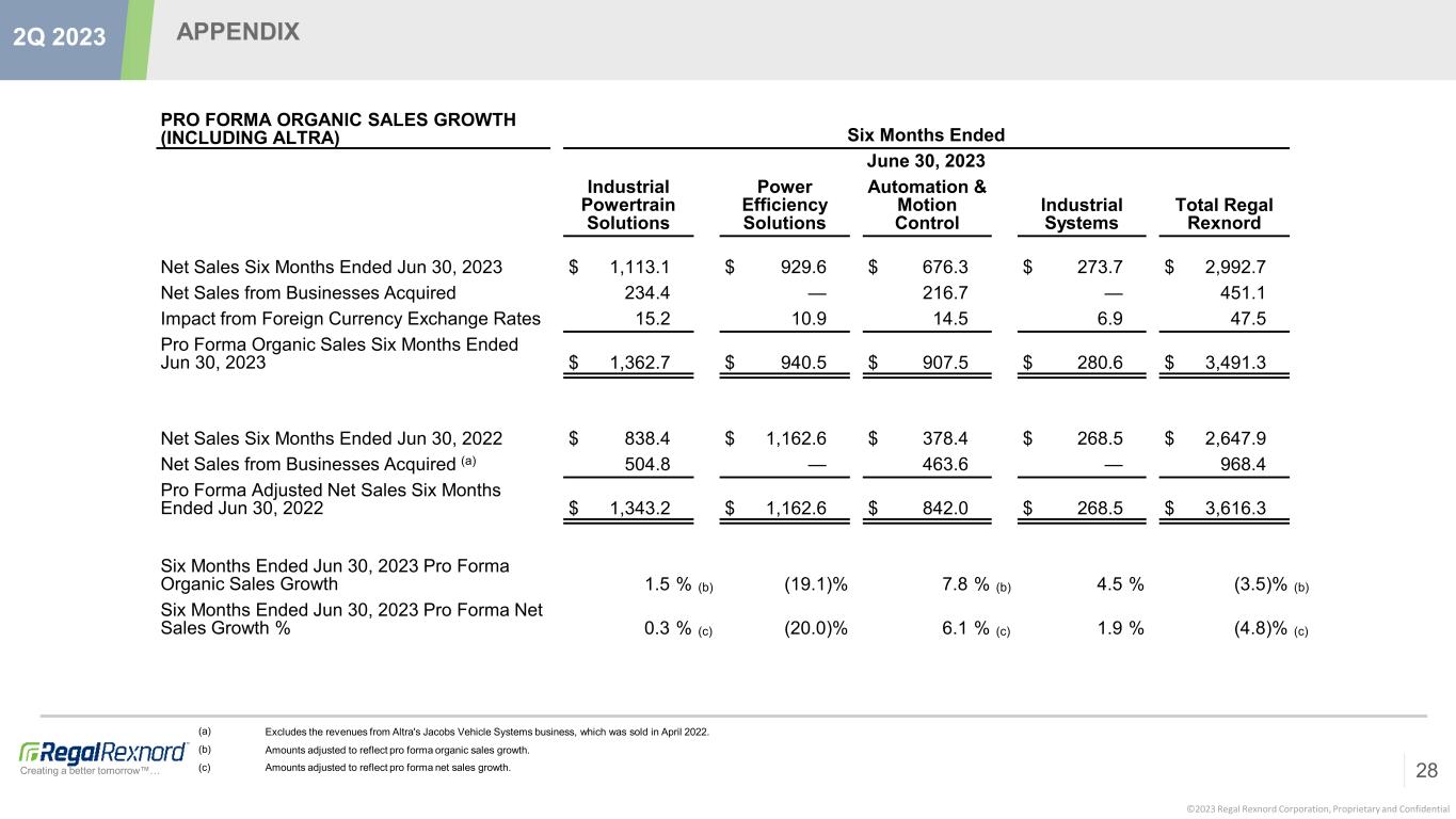 ©2023 Regal Rexnord Corporation, Proprietary and Confidential Creating a better tomorrow™… APPENDIX 28 2Q 2023 PRO FORMA ORGANIC SALES GROWTH (INCLUDING ALTRA) Six Months Ended June 30, 2023 Industrial Powertrain Solutions Power Efficiency Solutions Automation & Motion Control Industrial Systems Total Regal Rexnord Net Sales Six Months Ended Jun 30, 2023 $ 1,113.1 $ 929.6 $ 676.3 $ 273.7 $ 2,992.7 Net Sales from Businesses Acquired 234.4 — 216.7 — 451.1 Impact from Foreign Currency Exchange Rates 15.2 10.9 14.5 6.9 47.5 Pro Forma Organic Sales Six Months Ended Jun 30, 2023 $ 1,362.7 $ 940.5 $ 907.5 $ 280.6 $ 3,491.3 Net Sales Six Months Ended Jun 30, 2022 $ 838.4 $ 1,162.6 $ 378.4 $ 268.5 $ 2,647.9 Net Sales from Businesses Acquired (a) 504.8 — 463.6 — 968.4 Pro Forma Adjusted Net Sales Six Months Ended Jun 30, 2022 $ 1,343.2 $ 1,162.6 $ 842.0 $ 268.5 $ 3,616.3 Six Months Ended Jun 30, 2023 Pro Forma Organic Sales Growth 1.5 % (b) (19.1)% 7.8 % (b) 4.5 % (3.5)% (b) Six Months Ended Jun 30, 2023 Pro Forma Net Sales Growth % 0.3 % (c) (20.0)% 6.1 % (c) 1.9 % (4.8)% (c) (a) Excludes the revenues from Altra's Jacobs Vehicle Systems business, which was sold in April 2022. (b) Amounts adjusted to reflect pro forma organic sales growth. (c) Amounts adjusted to reflect pro forma net sales growth.