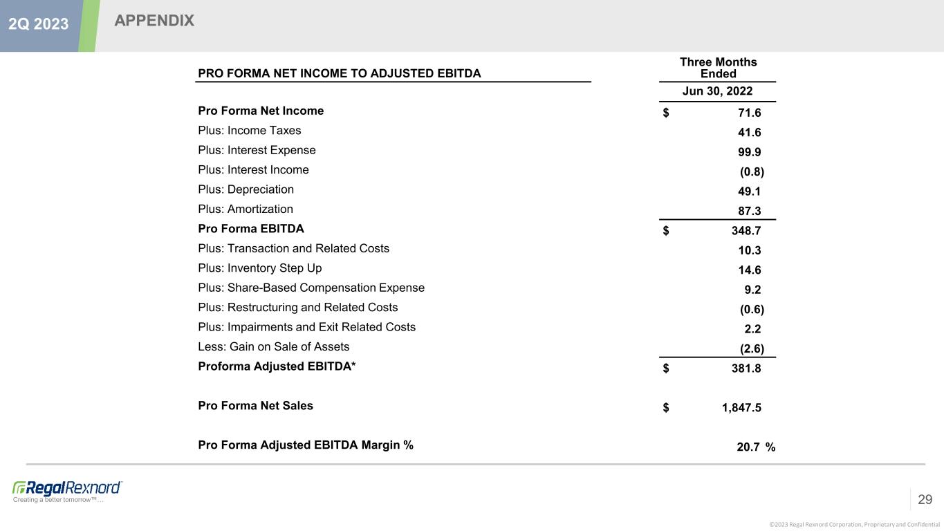 ©2023 Regal Rexnord Corporation, Proprietary and Confidential Creating a better tomorrow™… APPENDIX 29 2Q 2023 PRO FORMA NET INCOME TO ADJUSTED EBITDA Three Months Ended Jun 30, 2022 Pro Forma Net Income $ 71.6 Plus: Income Taxes 41.6 Plus: Interest Expense 99.9 Plus: Interest Income (0.8) Plus: Depreciation 49.1 Plus: Amortization 87.3 Pro Forma EBITDA $ 348.7 Plus: Transaction and Related Costs 10.3 Plus: Inventory Step Up 14.6 Plus: Share-Based Compensation Expense 9.2 Plus: Restructuring and Related Costs (0.6) Plus: Impairments and Exit Related Costs 2.2 Less: Gain on Sale of Assets (2.6) Proforma Adjusted EBITDA* $ 381.8 Pro Forma Net Sales $ 1,847.5 Pro Forma Adjusted EBITDA Margin % 20.7 %