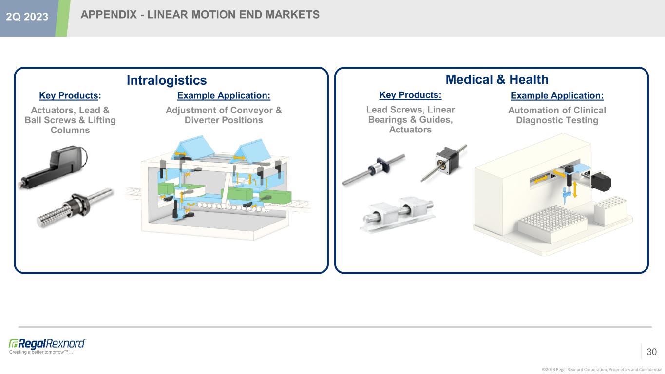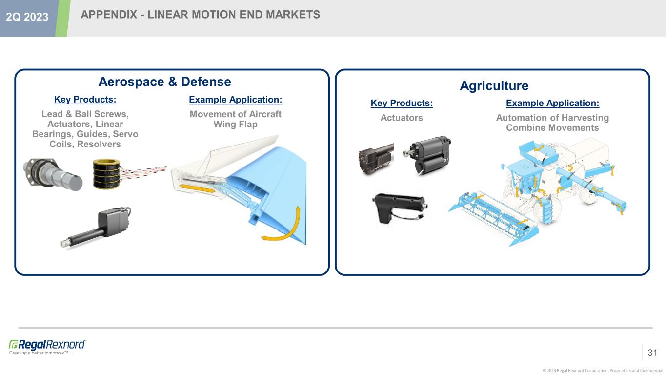 ©2023 Regal Rexnord Corporation, Proprietary and Confidential Creating a better tomorrow™… APPENDIX - LINEAR MOTION END MARKETS 30 2Q 2023 Intralogistics Key Products: Actuators, Lead & Ball Screws & Lifting Columns Example Application: Adjustment of Conveyor & Diverter Positions Medical & Health Key Products: Lead Screws, Linear Bearings & Guides, Actuators Example Application: Automation of Clinical Diagnostic Testing