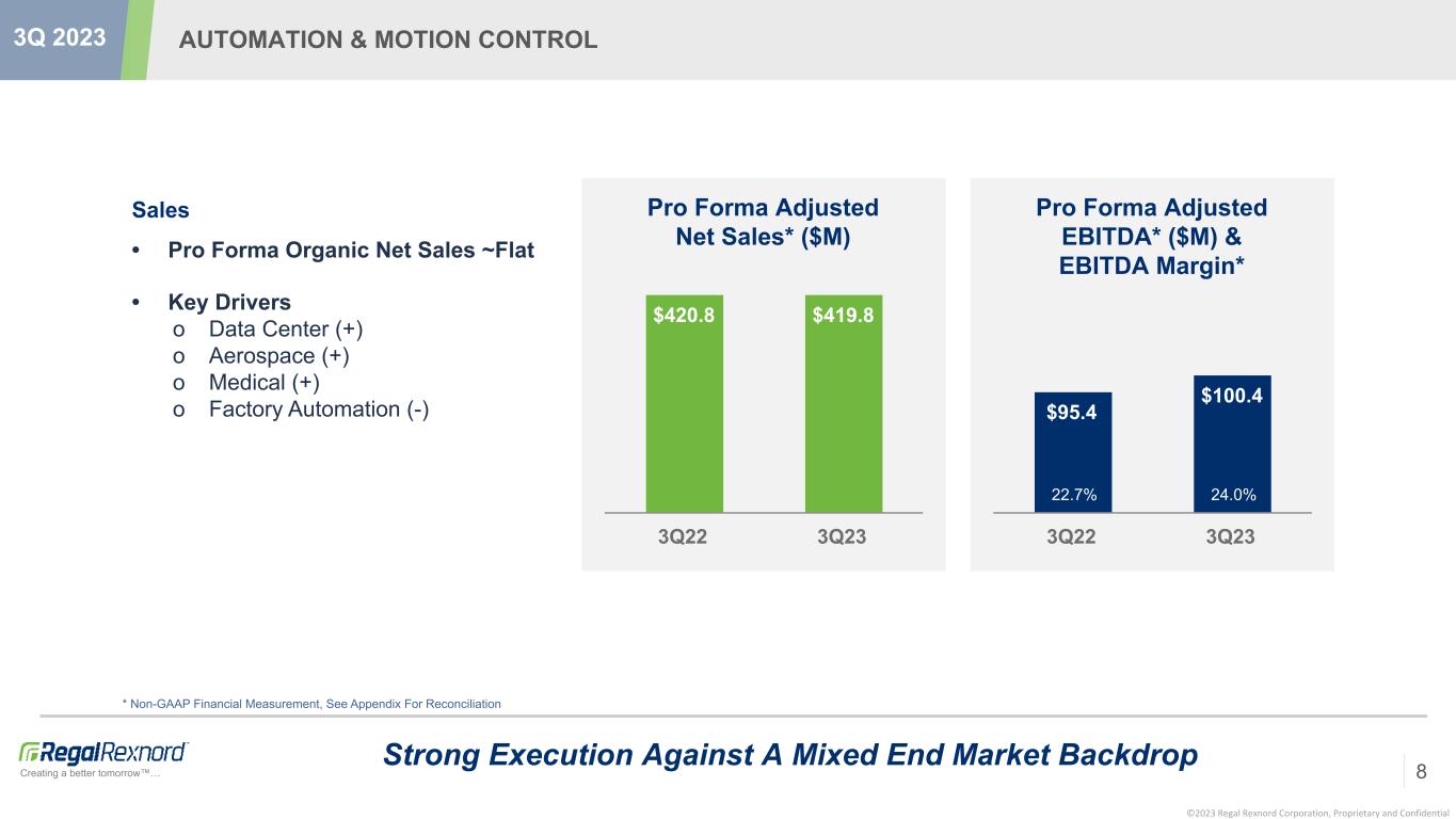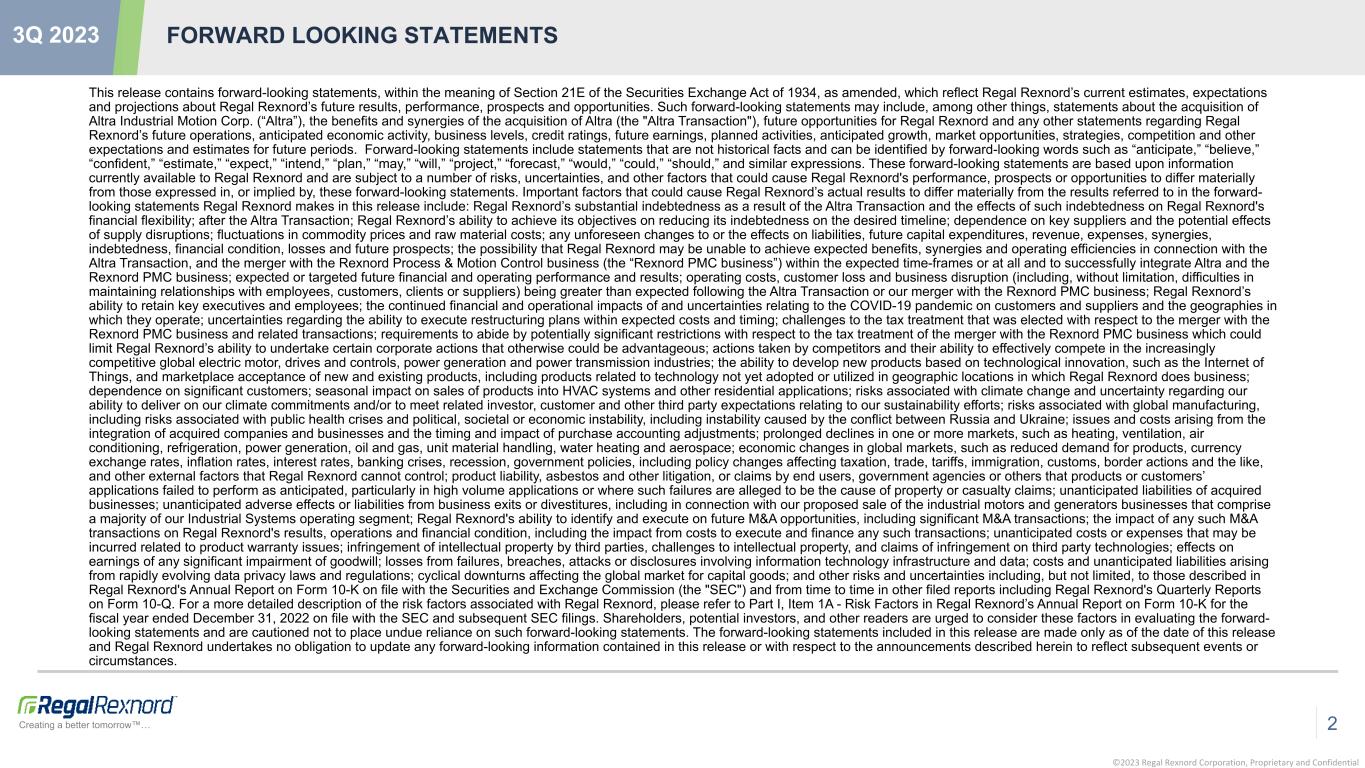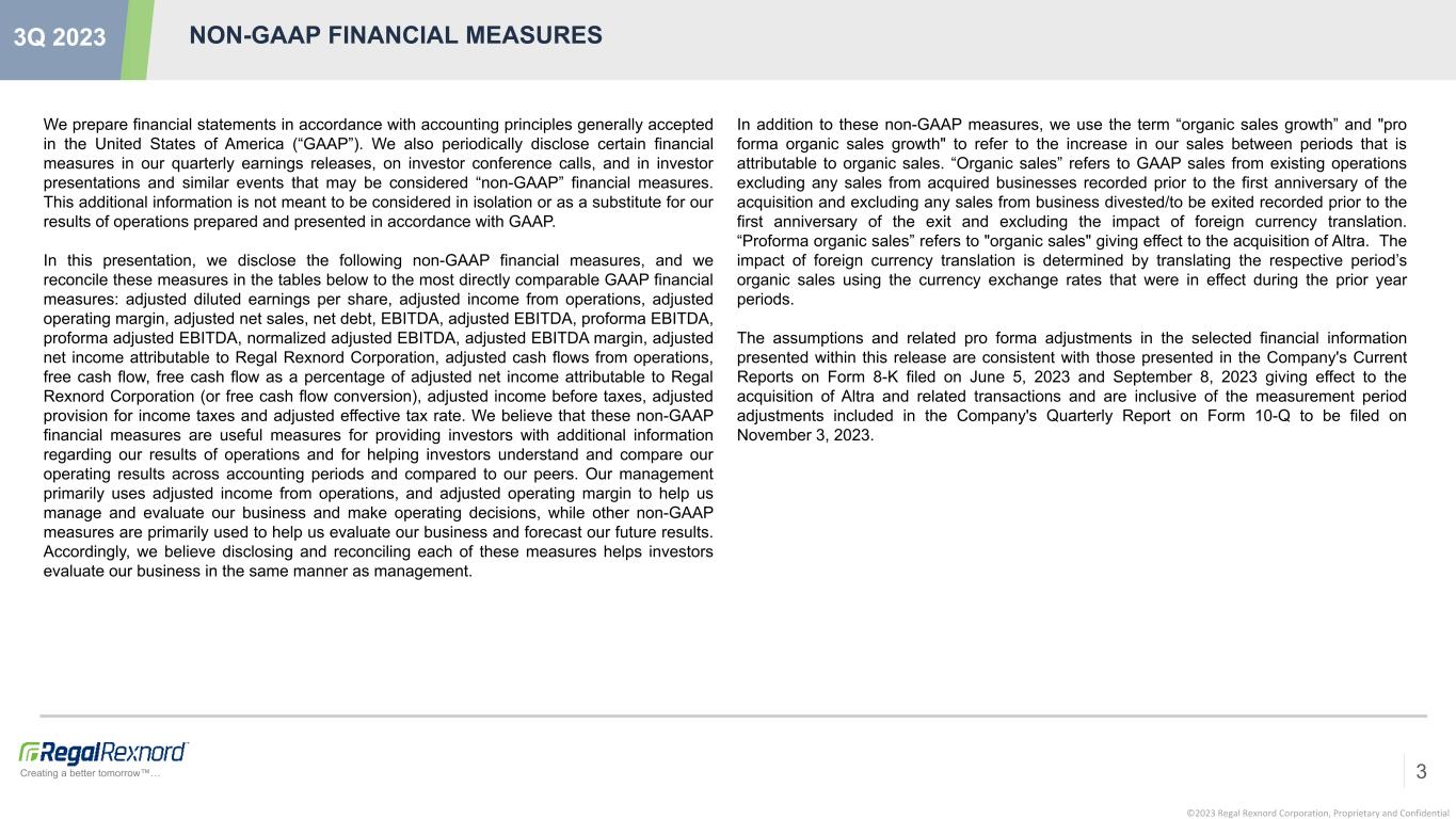 ©2023 Regal Rexnord Corporation, Proprietary and Confidential Creating a better tomorrow™… 3Q 2023 FORWARD LOOKING STATEMENTS 2 This release contains forward-looking statements, within the meaning of Section 21E of the Securities Exchange Act of 1934, as amended, which reflect Regal Rexnord’s current estimates, expectations and projections about Regal Rexnord’s future results, performance, prospects and opportunities. Such forward-looking statements may include, among other things, statements about the acquisition of Altra Industrial Motion Corp. (“Altra”), the benefits and synergies of the acquisition of Altra (the "Altra Transaction"), future opportunities for Regal Rexnord and any other statements regarding Regal Rexnord’s future operations, anticipated economic activity, business levels, credit ratings, future earnings, planned activities, anticipated growth, market opportunities, strategies, competition and other expectations and estimates for future periods. Forward-looking statements include statements that are not historical facts and can be identified by forward-looking words such as “anticipate,” “believe,” “confident,” “estimate,” “expect,” “intend,” “plan,” “may,” “will,” “project,” “forecast,” “would,” “could,” “should,” and similar expressions. These forward-looking statements are based upon information currently available to Regal Rexnord and are subject to a number of risks, uncertainties, and other factors that could cause Regal Rexnord's performance, prospects or opportunities to differ materially from those expressed in, or implied by, these forward-looking statements. Important factors that could cause Regal Rexnord’s actual results to differ materially from the results referred to in the forward- looking statements Regal Rexnord makes in this release include: Regal Rexnord’s substantial indebtedness as a result of the Altra Transaction and the effects of such indebtedness on Regal Rexnord's financial flexibility; after the Altra Transaction; Regal Rexnord’s ability to achieve its objectives on reducing its indebtedness on the desired timeline; dependence on key suppliers and the potential effects of supply disruptions; fluctuations in commodity prices and raw material costs; any unforeseen changes to or the effects on liabilities, future capital expenditures, revenue, expenses, synergies, indebtedness, financial condition, losses and future prospects; the possibility that Regal Rexnord may be unable to achieve expected benefits, synergies and operating efficiencies in connection with the Altra Transaction, and the merger with the Rexnord Process & Motion Control business (the “Rexnord PMC business”) within the expected time-frames or at all and to successfully integrate Altra and the Rexnord PMC business; expected or targeted future financial and operating performance and results; operating costs, customer loss and business disruption (including, without limitation, difficulties in maintaining relationships with employees, customers, clients or suppliers) being greater than expected following the Altra Transaction or our merger with the Rexnord PMC business; Regal Rexnord’s ability to retain key executives and employees; the continued financial and operational impacts of and uncertainties relating to the COVID-19 pandemic on customers and suppliers and the geographies in which they operate; uncertainties regarding the ability to execute restructuring plans within expected costs and timing; challenges to the tax treatment that was elected with respect to the merger with the Rexnord PMC business and related transactions; requirements to abide by potentially significant restrictions with respect to the tax treatment of the merger with the Rexnord PMC business which could limit Regal Rexnord’s ability to undertake certain corporate actions that otherwise could be advantageous; actions taken by competitors and their ability to effectively compete in the increasingly competitive global electric motor, drives and controls, power generation and power transmission industries; the ability to develop new products based on technological innovation, such as the Internet of Things, and marketplace acceptance of new and existing products, including products related to technology not yet adopted or utilized in geographic locations in which Regal Rexnord does business; dependence on significant customers; seasonal impact on sales of products into HVAC systems and other residential applications; risks associated with climate change and uncertainty regarding our ability to deliver on our climate commitments and/or to meet related investor, customer and other third party expectations relating to our sustainability efforts; risks associated with global manufacturing, including risks associated with public health crises and political, societal or economic instability, including instability caused by the conflict between Russia and Ukraine; issues and costs arising from the integration of acquired companies and businesses and the timing and impact of purchase accounting adjustments; prolonged declines in one or more markets, such as heating, ventilation, air conditioning, refrigeration, power generation, oil and gas, unit material handling, water heating and aerospace; economic changes in global markets, such as reduced demand for products, currency exchange rates, inflation rates, interest rates, banking crises, recession, government policies, including policy changes affecting taxation, trade, tariffs, immigration, customs, border actions and the like, and other external factors that Regal Rexnord cannot control; product liability, asbestos and other litigation, or claims by end users, government agencies or others that products or customers’ applications failed to perform as anticipated, particularly in high volume applications or where such failures are alleged to be the cause of property or casualty