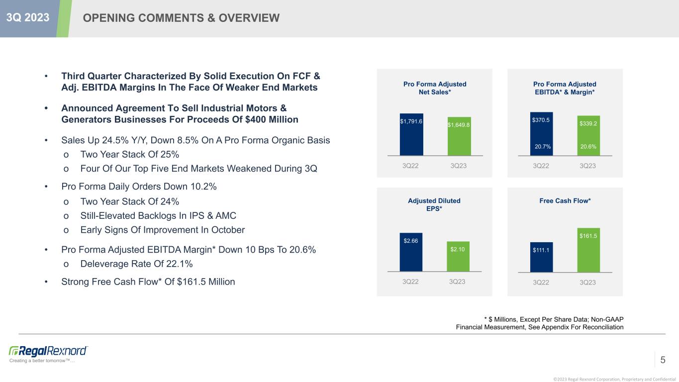 ©2023 Regal Rexnord Corporation, Proprietary and Confidential Creating a better tomorrow™… NON-GAAP FINANCIAL MEASURES 3 3Q 2023 We prepare financial statements in accordance with accounting principles generally accepted in the United States of America (“GAAP”). We also periodically disclose certain financial measures in our quarterly earnings releases, on investor conference calls, and in investor presentations and similar events that may be considered “non-GAAP” financial measures. This additional information is not meant to be considered in isolation or as a substitute for our results of operations prepared and presented in accordance with GAAP. In this presentation, we disclose the following non-GAAP financial measures, and we reconcile these measures in the tables below to the most directly comparable GAAP financial measures: adjusted diluted earnings per share, adjusted income from operations, adjusted operating margin, adjusted net sales, net debt, EBITDA, adjusted EBITDA, proforma EBITDA, proforma adjusted EBITDA, normalized adjusted EBITDA, adjusted EBITDA margin, adjusted net income attributable to Regal Rexnord Corporation, adjusted cash flows from operations, free cash flow, free cash flow as a percentage of adjusted net income attributable to Regal Rexnord Corporation (or free cash flow conversion), adjusted income before taxes, adjusted provision for income taxes and adjusted effective tax rate. We believe that these non-GAAP financial measures are useful measures for providing investors with additional information regarding our results of operations and for helping investors understand and compare our operating results across accounting periods and compared to our peers. Our management primarily uses adjusted income from operations, and adjusted operating margin to help us manage and evaluate our business and make operating decisions, while other non-GAAP measures are primarily used to help us evaluate our business and forecast our future results. Accordingly, we believe disclosing and reconciling each of these measures helps investors evaluate our business in the same manner as management. In addition to these non-GAAP measures, we use the term “organic sales growth” and "pro forma organic sales growth" to refer to the increase in our sales between periods that is attributable to organic sales. “Organic sales” refers to GAAP sales from existing operations excluding any sales from acquired businesses recorded prior to the first anniversary of the acquisition and excluding any sales from business divested/to be exited recorded prior to the first anniversary of the exit and excluding the impact of foreign currency translation. “Proforma organic sales” refers to "organic sales" giving effect to the acquisition of Altra. The impact of foreign currency translation is determined by translating the respective period’s organic sales using the currency exchange rates that were in effect during the prior year periods. The assumptions and related pro forma adjustments in the selected financial information presented within this release are consistent with those presented in the Company's Current Reports on Form 8-K filed on June 5, 2023 and September 8, 2023 giving effect to the acquisition of Altra and related transactions and are inclusive of the measurement period adjustments included in the Company's Quarterly Report on Form 10-Q to be filed on November 3, 2023.