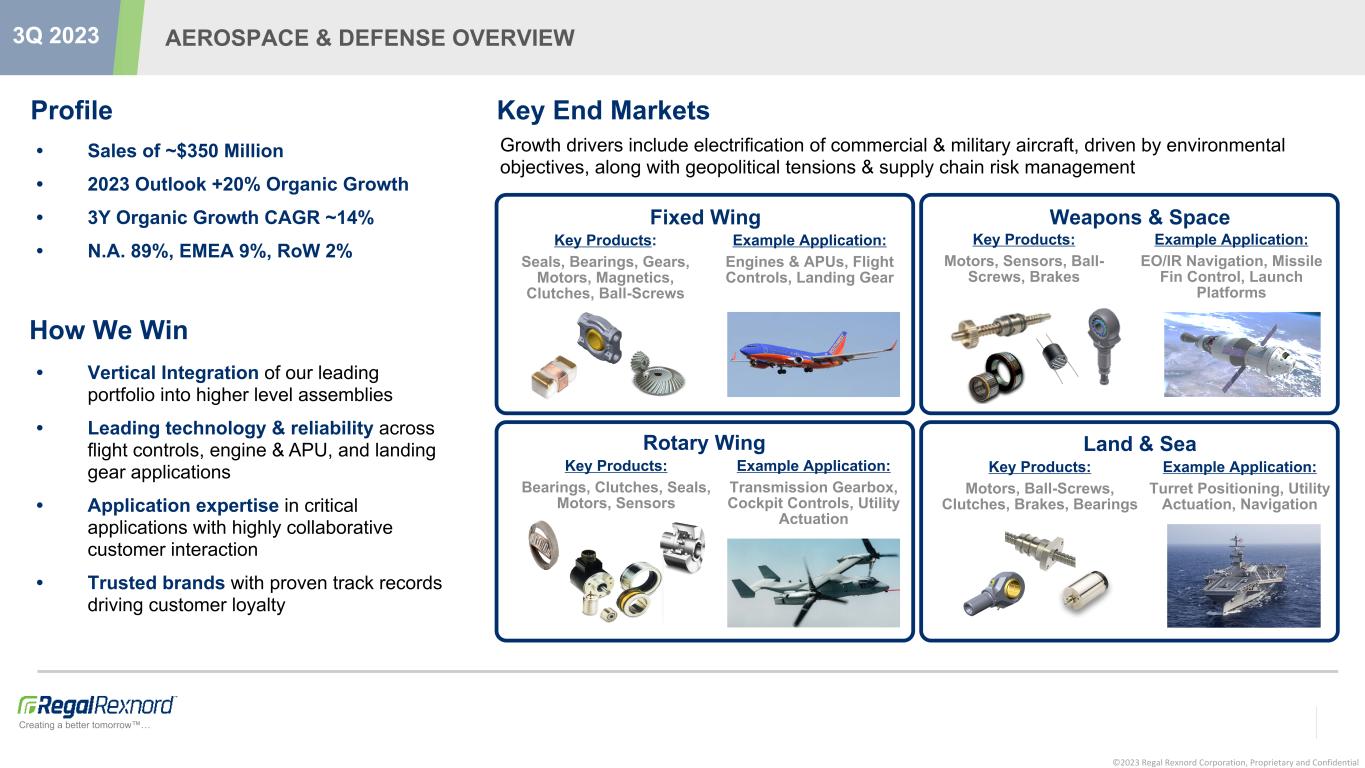 ©2023 Regal Rexnord Corporation, Proprietary and Confidential Creating a better tomorrow™… AEROSPACE & DEFENSE OVERVIEW 3Q 2023 6 Profile • Vertical Integration of our leading portfolio into higher level assemblies • Leading technology & reliability across flight controls, engine & APU, and landing gear applications • Application expertise in critical applications with highly collaborative customer interaction • Trusted brands with proven track records driving customer loyalty How We Win Key End Markets Growth drivers include electrification of commercial & military aircraft, driven by environmental objectives, along with geopolitical tensions & supply chain risk management Fixed Wing Key Products: Seals, Bearings, Gears, Motors, Magnetics, Clutches, Ball-Screws Weapons & Space Rotary Wing Key Products: Bearings, Clutches, Seals, Motors, Sensors Land & Sea Key Products: Motors, Sensors, Ball- Screws, Brakes Key Products: Motors, Ball-Screws, Clutches, Brakes, Bearings Example Application: Engines & APUs, Flight Controls, Landing Gear Example Application: Transmission Gearbox, Cockpit Controls, Utility Actuation Example Application: EO/IR Navigation, Missile Fin Control, Launch Platforms Example Application: Turret Positioning, Utility Actuation, Navigation • Sales of ~$350 Million • 2023 Outlook +20% Organic Growth • 3Y Organic Growth CAGR ~14% • N.A. 89%, EMEA 9%, RoW 2%