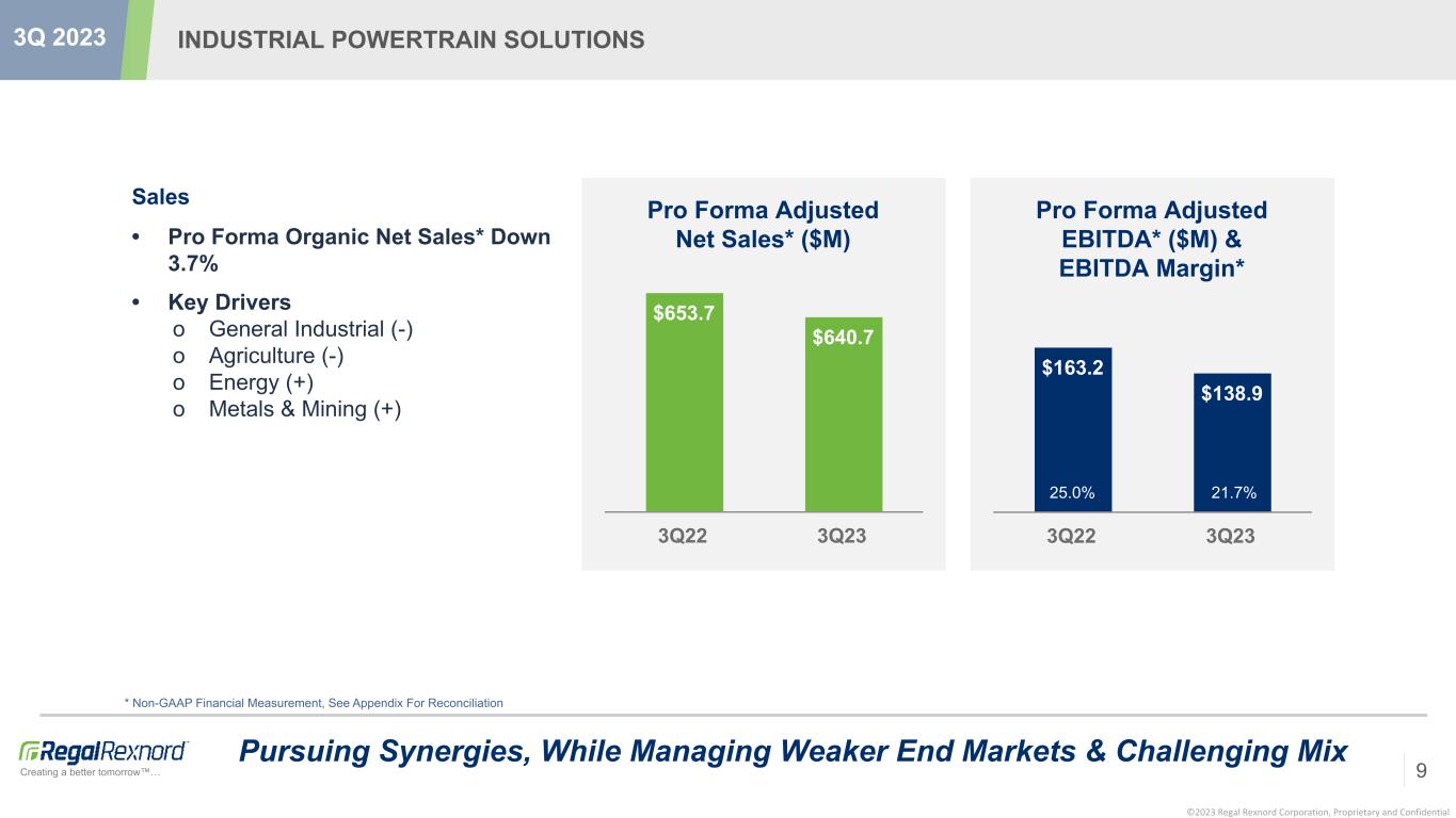 ©2023 Regal Rexnord Corporation, Proprietary and Confidential Creating a better tomorrow™… Sales • Pro Forma Organic Net Sales ~Flat • Key Drivers o Data Center (+) o Aerospace (+) o Medical (+) o Factory Automation (-) AUTOMATION & MOTION CONTROL * Non-GAAP Financial Measurement, See Appendix For Reconciliation Strong Execution Against A Mixed End Market Backdrop 8 3Q 2023 Pro Forma Adjusted Net Sales* ($M) $420.8 $419.8 3Q22 3Q23 Pro Forma Adjusted EBITDA* ($M) & EBITDA Margin* $95.4 $100.4 3Q22 3Q23 22.7% 24.0%