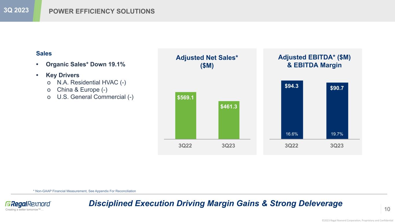 ©2023 Regal Rexnord Corporation, Proprietary and Confidential Creating a better tomorrow™… Sales • Pro Forma Organic Net Sales* Down 3.7% • Key Drivers o General Industrial (-) o Agriculture (-) o Energy (+) o Metals & Mining (+) INDUSTRIAL POWERTRAIN SOLUTIONS * Non-GAAP Financial Measurement, See Appendix For Reconciliation Pursuing Synergies, While Managing Weaker End Markets & Challenging Mix 9 3Q 2023 $235.2 $53. 5 $43. 4 Pro Forma Adjusted Net Sales* ($M) $653.7 $640.7 3Q22 3Q23 Pro Forma Adjusted EBITDA* ($M) & EBITDA Margin* $163.2 $1 8.9 3Q22 3Q23 25.0% 21.7%