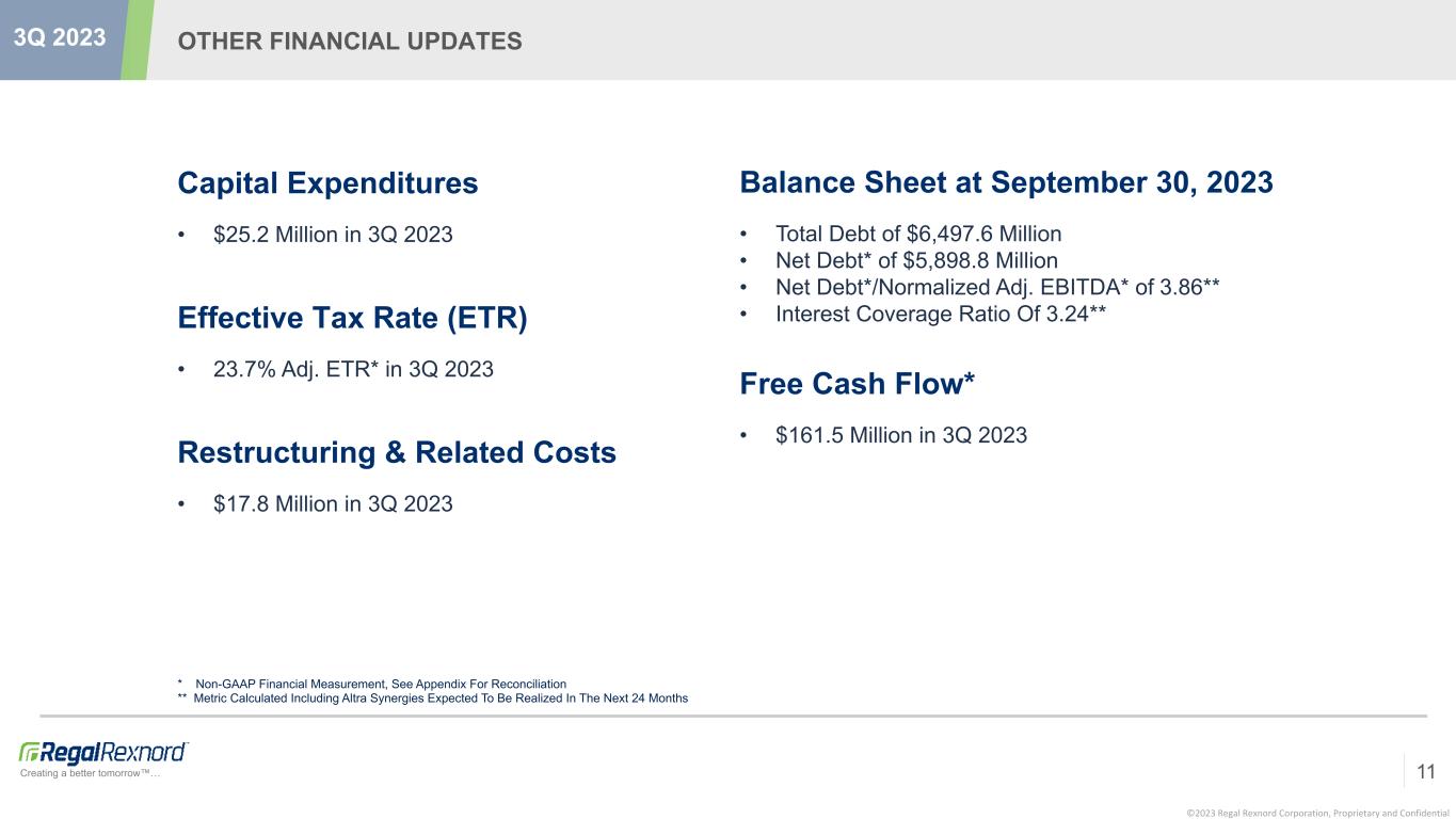 ©2023 Regal Rexnord Corporation, Proprietary and Confidential Creating a better tomorrow™… POWER EFFICIENCY SOLUTIONS * Non-GAAP Financial Measurement, See Appendix For Reconciliation Disciplined Execution Driving Margin Gains & Strong Deleverage Sales • Organic Sales* Down 19.1% • Key Drivers o N.A. Residential HVAC (-) o China & Europe (-) o U.S. General Commercial (-) $21.3 $39.0 10 $189.8 3Q 2023 $135. 7 $165. 5 Adjusted Net Sales* ($M) $569.1 $461.3 3Q22 3Q23 Adjusted EBITDA* ($M) & EBITDA Margin $94.3 $90.7 3Q22 3Q23 16.6% 19.7%