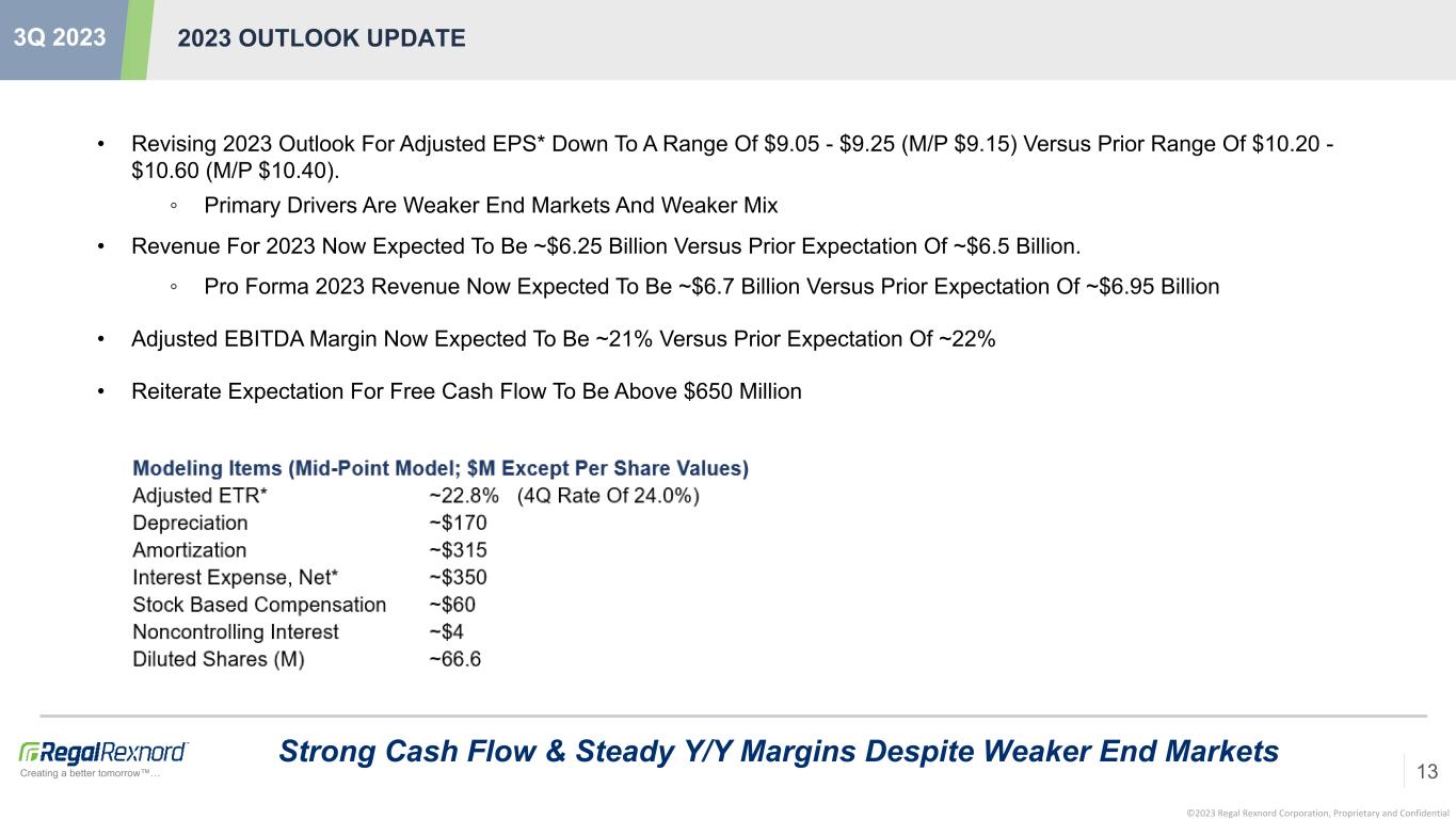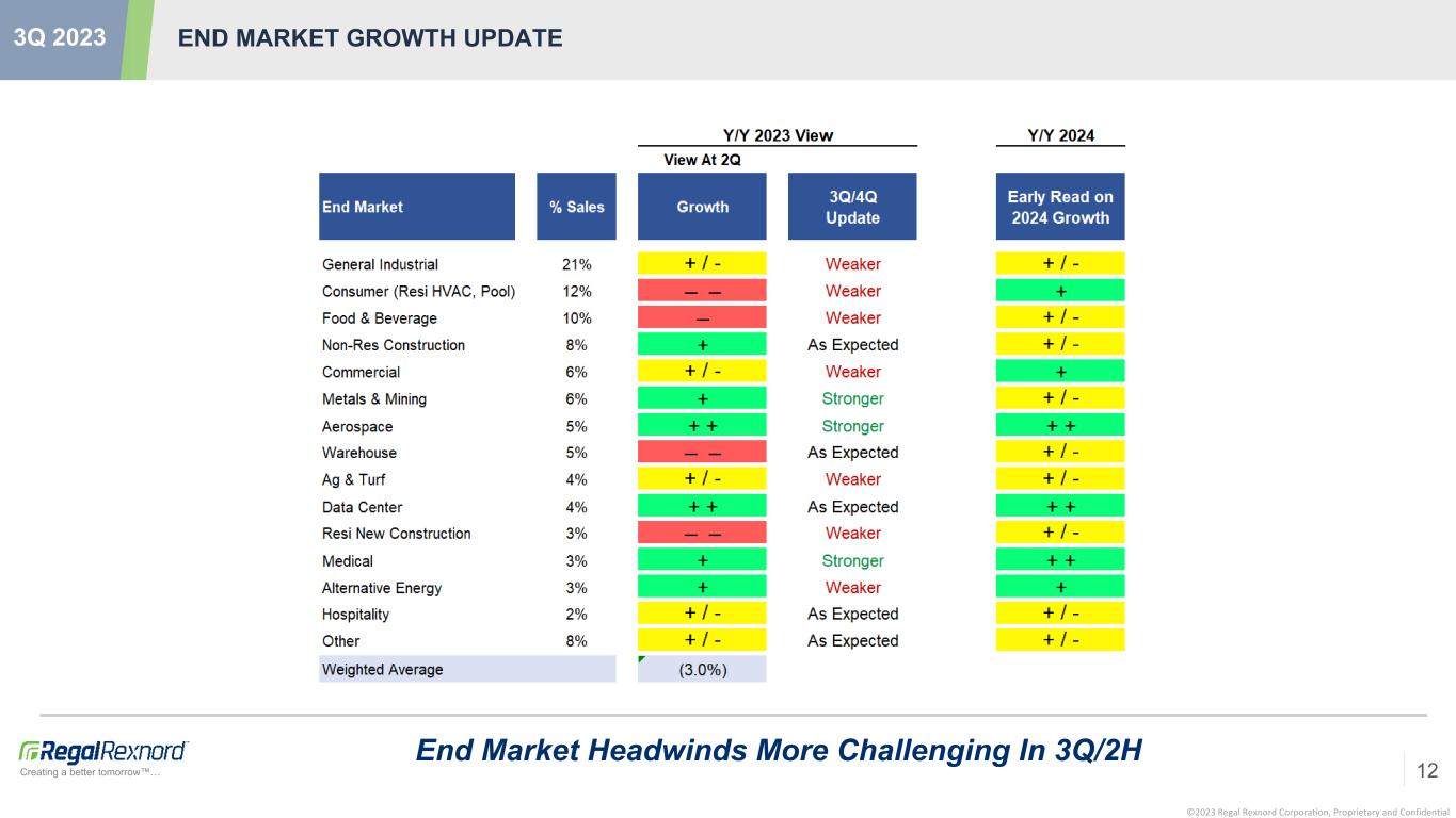 ©2023 Regal Rexnord Corporation, Proprietary and Confidential Creating a better tomorrow™… End Market Headwinds More Challenging In 3Q/2H END MARKET GROWTH UPDATE 12 3Q 2023