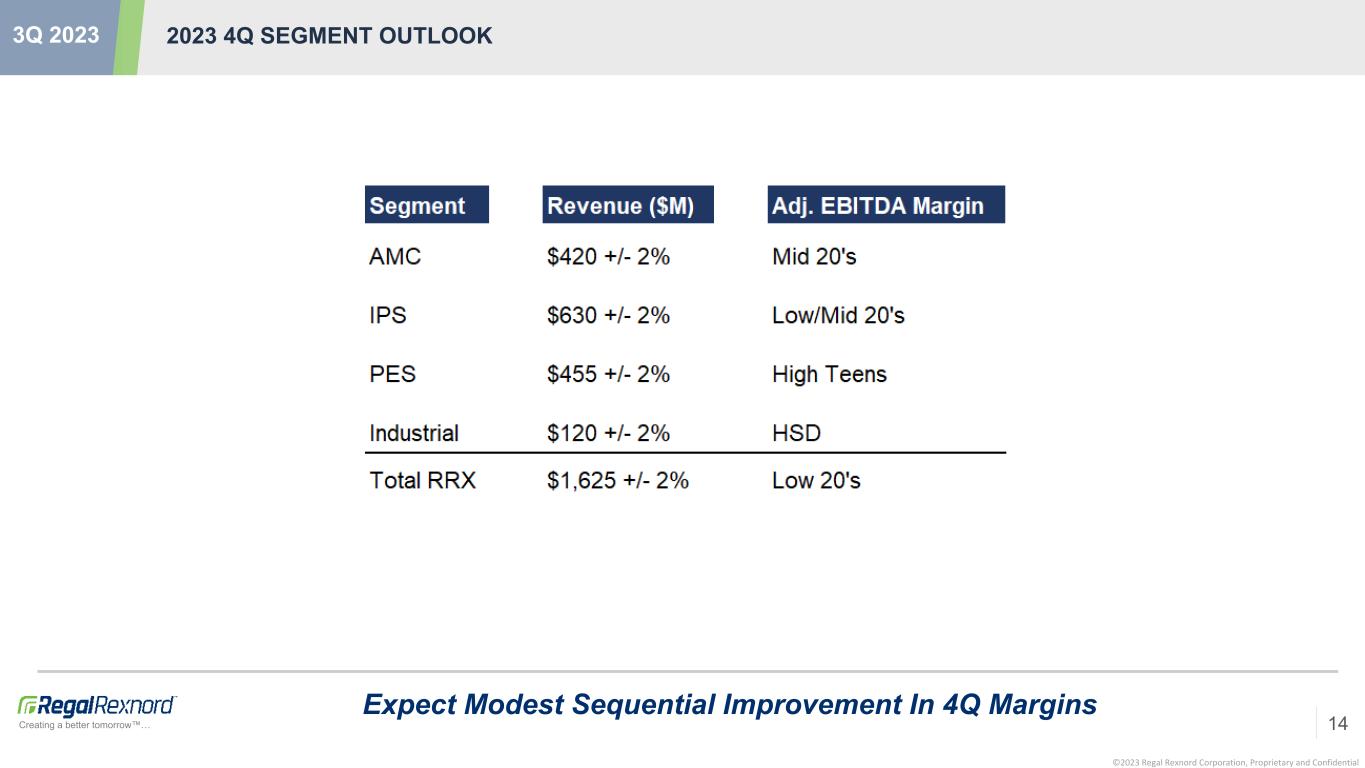 ©2023 Regal Rexnord Corporation, Proprietary and Confidential Creating a better tomorrow™… Strong Cash Flow & Steady Y/Y Margins Despite Weaker End Markets 2023 OUTLOOK UPDATE 13 3Q 2023 • Revising 2023 Outlook For Adjusted EPS* Down To A Range Of $9.05 - $9.25 (M/P $9.15) Versus Prior Range Of $10.20 - $10.60 (M/P $10.40). ◦ Primary Drivers Are Weaker End Markets And Weaker Mix • Revenue For 2023 Now Expected To Be ~$6.25 Billion Versus Prior Expectation Of ~$6.5 Billion. ◦ Pro Forma 2023 Revenue Now Expected To Be ~$6.7 Billion Versus Prior Expectation Of ~$6.95 Billion • Adjusted EBITDA Margin Now Expected To Be ~21% Versus Prior Expectation Of ~22% • Reiterate Expectation For Free Cash Flow To Be Above $650 Million