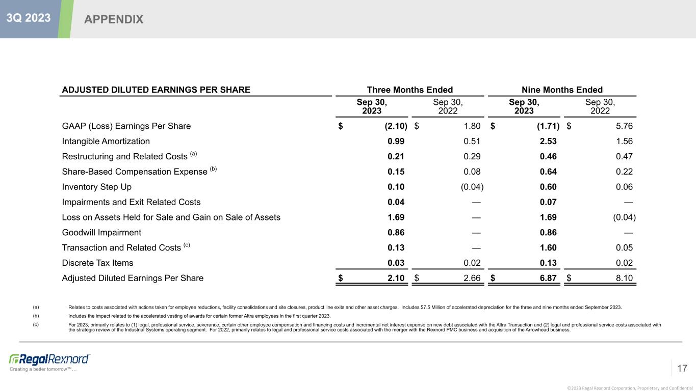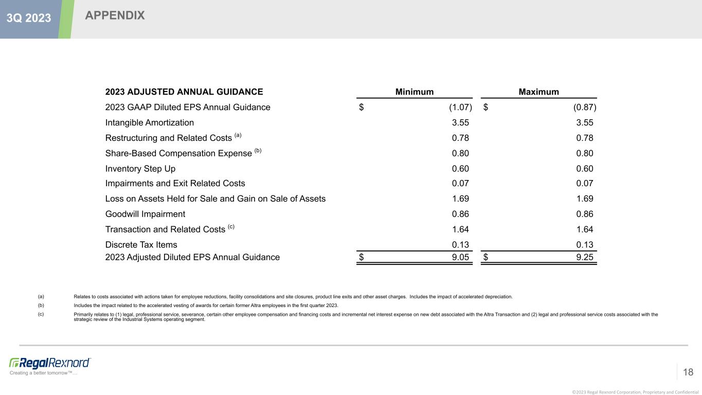 ©2023 Regal Rexnord Corporation, Proprietary and Confidential Creating a better tomorrow™… APPENDIX 17 3Q 2023 ADJUSTED DILUTED EARNINGS PER SHARE Three Months Ended Nine Months Ended Sep 30, 2023 Sep 30, 2022 Sep 30, 2023 Sep 30, 2022 GAAP (Loss) Earnings Per Share $ (2.10) $ 1.80 $ (1.71) $ 5.76 Intangible Amortization 0.99 0.51 2.53 1.56 Restructuring and Related Costs (a) 0.21 0.29 0.46 0.47 Share-Based Compensation Expense (b) 0.15 0.08 0.64 0.22 Inventory Step Up 0.10 (0.04) 0.60 0.06 Impairments and Exit Related Costs 0.04 — 0.07 — Loss on Assets Held for Sale and Gain on Sale of Assets 1.69 — 1.69 (0.04) Goodwill Impairment 0.86 — 0.86 — Transaction and Related Costs (c) 0.13 — 1.60 0.05 Discrete Tax Items 0.03 0.02 0.13 0.02 Adjusted Diluted Earnings Per Share $ 2.10 $ 2.66 $ 6.87 $ 8.10 (a) Relates to costs associated with actions taken for employee reductions, facility consolidations and site closures, product line exits and other asset charges. Includes $7.5 Million of accelerated depreciation for the three and nine months ended September 2023. (b) Includes the impact related to the accelerated vesting of awards for certain former Altra employees in the first quarter 2023. (c) For 2023, primarily relates to (1) legal, professional service, severance, certain other employee compensation and financing costs and incremental net interest expense on new debt associated with the Altra Transaction and (2) legal and professional service costs associated with the strategic review of the Industrial Systems operating segment. For 2022, primarily relates to legal and professional service costs associated with the merger with the Rexnord PMC business and acquisition of the Arrowhead business.