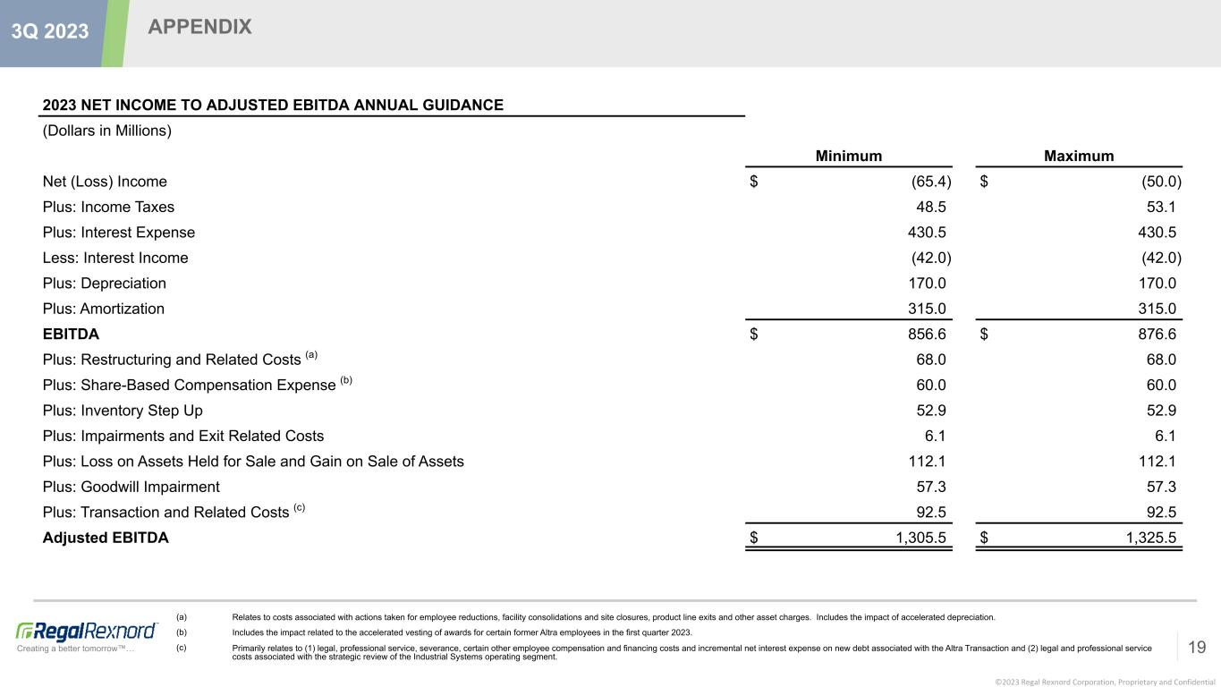 ©2023 Regal Rexnord Corporation, Proprietary and Confidential Creating a better tomorrow™… APPENDIX 18 3Q 2023 2023 ADJUSTED ANNUAL GUIDANCE Minimum Maximum 2023 GAAP Diluted EPS Annual Guidance $ (1.07) $ (0.87) Intangible Amortization 3.55 3.55 Restructuring and Related Costs (a) 0.78 0.78 Share-Based Compensation Expense (b) 0.80 0.80 Inventory Step Up 0.60 0.60 Impairments and Exit Related Costs 0.07 0.07 Loss on Assets Held for Sale and Gain on Sale of Assets 1.69 1.69 Goodwill Impairment 0.86 0.86 Transaction and Related Costs (c) 1.64 1.64 Discrete Tax Items 0.13 0.13 2023 Adjusted Diluted EPS Annual Guidance $ 9.05 $ 9.25 (a) Relates to costs associated with actions taken for employee reductions, facility consolidations and site closures, product line exits and other asset charges. Includes the impact of accelerated depreciation. (b) Includes the impact related to the accelerated vesting of awards for certain former Altra employees in the first quarter 2023. (c) Primarily relates to (1) legal, professional service, severance, certain other employee compensation and financing costs and incremental net interest expense on new debt associated with the Altra Transaction and (2) legal and professional service costs associated with the strategic review of the Industrial Systems operating segment.