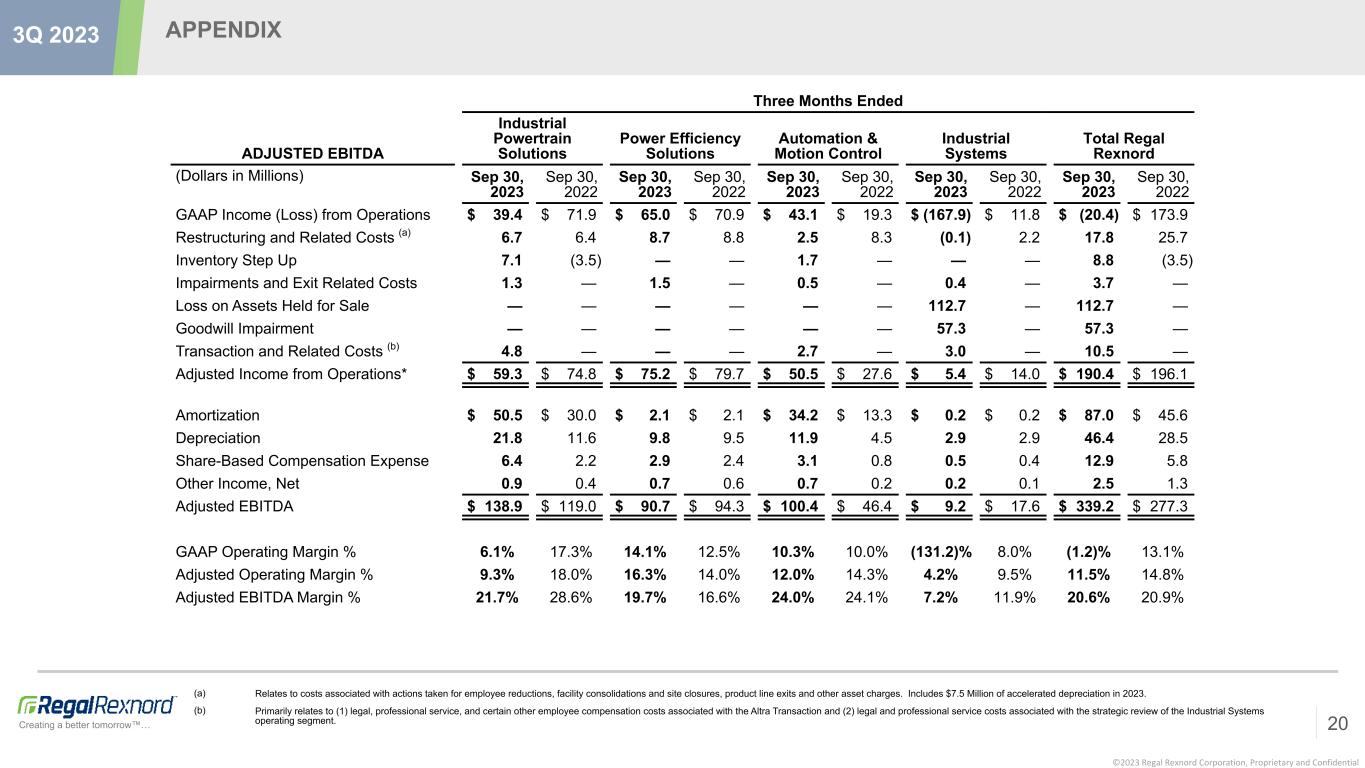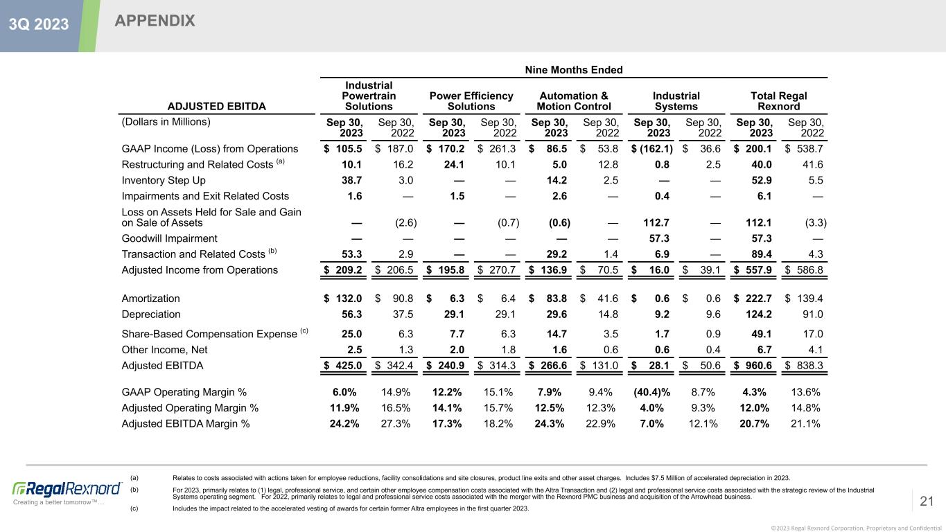 ©2023 Regal Rexnord Corporation, Proprietary and Confidential Creating a better tomorrow™… APPENDIX 20 3Q 2023 Three Months Ended ADJUSTED EBITDA Industrial Powertrain Solutions Power Efficiency Solutions Automation & Motion Control Industrial Systems Total Regal Rexnord (Dollars in Millions) Sep 30, 2023 Sep 30, 2022 Sep 30, 2023 Sep 30, 2022 Sep 30, 2023 Sep 30, 2022 Sep 30, 2023 Sep 30, 2022 Sep 30, 2023 Sep 30, 2022 GAAP Income (Loss) from Operations $ 39.4 $ 71.9 $ 65.0 $ 70.9 $ 43.1 $ 19.3 $ (167.9) $ 11.8 $ (20.4) $ 173.9 Restructuring and Related Costs (a) 6.7 6.4 8.7 8.8 2.5 8.3 (0.1) 2.2 17.8 25.7 Inventory Step Up 7.1 (3.5) — — 1.7 — — — 8.8 (3.5) Impairments and Exit Related Costs 1.3 — 1.5 — 0.5 — 0.4 — 3.7 — Loss on Assets Held for Sale — — — — — — 112.7 — 112.7 — Goodwill Impairment — — — — — — 57.3 — 57.3 — Transaction and Related Costs (b) 4.8 — — — 2.7 — 3.0 — 10.5 — Adjusted Income from Operations* $ 59.3 $ 74.8 $ 75.2 $ 79.7 $ 50.5 $ 27.6 $ 5.4 $ 14.0 $ 190.4 $ 196.1 Amortization $ 50.5 $ 30.0 $ 2.1 $ 2.1 $ 34.2 $ 13.3 $ 0.2 $ 0.2 $ 87.0 $ 45.6 Depreciation 21.8 11.6 9.8 9.5 11.9 4.5 2.9 2.9 46.4 28.5 Share-Based Compensation Expense 6.4 2.2 2.9 2.4 3.1 0.8 0.5 0.4 12.9 5.8 Other Income, Net 0.9 0.4 0.7 0.6 0.7 0.2 0.2 0.1 2.5 1.3 Adjusted EBITDA $ 138.9 $ 119.0 $ 90.7 $ 94.3 $ 100.4 $ 46.4 $ 9.2 $ 17.6 $ 339.2 $ 277.3 GAAP Operating Margin % 6.1% 17.3% 14.1% 12.5% 10.3% 10.0% (131.2)% 8.0% (1.2)% 13.1% Adjusted Operating Margin % 9.3% 18.0% 16.3% 14.0% 12.0% 14.3% 4.2% 9.5% 11.5% 14.8% Adjusted EBITDA Margin % 21.7% 28.6% 19.7% 16.6% 24.0% 24.1% 7.2% 11.9% 20.6% 20.9% (a) Relates to costs associated with actions taken for employee reductions, facility consolidations and site closures, product line exits and other asset charges. Includes $7.5 Million of accelerated depreciation in 2023. (b) Primarily relates to (1) legal, professional service, and certain other employee compensation costs associated with the Altra Transaction and (2) legal and professional service costs associated with the strategic review of the Industrial Systems operating segment.