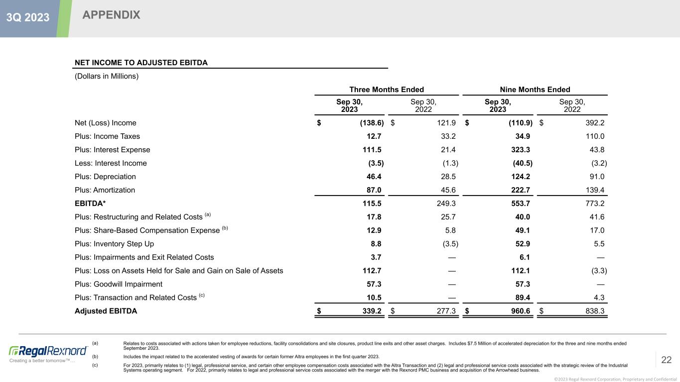©2023 Regal Rexnord Corporation, Proprietary and Confidential Creating a better tomorrow™… APPENDIX 21 3Q 2023 Nine Months Ended ADJUSTED EBITDA Industrial Powertrain Solutions Power Efficiency Solutions Automation & Motion Control Industrial Systems Total Regal Rexnord (Dollars in Millions) Sep 30, 2023 Sep 30, 2022 Sep 30, 2023 Sep 30, 2022 Sep 30, 2023 Sep 30, 2022 Sep 30, 2023 Sep 30, 2022 Sep 30, 2023 Sep 30, 2022 GAAP Income (Loss) from Operations $ 105.5 $ 187.0 $ 170.2 $ 261.3 $ 86.5 $ 53.8 $ (162.1) $ 36.6 $ 200.1 $ 538.7 Restructuring and Related Costs (a) 10.1 16.2 24.1 10.1 5.0 12.8 0.8 2.5 40.0 41.6 Inventory Step Up 38.7 3.0 — — 14.2 2.5 — — 52.9 5.5 Impairments and Exit Related Costs 1.6 — 1.5 — 2.6 — 0.4 — 6.1 — Loss on Assets Held for Sale and Gain on Sale of Assets — (2.6) — (0.7) (0.6) — 112.7 — 112.1 (3.3) Goodwill Impairment — — — — — — 57.3 — 57.3 — Transaction and Related Costs (b) 53.3 2.9 — — 29.2 1.4 6.9 — 89.4 4.3 Adjusted Income from Operations $ 209.2 $ 206.5 $ 195.8 $ 270.7 $ 136.9 $ 70.5 $ 16.0 $ 39.1 $ 557.9 $ 586.8 Amortization $ 132.0 $ 90.8 $ 6.3 $ 6.4 $ 83.8 $ 41.6 $ 0.6 $ 0.6 $ 222.7 $ 139.4 Depreciation 56.3 37.5 29.1 29.1 29.6 14.8 9.2 9.6 124.2 91.0 Share-Based Compensation Expense (c) 25.0 6.3 7.7 6.3 14.7 3.5 1.7 0.9 49.1 17.0 Other Income, Net 2.5 1.3 2.0 1.8 1.6 0.6 0.6 0.4 6.7 4.1 Adjusted EBITDA $ 425.0 $ 342.4 $ 240.9 $ 314.3 $ 266.6 $ 131.0 $ 28.1 $ 50.6 $ 960.6 $ 838.3 GAAP Operating Margin % 6.0% 14.9% 12.2% 15.1% 7.9% 9.4% (40.4)% 8.7% 4.3% 13.6% Adjusted Operating Margin % 11.9% 16.5% 14.1% 15.7% 12.5% 12.3% 4.0% 9.3% 12.0% 14.8% Adjusted EBITDA Margin % 24.2% 27.3% 17.3% 18.2% 24.3% 22.9% 7.0% 12.1% 20.7% 21.1% (a) Relates to costs associated with actions taken for employee reductions, facility consolidations and site closures, product line exits and other asset charges. Includes $7.5 Million of accelerated depreciation in 2023. (b) For 2023, primarily relates to (1) legal, professional service, and certain other employee compensation costs associated with the Altra Transaction and (2) legal and professional service costs associated with the strategic review of the Industrial Systems operating segment. For 2022, primarily relates to legal and professional service costs associated with the merger with the Rexnord PMC business and acquisition of the Arrowhead business. (c) Includes the impact related to the accelerated vesting of awards for certain former Altra employees in the first quarter 2023.