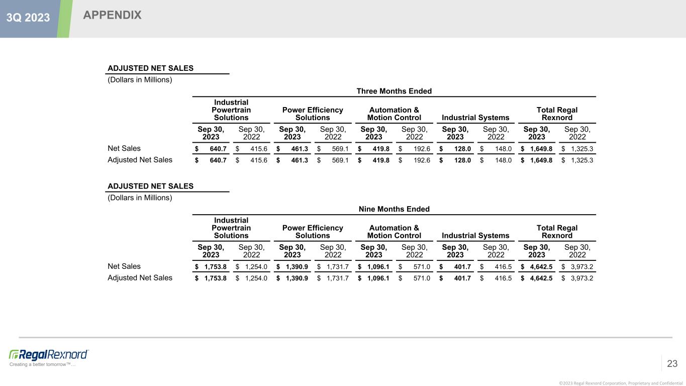 ©2023 Regal Rexnord Corporation, Proprietary and Confidential Creating a better tomorrow™… APPENDIX 23 3Q 2023 ADJUSTED NET SALES (Dollars in Millions) Three Months Ended Industrial Powertrain Solutions Power Efficiency Solutions Automation & Motion Control Industrial Systems Total Regal Rexnord Sep 30, 2023 Sep 30, 2022 Sep 30, 2023 Sep 30, 2022 Sep 30, 2023 Sep 30, 2022 Sep 30, 2023 Sep 30, 2022 Sep 30, 2023 Sep 30, 2022 Net Sales $ 640.7 $ 415.6 $ 461.3 $ 569.1 $ 419.8 $ 192.6 $ 128.0 $ 148.0 $ 1,649.8 $ 1,325.3 Adjusted Net Sales $ 640.7 $ 415.6 $ 461.3 $ 569.1 $ 419.8 $ 192.6 $ 128.0 $ 148.0 $ 1,649.8 $ 1,325.3 ADJUSTED NET SALES (Dollars in Millions) Nine Months Ended Industrial Powertrain Solutions Power Efficiency Solutions Automation & Motion Control Industrial Systems Total Regal Rexnord Sep 30, 2023 Sep 30, 2022 Sep 30, 2023 Sep 30, 2022 Sep 30, 2023 Sep 30, 2022 Sep 30, 2023 Sep 30, 2022 Sep 30, 2023 Sep 30, 2022 Net Sales $ 1,753.8 $ 1,254.0 $ 1,390.9 $ 1,731.7 $ 1,096.1 $ 571.0 $ 401.7 $ 416.5 $ 4,642.5 $ 3,973.2 Adjusted Net Sales $ 1,753.8 $ 1,254.0 $ 1,390.9 $ 1,731.7 $ 1,096.1 $ 571.0 $ 401.7 $ 416.5 $ 4,642.5 $ 3,973.2