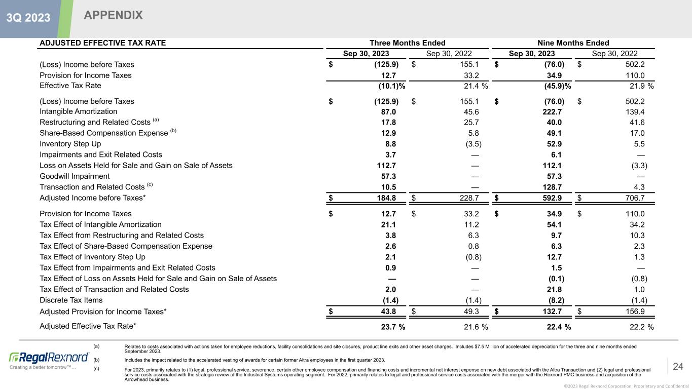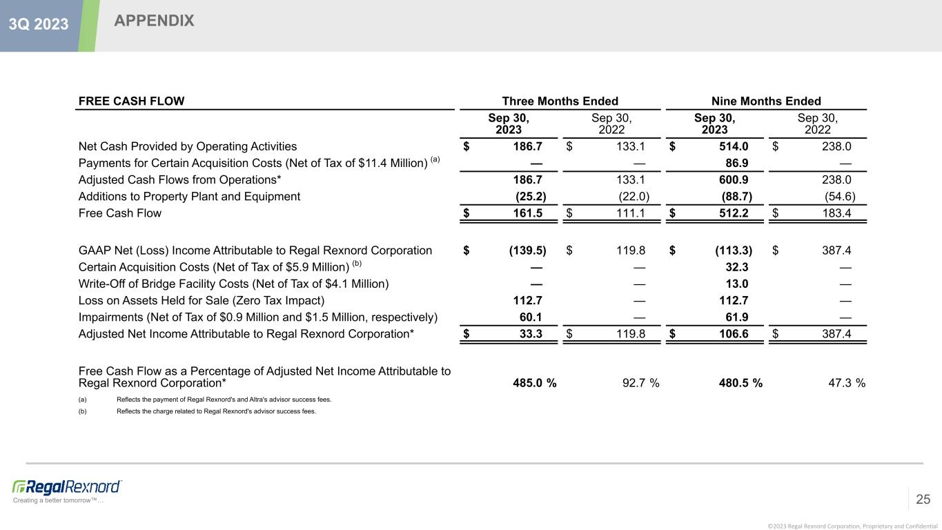 ©2023 Regal Rexnord Corporation, Proprietary and Confidential Creating a better tomorrow™… APPENDIX 24 3Q 2023 ADJUSTED EFFECTIVE TAX RATE Three Months Ended Nine Months Ended Sep 30, 2023 Sep 30, 2022 Sep 30, 2023 Sep 30, 2022 (Loss) Income before Taxes $ (125.9) $ 155.1 $ (76.0) $ 502.2 Provision for Income Taxes 12.7 33.2 34.9 110.0 Effective Tax Rate (10.1) % 21.4 % (45.9) % 21.9 % (Loss) Income before Taxes $ (125.9) $ 155.1 $ (76.0) $ 502.2 Intangible Amortization 87.0 45.6 222.7 139.4 Restructuring and Related Costs (a) 17.8 25.7 40.0 41.6 Share-Based Compensation Expense (b) 12.9 5.8 49.1 17.0 Inventory Step Up 8.8 (3.5) 52.9 5.5 Impairments and Exit Related Costs 3.7 — 6.1 — Loss on Assets Held for Sale and Gain on Sale of Assets 112.7 — 112.1 (3.3) Goodwill Impairment 57.3 — 57.3 — Transaction and Related Costs (c) 10.5 — 128.7 4.3 Adjusted Income before Taxes* $ 184.8 $ 228.7 $ 592.9 $ 706.7 Provision for Income Taxes $ 12.7 $ 33.2 $ 34.9 $ 110.0 Tax Effect of Intangible Amortization 21.1 11.2 54.1 34.2 Tax Effect from Restructuring and Related Costs 3.8 6.3 9.7 10.3 Tax Effect of Share-Based Compensation Expense 2.6 0.8 6.3 2.3 Tax Effect of Inventory Step Up 2.1 (0.8) 12.7 1.3 Tax Effect from Impairments and Exit Related Costs 0.9 — 1.5 — Tax Effect of Loss on Assets Held for Sale and Gain on Sale of Assets — — (0.1) (0.8) Tax Effect of Transaction and Related Costs 2.0 — 21.8 1.0 Discrete Tax Items (1.4) (1.4) (8.2) (1.4) Adjusted Provision for Income Taxes* $ 43.8 $ 49.3 $ 132.7 $ 156.9 Adjusted Effective Tax Rate* 23.7 % 21.6 % 22.4 % 22.2 % (a) Relates to costs associated with actions taken for employee reductions, facility consolidations and site closures, product line exits and other asset charges. Includes $7.5 Million of accelerated depreciation for the three and nine months ended September 2023. (b) Includes the impact related to the accelerated vesting of awards for certain former Altra employees in the first quarter 2023. (c) For 2023, primarily relates to (1) legal, professional service, severance, certain other employee compensation and financing costs and incremental net interest expense on new debt associated with the Altra Transaction and (2) legal and professional service costs associated with the strategic review of the Industrial Systems operating segment. For 2022, primarily relates to legal and professional service costs associated with the merger with the Rexnord PMC business and acquisition of the Arrowhead business.