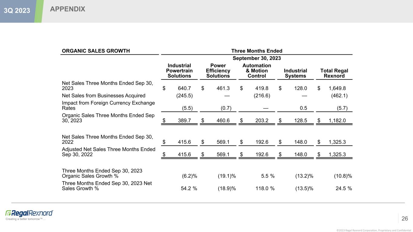 ©2023 Regal Rexnord Corporation, Proprietary and Confidential Creating a better tomorrow™… APPENDIX 26 3Q 2023 ORGANIC SALES GROWTH Three Months Ended September 30, 2023 Industrial Powertrain Solutions Power Efficiency Solutions Automation & Motion Control Industrial Systems Total Regal Rexnord Net Sales Three Months Ended Sep 30, 2023 $ 640.7 $ 461.3 $ 419.8 $ 128.0 $ 1,649.8 Net Sales from Businesses Acquired (245.5) — (216.6) — (462.1) Impact from Foreign Currency Exchange Rates (5.5) (0.7) — 0.5 (5.7) Organic Sales Three Months Ended Sep 30, 2023 $ 389.7 $ 460.6 $ 203.2 $ 128.5 $ 1,182.0 Net Sales Three Months Ended Sep 30, 2022 $ 415.6 $ 569.1 $ 192.6 $ 148.0 $ 1,325.3 Adjusted Net Sales Three Months Ended Sep 30, 2022 $ 415.6 $ 569.1 $ 192.6 $ 148.0 $ 1,325.3 Three Months Ended Sep 30, 2023 Organic Sales Growth % (6.2) % (19.1) % 5.5 % (13.2) % (10.8) % Three Months Ended Sep 30, 2023 Net Sales Growth % 54.2 % (18.9) % 118.0 % (13.5) % 24.5 %