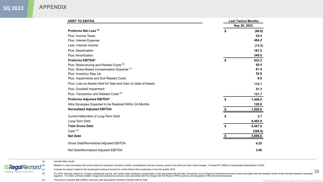 ©2023 Regal Rexnord Corporation, Proprietary and Confidential Creating a better tomorrow™… APPENDIX 28 3Q 2023 DEBT TO EBITDA Last Twelve Months Sep 30, 2023 Proforma Net Loss (a) $ (98.6) Plus: Income Taxes 25.4 Plus: Interest Expense 484.2 Less: Interest Income (13.3) Plus: Depreciation 187.5 Plus: Amortization 348.0 Proforma EBITDA* $ 933.2 Plus: Restructuring and Related Costs (b) 60.5 Plus: Share-Based Compensation Expense (c) 61.4 Plus: Inventory Step Up 52.9 Plus: Impairments and Exit Related Costs 8.9 Plus: Loss on Assets Held for Sale and Gain on Sale of Assets 112.1 Plus: Goodwill Impairment 57.3 Plus: Transaction and Related Costs (d) 121.7 Proforma Adjusted EBITDA* $ 1,408.0 Altra Synergies Expected to be Realized Within 24 Months 120.0 Normalized Adjusted EBITDA $ 1,528.0 Current Maturities of Long-Term Debt $ 3.7 Long-Term Debt 6,493.9 Total Gross Debt $ 6,497.6 Cash (e) (598.8) Net Debt $ 5,898.8 Gross Debt/Normalized Adjusted EBITDA 4.25 Net Debt/Normalized Adjusted EBITDA 3.86 (a) Includes Altra results. (b) Relates to costs associated with actions taken for employee reductions, facility consolidations and site closures, product line exits and other asset charges. Includes $7.5 Million of accelerated depreciation in 2023. (c) Includes the impact related to the accelerated vesting of awards for certain former Altra employees in the first quarter 2023. (d) For 2023, primarily relates to (1) legal, professional service, and certain other employee compensation costs associated with the Altra Transaction and (2) legal and professional service costs associated with the strategic review of the Industrial Systems operating segment. For 2022, primarily relates to legal and professional service costs associated with the merger with the Rexnord PMC business and acquisition of the Arrowhead business. (e) This amount includes $58.2 Million cash and cash equivalents included in Assets Held for Sale.