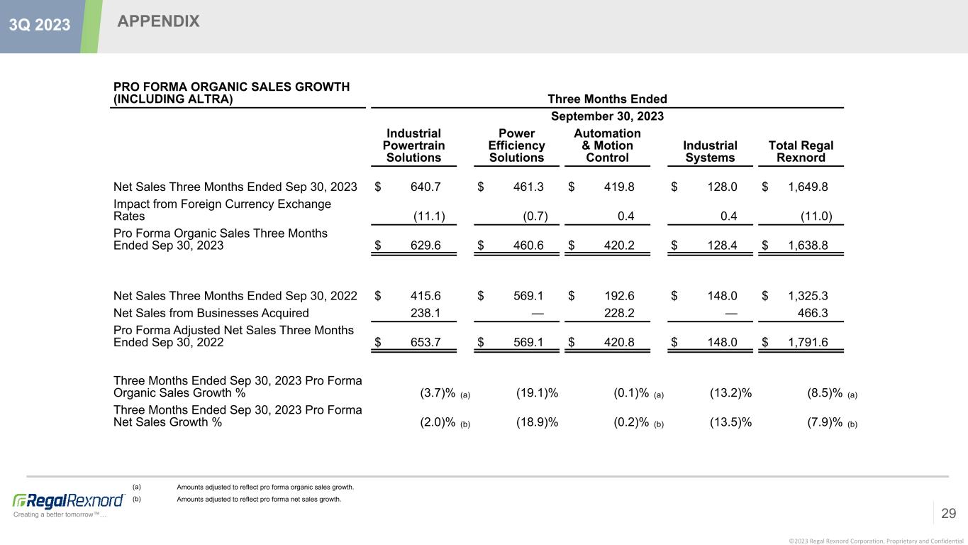 ©2023 Regal Rexnord Corporation, Proprietary and Confidential Creating a better tomorrow™… APPENDIX 27 3Q 2023 ORGANIC SALES GROWTH Nine Months Ended September 30, 2023 Industrial Powertrain Solutions Power Efficiency Solutions Automation & Motion Control Industrial Systems Total Regal Rexnord Net Sales Nine Months Ended Sep 30, 2023 $ 1,753.8 $ 1,390.9 $ 1,096.1 $ 401.7 $ 4,642.5 Net Sales from Businesses Acquired (529.6) — (483.9) — (1,013.5) Impact from Foreign Currency Exchange Rates 3.4 10.2 4.2 7.4 25.2 Organic Sales Nine Months Ended Sep 30, 2023 $ 1,227.6 $ 1,401.1 $ 616.4 $ 409.1 $ 3,654.2 Net Sales Nine Months Ended Sep 30, 2022 $ 1,254.0 $ 1,731.7 $ 571.0 $ 416.5 $ 3,973.2 Adjusted Net Sales Nine Months Ended Sep 30, 2022 $ 1,254.0 $ 1,731.7 $ 571.0 $ 416.5 $ 3,973.2 Nine Months Ended Sep 30, 2023 Organic Sales Growth % (2.1) % (19.1) % 8.0 % (1.8) % (8.0) % Nine Months Ended Sep 30, 2023 Net Sales Growth % 39.9 % (19.7) % 92.0 % (3.6) % 16.8 %