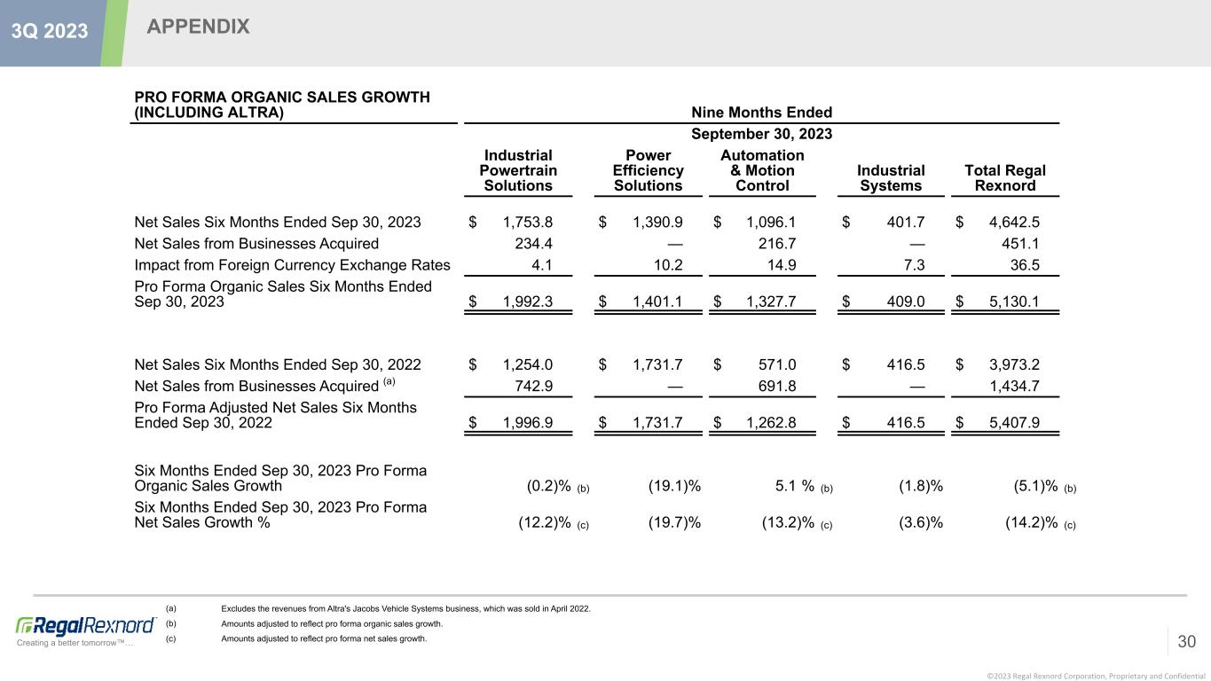 ©2023 Regal Rexnord Corporation, Proprietary and Confidential Creating a better tomorrow™… APPENDIX 29 3Q 2023 PRO FORMA ORGANIC SALES GROWTH (INCLUDING ALTRA) Three Months Ended September 30, 2023 Industrial Powertrain Solutions Power Efficiency Solutions Automation & Motion Control Industrial Systems Total Regal Rexnord Net Sales Three Months Ended Sep 30, 2023 $ 640.7 $ 461.3 $ 419.8 $ 128.0 $ 1,649.8 Impact from Foreign Currency Exchange Rates (11.1) (0.7) 0.4 0.4 (11.0) Pro Forma Organic Sales Three Months Ended Sep 30, 2023 $ 629.6 $ 460.6 $ 420.2 $ 128.4 $ 1,638.8 Net Sales Three Months Ended Sep 30, 2022 $ 415.6 $ 569.1 $ 192.6 $ 148.0 $ 1,325.3 Net Sales from Businesses Acquired 238.1 — 228.2 — 466.3 Pro Forma Adjusted Net Sales Three Months Ended Sep 30, 2022 $ 653.7 $ 569.1 $ 420.8 $ 148.0 $ 1,791.6 Three Months Ended Sep 30, 2023 Pro Forma Organic Sales Growth % (3.7) % (a) (19.1) % (0.1) % (a) (13.2) % (8.5) % (a) Three Months Ended Sep 30, 2023 Pro Forma Net Sales Growth % (2.0) % (b) (18.9) % (0.2) % (b) (13.5) % (7.9) % (b) (a) Amounts adjusted to reflect pro forma organic sales growth. (b) Amounts adjusted to reflect pro forma net sales growth.