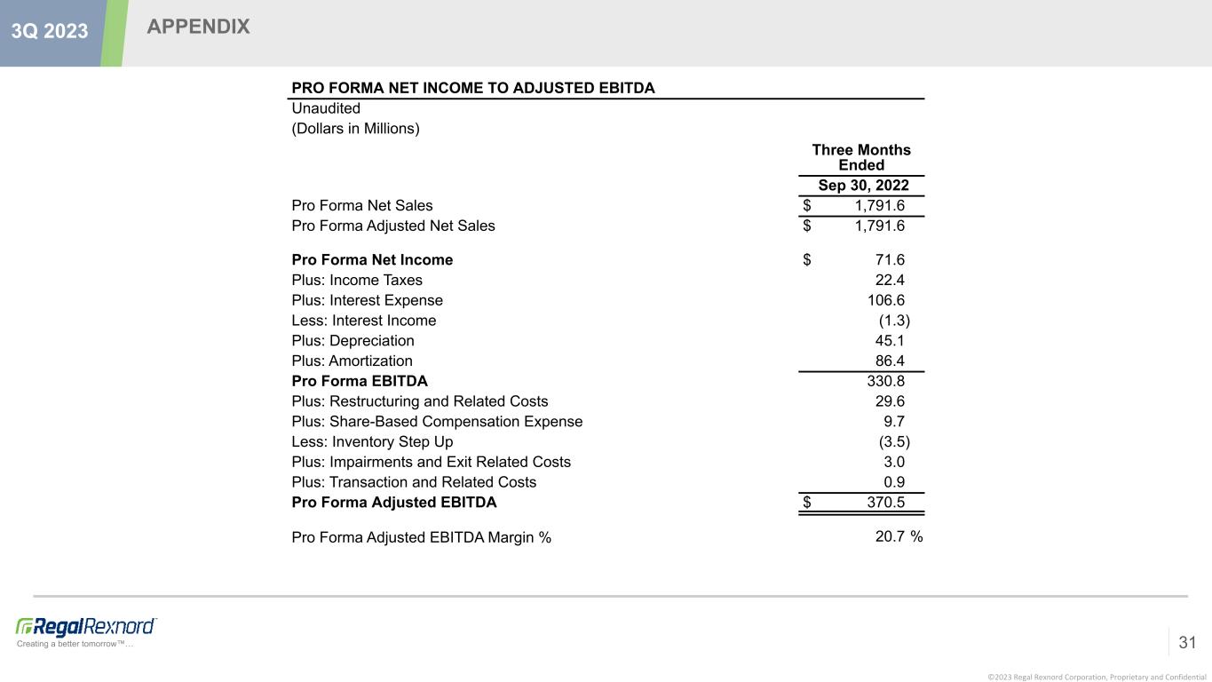 ©2023 Regal Rexnord Corporation, Proprietary and Confidential Creating a better tomorrow™… APPENDIX 30 3Q 2023 PRO FORMA ORGANIC SALES GROWTH (INCLUDING ALTRA) Nine Months Ended September 30, 2023 Industrial Powertrain Solutions Power Efficiency Solutions Automation & Motion Control Industrial Systems Total Regal Rexnord Net Sales Six Months Ended Sep 30, 2023 $ 1,753.8 $ 1,390.9 $ 1,096.1 $ 401.7 $ 4,642.5 Net Sales from Businesses Acquired 234.4 — 216.7 — 451.1 Impact from Foreign Currency Exchange Rates 4.1 10.2 14.9 7.3 36.5 Pro Forma Organic Sales Six Months Ended Sep 30, 2023 $ 1,992.3 $ 1,401.1 $ 1,327.7 $ 409.0 $ 5,130.1 Net Sales Six Months Ended Sep 30, 2022 $ 1,254.0 $ 1,731.7 $ 571.0 $ 416.5 $ 3,973.2 Net Sales from Businesses Acquired (a) 742.9 — 691.8 — 1,434.7 Pro Forma Adjusted Net Sales Six Months Ended Sep 30, 2022 $ 1,996.9 $ 1,731.7 $ 1,262.8 $ 416.5 $ 5,407.9 Six Months Ended Sep 30, 2023 Pro Forma Organic Sales Growth (0.2) % (b) (19.1) % 5.1 % (b) (1.8) % (5.1) % (b) Six Months Ended Sep 30, 2023 Pro Forma Net Sales Growth % (12.2) % (c) (19.7) % (13.2) % (c) (3.6) % (14.2) % (c) (a) Excludes the revenues from Altra's Jacobs Vehicle Systems business, which was sold in April 2022. (b) Amounts adjusted to reflect pro forma organic sales growth. (c) Amounts adjusted to reflect pro forma net sales growth.