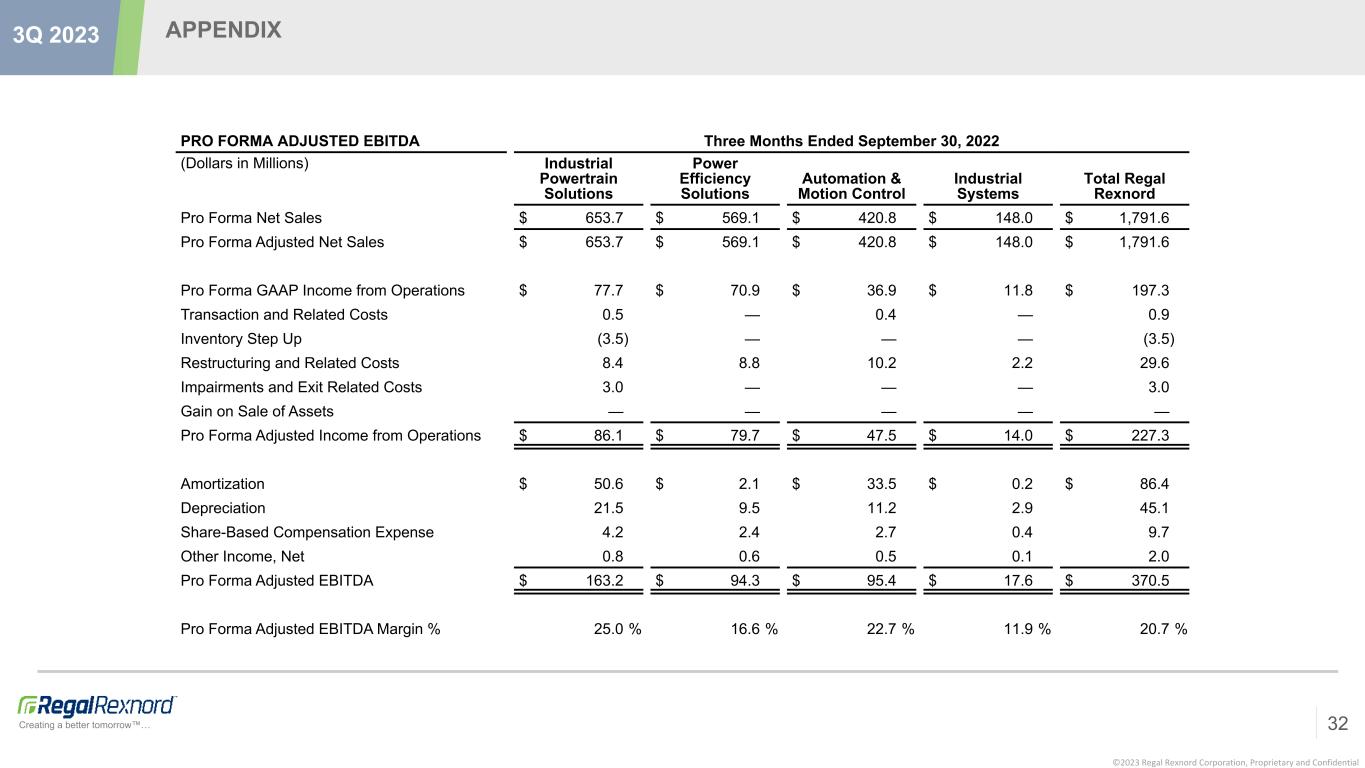 ©2023 Regal Rexnord Corporation, Proprietary and Confidential Creating a better tomorrow™… APPENDIX 32 3Q 2023 PRO FORMA ADJUSTED EBITDA Three Months Ended September 30, 2022 (Dollars in Millions) Industrial Powertrain Solutions Power Efficiency Solutions Automation & Motion Control Industrial Systems Total Regal Rexnord Pro Forma Net Sales $ 653.7 $ 569.1 $ 420.8 $ 148.0 $ 1,791.6 Pro Forma Adjusted Net Sales $ 653.7 $ 569.1 $ 420.8 $ 148.0 $ 1,791.6 Pro Forma GAAP Income from Operations $ 77.7 $ 70.9 $ 36.9 $ 11.8 $ 197.3 Transaction and Related Costs 0.5 — 0.4 — 0.9 Inventory Step Up (3.5) — — — (3.5) Restructuring and Related Costs 8.4 8.8 10.2 2.2 29.6 Impairments and Exit Related Costs 3.0 — — — 3.0 Gain on Sale of Assets — — — — — Pro Forma Adjusted Income from Operations $ 86.1 $ 79.7 $ 47.5 $ 14.0 $ 227.3 Amortization $ 50.6 $ 2.1 $ 33.5 $ 0.2 $ 86.4 Depreciation 21.5 9.5 11.2 2.9 45.1 Share-Based Compensation Expense 4.2 2.4 2.7 0.4 9.7 Other Income, Net 0.8 0.6 0.5 0.1 2.0 Pro Forma Adjusted EBITDA $ 163.2 $ 94.3 $ 95.4 $ 17.6 $ 370.5 Pro Forma Adjusted EBITDA Margin % 25.0 % 16.6 % 22.7 % 11.9 % 20.7 %