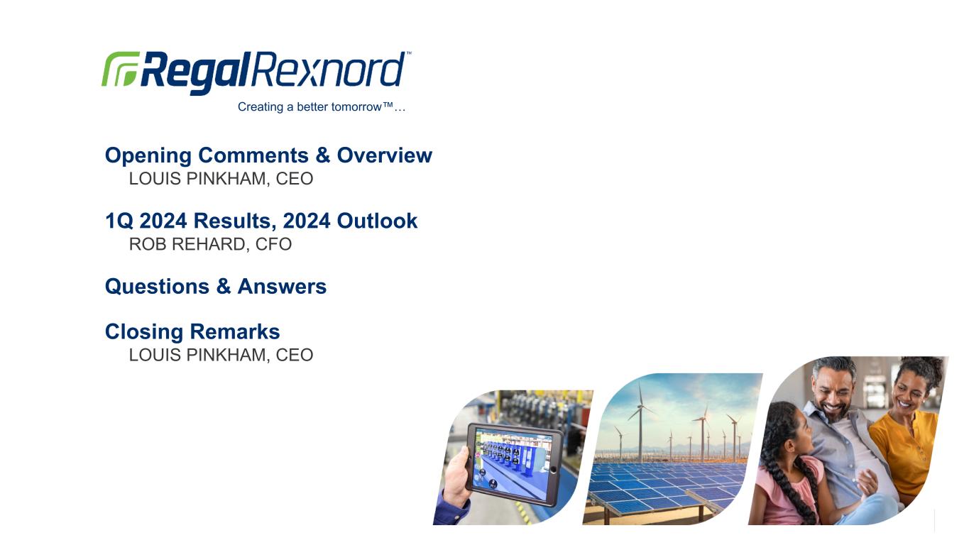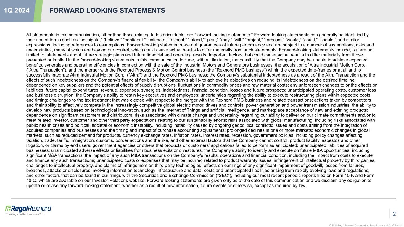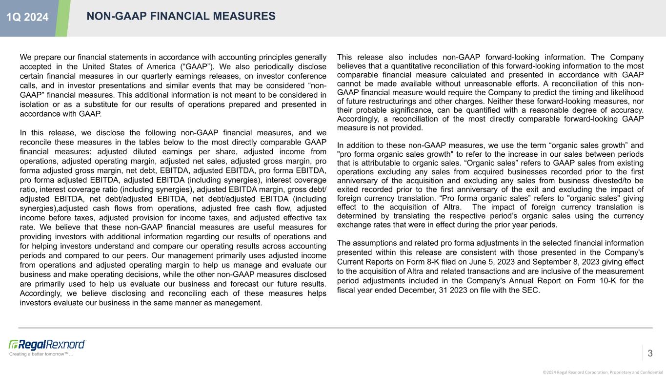 ©2024 Regal Rexnord Corporation, Proprietary and Confidential Creating a better tomorrow™… 1Q 2024 FORWARD LOOKING STATEMENTS 2 All statements in this communication, other than those relating to historical facts, are "forward-looking statements." Forward-looking statements can generally be identified by their use of terms such as “anticipate,” “believe,” “confident,” “estimate,” “expect,” “intend,” “plan,” “may,” “will,” “project,” “forecast,” “would,” “could,” “should,” and similar expressions, including references to assumptions. Forward-looking statements are not guarantees of future performance and are subject to a number of assumptions, risks and uncertainties, many of which are beyond our control, which could cause actual results to differ materially from such statements. Forward-looking statements include, but are not limited to, statements about future strategic plans and future financial and operating results. Important factors that could cause actual results to differ materially from those presented or implied in the forward-looking statements in this communication include, without limitation, the possibility that the Company may be unable to achieve expected benefits, synergies and operating efficiencies in connection with the sale of the Industrial Motors and Generators businesses, the acquisition of Altra Industrial Motion Corp. ("Altra Transaction"), and the merger with the Rexnord Process & Motion Control business (the “Rexnord PMC business”) within the expected time-frames or at all and to successfully integrate Altra Industrial Motion Corp. ("Altra") and the Rexnord PMC business; the Company's substantial indebtedness as a result of the Altra Transaction and the effects of such indebtedness on the Company's financial flexibility; the Company's ability to achieve its objectives on reducing its indebtedness on the desired timeline; dependence on key suppliers and the potential effects of supply disruptions; fluctuations in commodity prices and raw material costs; any unforeseen changes to or the effects on liabilities, future capital expenditures, revenue, expenses, synergies, indebtedness, financial condition, losses and future prospects; unanticipated operating costs, customer loss and business disruption; the Company's ability to retain key executives and employees; uncertainties regarding the ability to execute restructuring plans within expected costs and timing; challenges to the tax treatment that was elected with respect to the merger with the Rexnord PMC business and related transactions; actions taken by competitors and their ability to effectively compete in the increasingly competitive global electric motor, drives and controls, power generation and power transmission industries; the ability to develop new products based on technological innovation, such as the Internet of Things and artificial intelligence, and marketplace acceptance of new and existing products; dependence on significant customers and distributors; risks associated with climate change and uncertainty regarding our ability to deliver on our climate commitments and/or to meet related investor, customer and other third party expectations relating to our sustainability efforts; risks associated with global manufacturing, including risks associated with public health crises and political, societal or economic instability, including instability caused by ongoing geopolitical conflicts; issues and costs arising from the integration of acquired companies and businesses and the timing and impact of purchase accounting adjustments; prolonged declines in one or more markets; economic changes in global markets, such as reduced demand for products, currency exchange rates, inflation rates, interest rates, recession, government policies, including policy changes affecting taxation, trade, tariffs, immigration, customs, border actions and the like, and other external factors that the Company cannot control; product liability, asbestos and other litigation, or claims by end users, government agencies or others that products or customers’ applications failed to perform as anticipated; unanticipated liabilities of acquired businesses; unanticipated adverse effects or liabilities from business exits or divestitures; the Company's ability to identify and execute on future M&A opportunities, including significant M&A transactions; the impact of any such M&A transactions on the Company's results, operations and financial condition, including the impact from costs to execute and finance any such transactions; unanticipated costs or expenses that may be incurred related to product warranty issues; infringement of intellectual property by third parties, challenges to intellectual property, and claims of infringement on third party technologies; effects on earnings of any significant impairment of goodwill; losses from failures, breaches, attacks or disclosures involving information technology infrastructure and data; costs and unanticipated liabilities arising from rapidly evolving laws and regulations; and other factors that can be found in our filings with the Securities and Exchange Commission ("SEC"), including our most recent periodic reports filed on Form 10-K and Form 10-Q, which are available on our Investor Relations website. Forward-looking statements are given only as of the date of this communication and we disclaim any obligation to update or revise any forward-looking statement, whether as a result of new information, future events or otherwise, except as required by law.