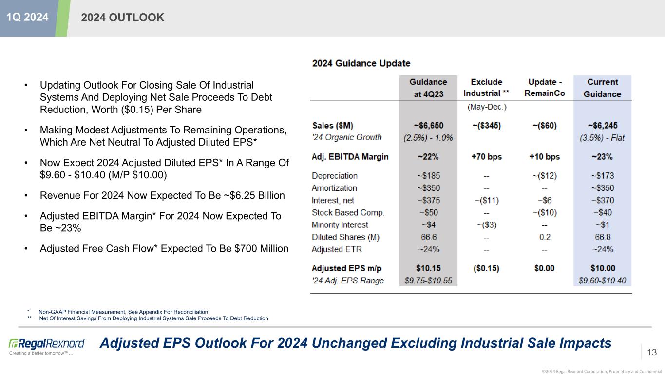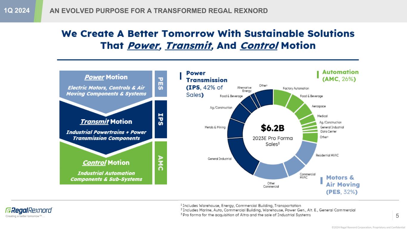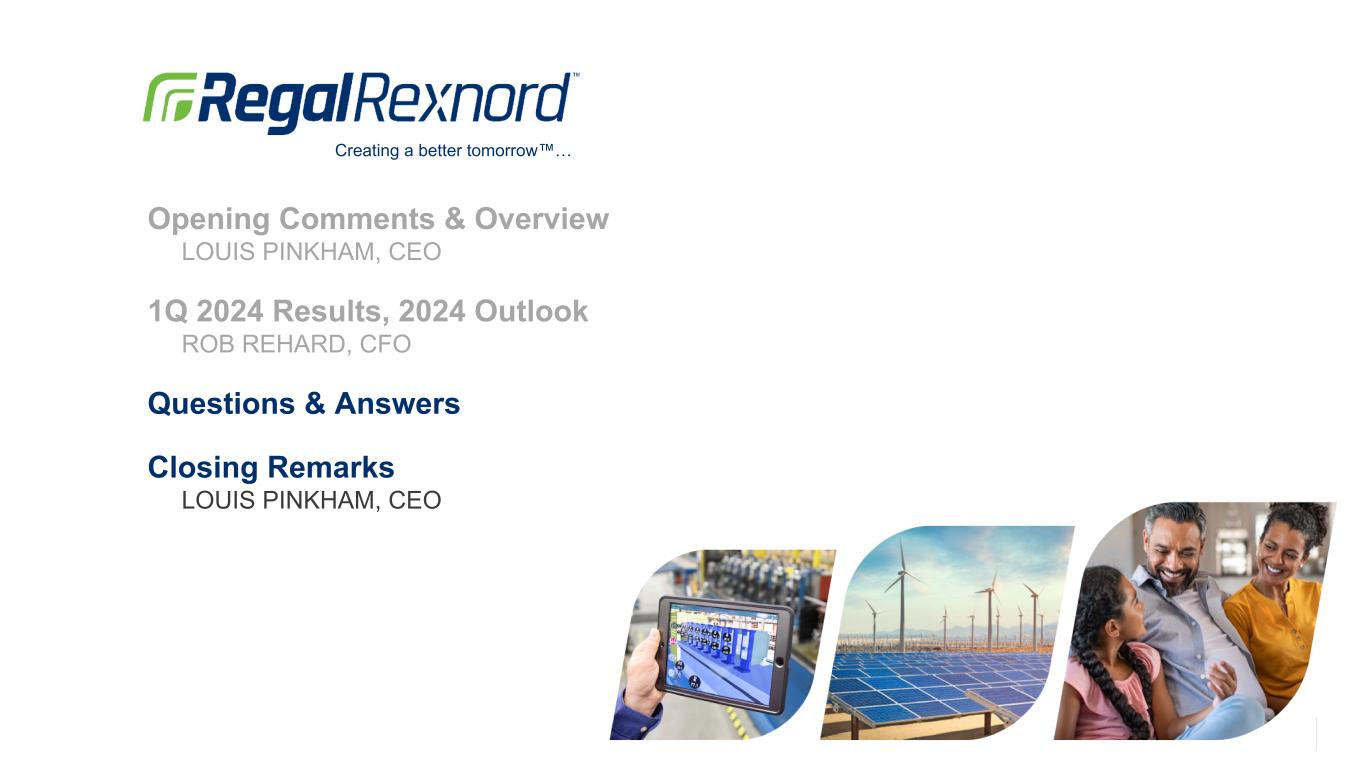 ©2024 Regal Rexnord Corporation, Proprietary and Confidential Creating a better tomorrow™… 1Q 2024 FORWARD LOOKING STATEMENTS 2 All statements in this communication, other than those relating to historical facts, are "forward-looking statements." Forward-looking statements can generally be identified by their use of terms such as “anticipate,” “believe,” “confident,” “estimate,” “expect,” “intend,” “plan,” “may,” “will,” “project,” “forecast,” “would,” “could,” “should,” and similar expressions, including references to assumptions. Forward-looking statements are not guarantees of future performance and are subject to a number of assumptions, risks and uncertainties, many of which are beyond our control, which could cause actual results to differ materially from such statements. Forward-looking statements include, but are not limited to, statements about future strategic plans and future financial and operating results. Important factors that could cause actual results to differ materially from those presented or implied in the forward-looking statements in this communication include, without limitation, the possibility that the Company may be unable to achieve expected benefits, synergies and operating efficiencies in connection with the sale of the Industrial Motors and Generators businesses, the acquisition of Altra Industrial Motion Corp. ("Altra Transaction"), and the merger with the Rexnord Process & Motion Control business (the “Rexnord PMC business”) within the expected time-frames or at all and to successfully integrate Altra Industrial Motion Corp. ("Altra") and the Rexnord PMC business; the Company's substantial indebtedness as a result of the Altra Transaction and the effects of such indebtedness on the Company's financial flexibility; the Company's ability to achieve its objectives on reducing its indebtedness on the desired timeline; dependence on key suppliers and the potential effects of supply disruptions; fluctuations in commodity prices and raw material costs; any unforeseen changes to or the effects on liabilities, future capital expenditures, revenue, expenses, synergies, indebtedness, financial condition, losses and future prospects; unanticipated operating costs, customer loss and business disruption; the Company's ability to retain key executives and employees; uncertainties regarding the ability to execute restructuring plans within expected costs and timing; challenges to the tax treatment that was elected with respect to the merger with the Rexnord PMC business and related transactions; actions taken by competitors and their ability to effectively compete in the increasingly competitive global electric motor, drives and controls, power generation and power transmission industries; the ability to develop new products based on technological innovation, such as the Internet of Things and artificial intelligence, and marketplace acceptance of new and existing products; dependence on significant customers and distributors; risks associated with climate change and uncertainty regarding our ability to deliver on our climate commitments and/or to meet related investor, customer and other third party expectations relating to our sustainability efforts; risks associated with global manufacturing, including risks associated with public health crises and political, societal or economic instability, including instability caused by ongoing geopolitical conflicts; issues and costs arising from the integration of acquired companies and businesses and the timing and impact of purchase accounting adjustments; prolonged declines in one or more markets; economic changes in global markets, such as reduced demand for products, currency exchange rates, inflation rates, interest rates, recession, government policies, including policy changes affecting taxation, trade, tariffs, immigration, customs, border actions and the like, and other external factors that the Company cannot control; product liability, asbestos and other litigation, or claims by end users, government agencies or others that products or customers’ applications failed to perform as anticipated; unanticipated liabilities of acquired businesses; unanticipated adverse effects or liabilities from business exits or divestitures; the Company's ability to identify and execute on future M&A opportunities, including significant M&A transactions; the impact of any such M&A transactions on the Company's results, operations and financial condition, including the impact from costs to execute and finance any such transactions; unanticipated costs or expenses that may be incurred related to product warranty issues; infringement of intellectual property by third parties, challenges to intellectual property, and claims of infringement on third party technologies; effects on earnings of any significant impairment of goodwill; losses from failures, breaches, attacks or disclosures involving information technology infrastructure and data; costs and unanticipated liabilities arising from rapidly evolving laws and regulations; and other factors that can be found in our filings with the Securities and Exchange Commission ("SEC"), including our most recent periodic reports filed on Form 10-K and Form 10-Q, which are available on our Investor Relations website. Forward-looking statements are given only as of the date of this communication and we disclaim any obligation to update or revise any forward-looking statement, whether as a result of new information, future events or otherwise, except as required by law.